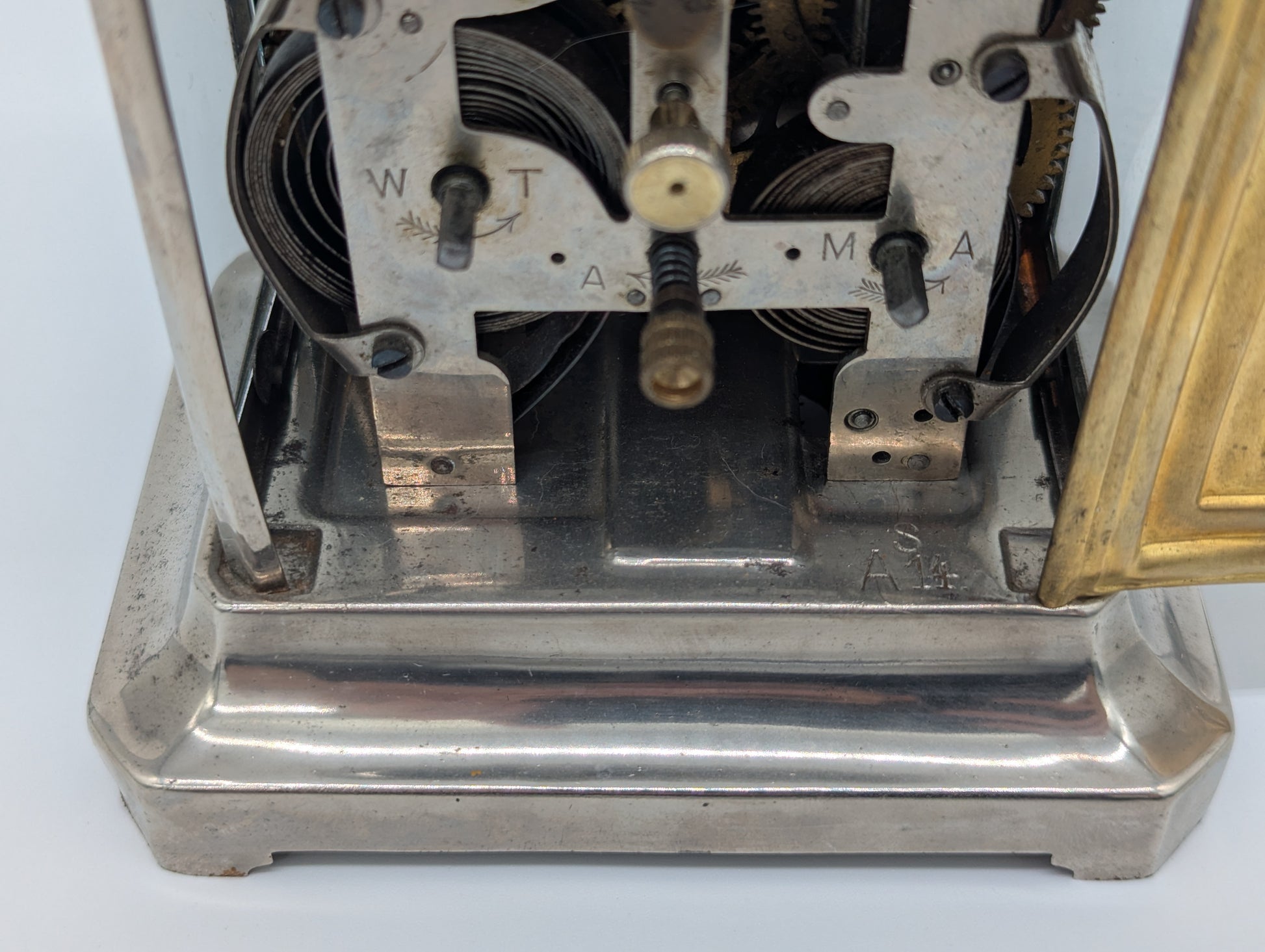 Ein besonderes Detail ist die Unterseite der Uhr: Dort ist ein separates Mechanikteil integriert, das für die Weck- und Schlagfunktion zuständig ist. Damit ertönt ein Glockenschlag als Wecksignal.