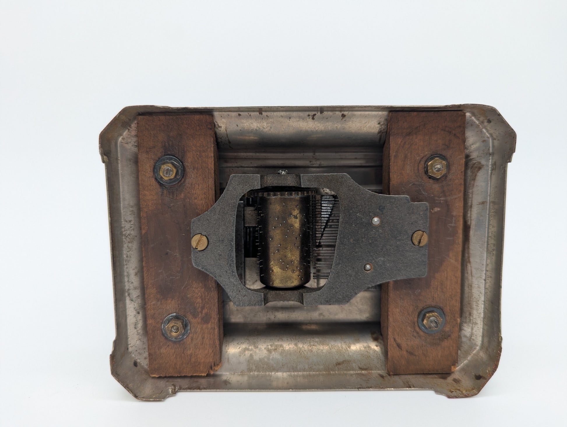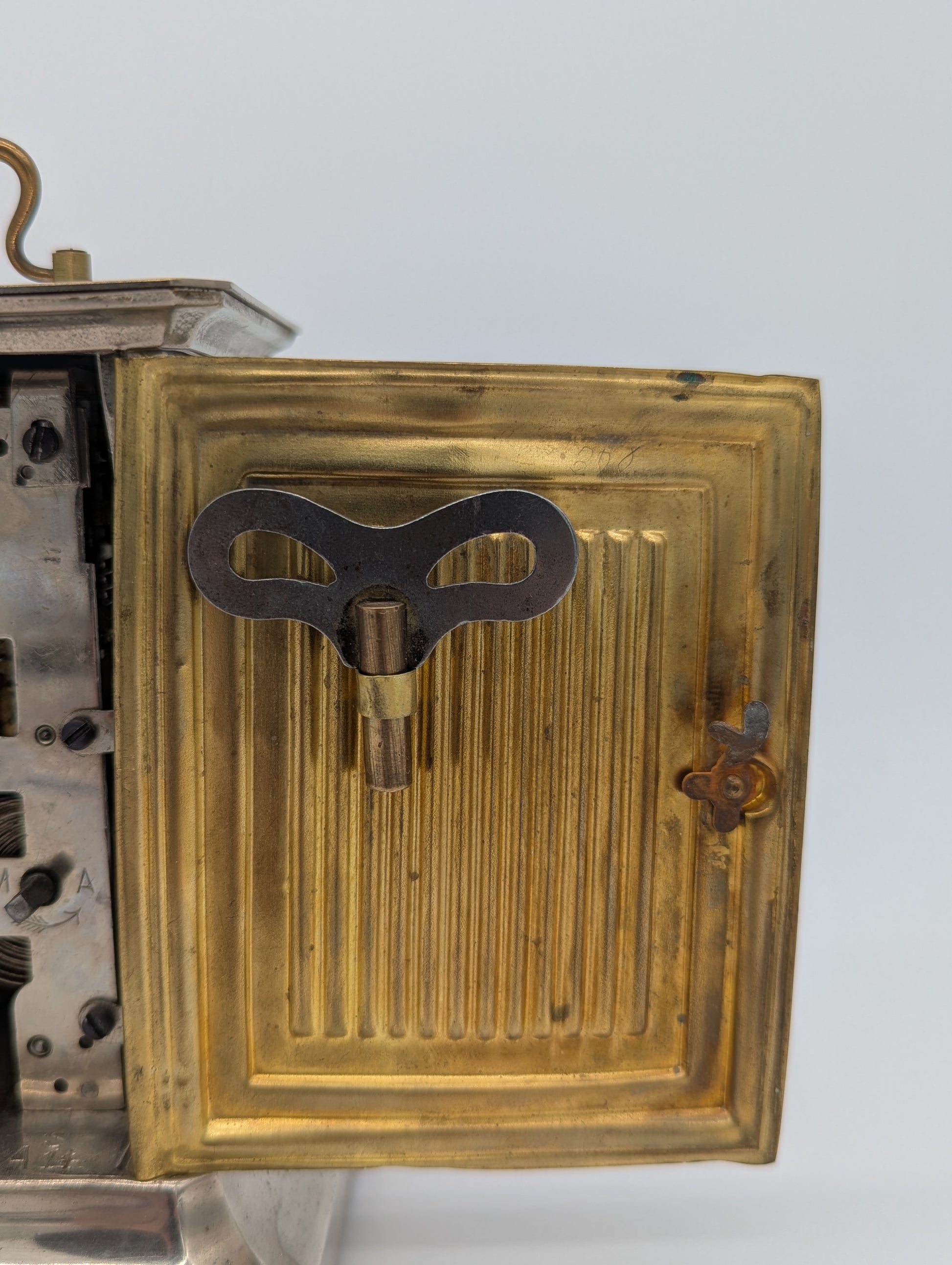 Auf der Rückseite befindet sich das originale mechanische Junghans-Uhrwerk mit Federaufzug, das zuverlässig arbeitet. Der originale Aufzugsschlüssel ist ebenfalls vorhanden und wird mitgeliefert.