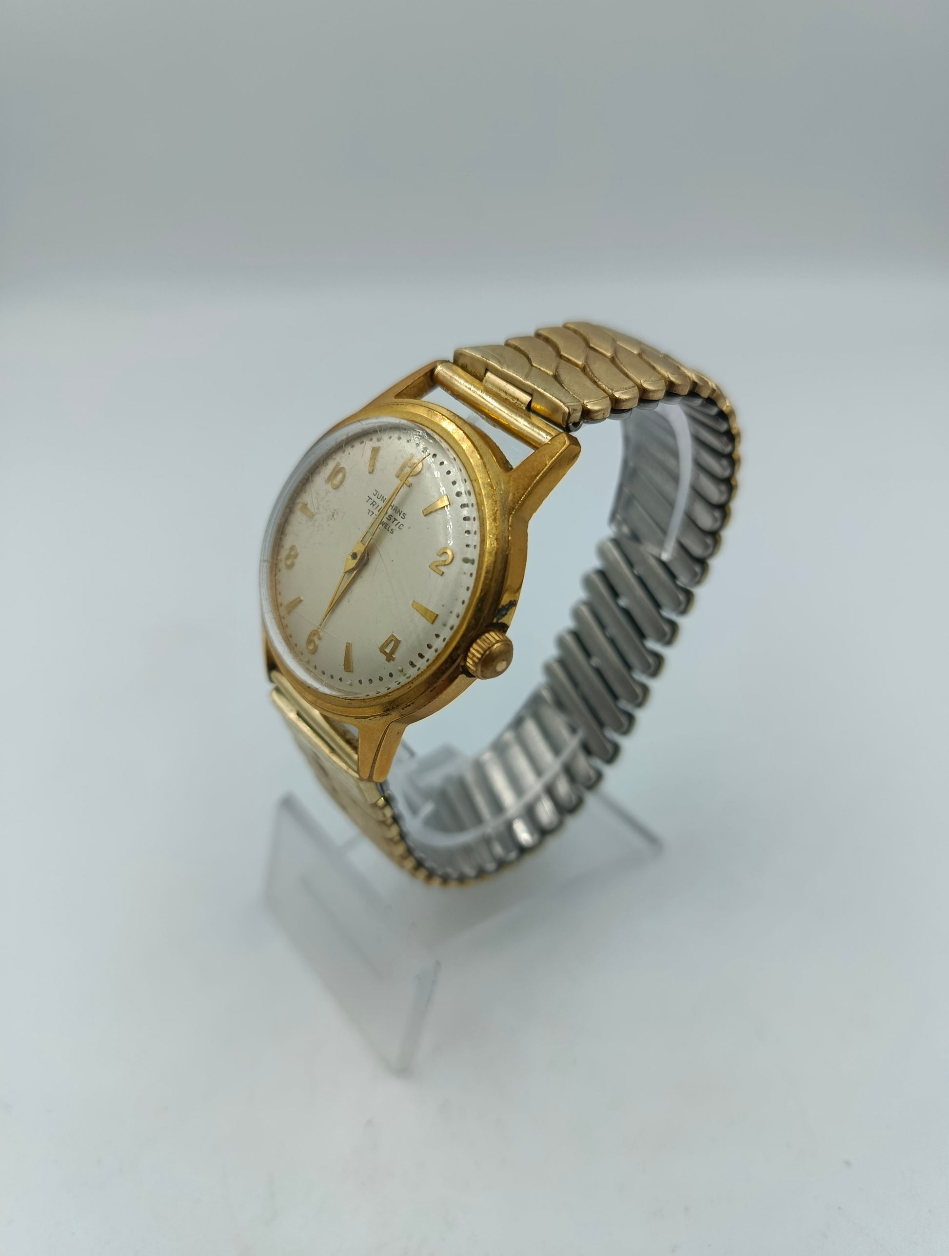 Klassische Junghans Herrenarmbanduhr im eleganten Vintage-Stil. Das Modell Trilastic mit 17 Jewels besticht durch sein schlichtes, zeitloses Design und das goldfarbene Gehäuse. Das elastische Metallarmband sorgt für angenehmen Tragekomfort und eine stilvolle Optik.