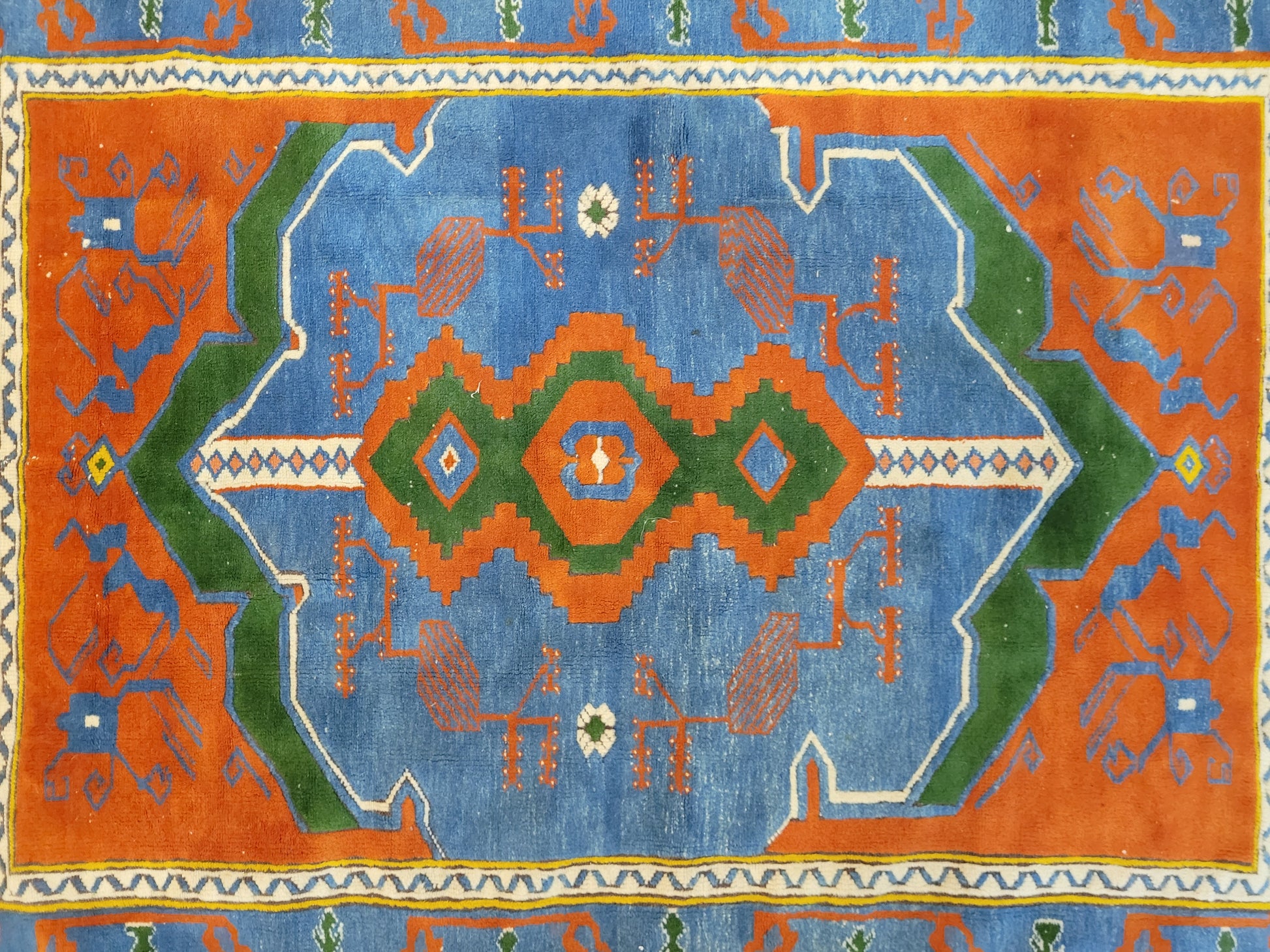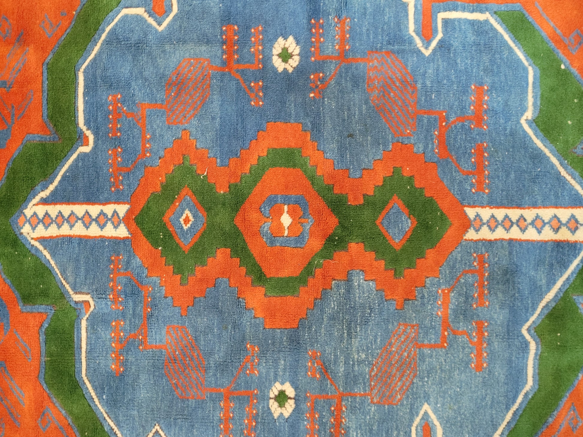 hier präsentieren wir einen charakterstarken Kazak Teppich, handgeknüpft aus reiner Wolle. Das kräftige Farbspiel mit intensivem Blau, Rot und Grün verleiht diesem Stück eine besondere Ausstrahlung. Im Zentrum steht ein markantes, geometrisches Medaillon, umgeben von stilisierten Ranken- und Symbolmustern – typisch für die traditionsreiche Knüpfkunst dieser Teppiche.