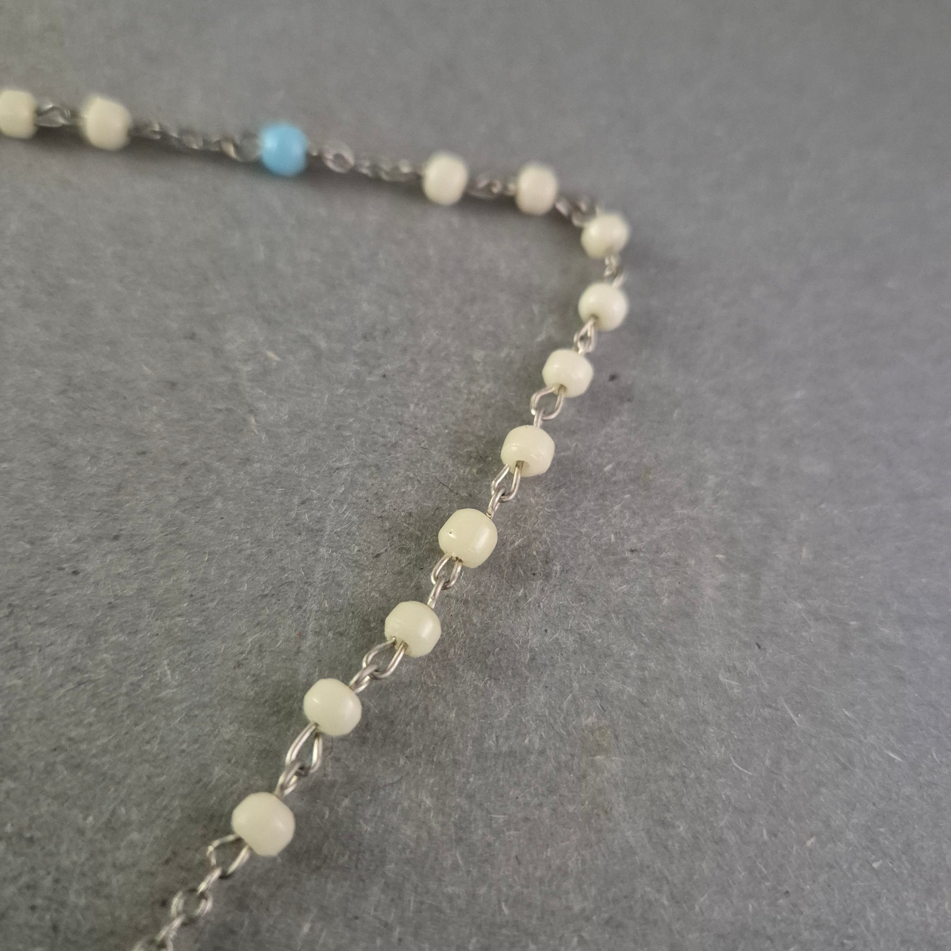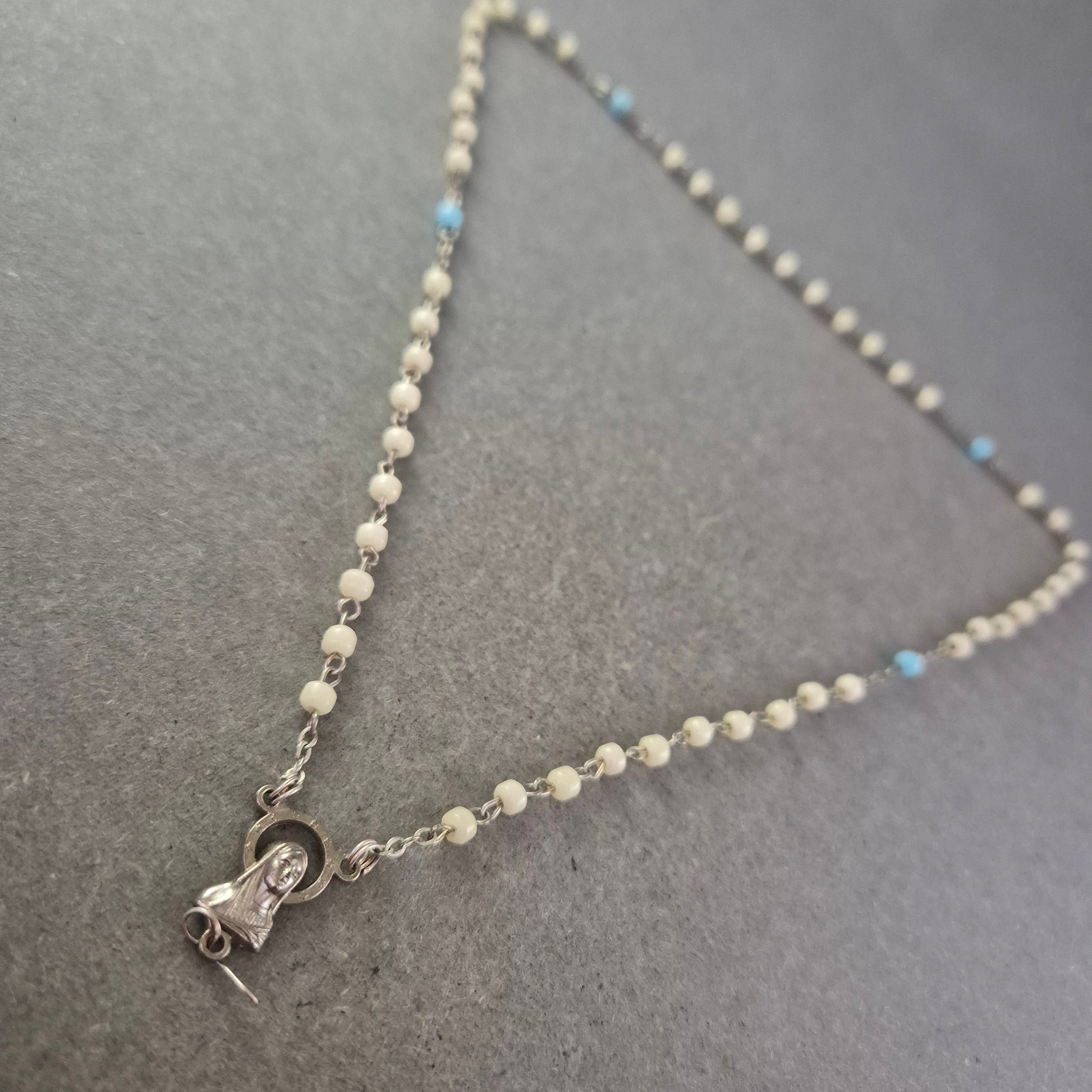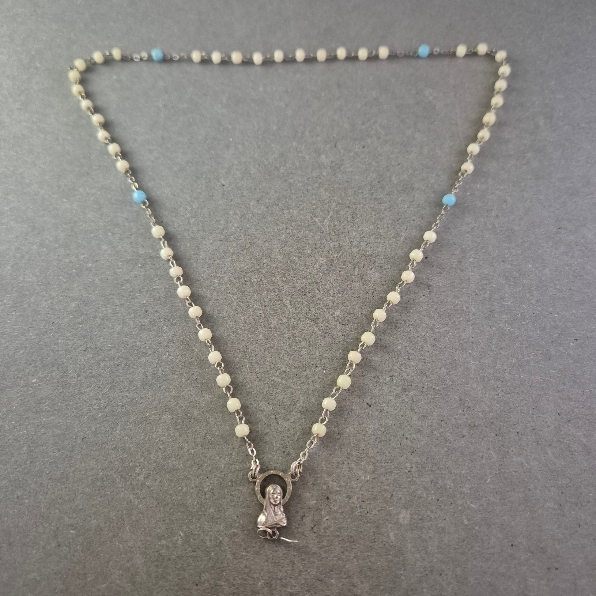 Diese Rosenkranz Halskette ist ein traditionelles Schmuckstück mit religiöser Symbolik. Sie besteht aus cremefarbenen Perlen, die durch kleine silberfarbene Glieder verbunden sind. Vereinzelte türkisfarbene Akzente verleihen der Kette eine besondere Note. Im Zentrum befindet sich ein silberfarbener Anhänger mit der Darstellung der Jungfrau Maria – ideal für Gläubige oder als spirituelles Geschenk.