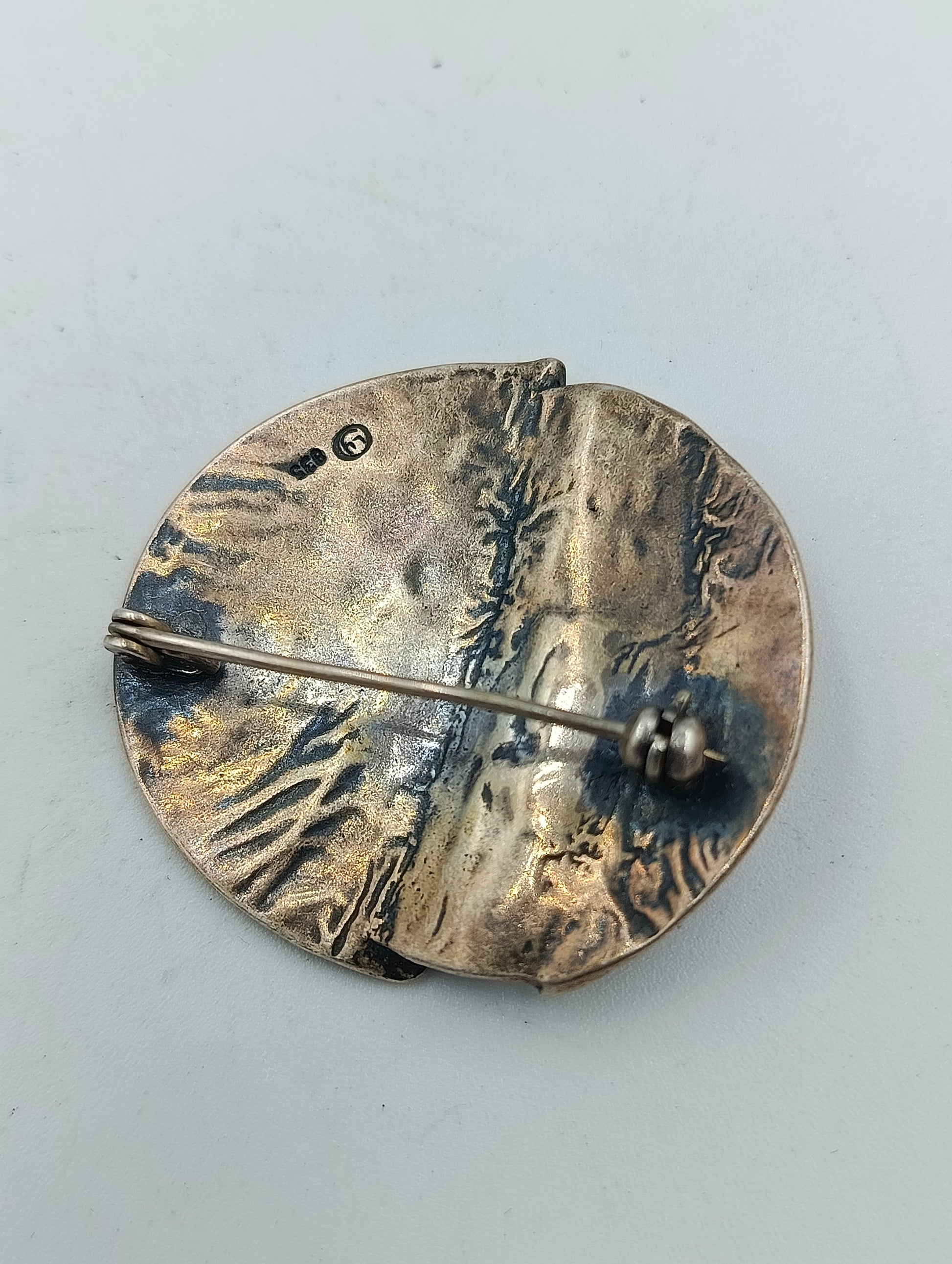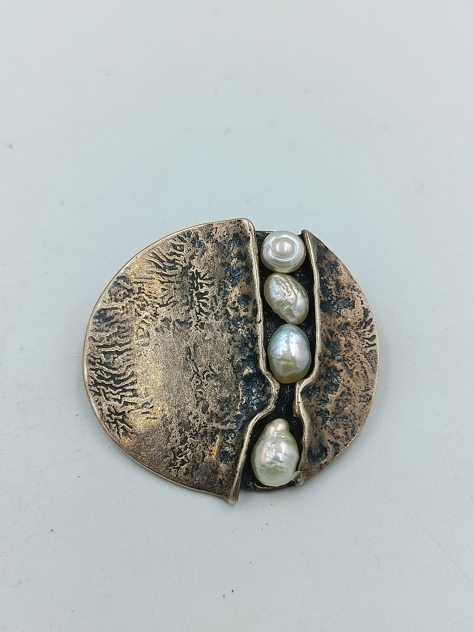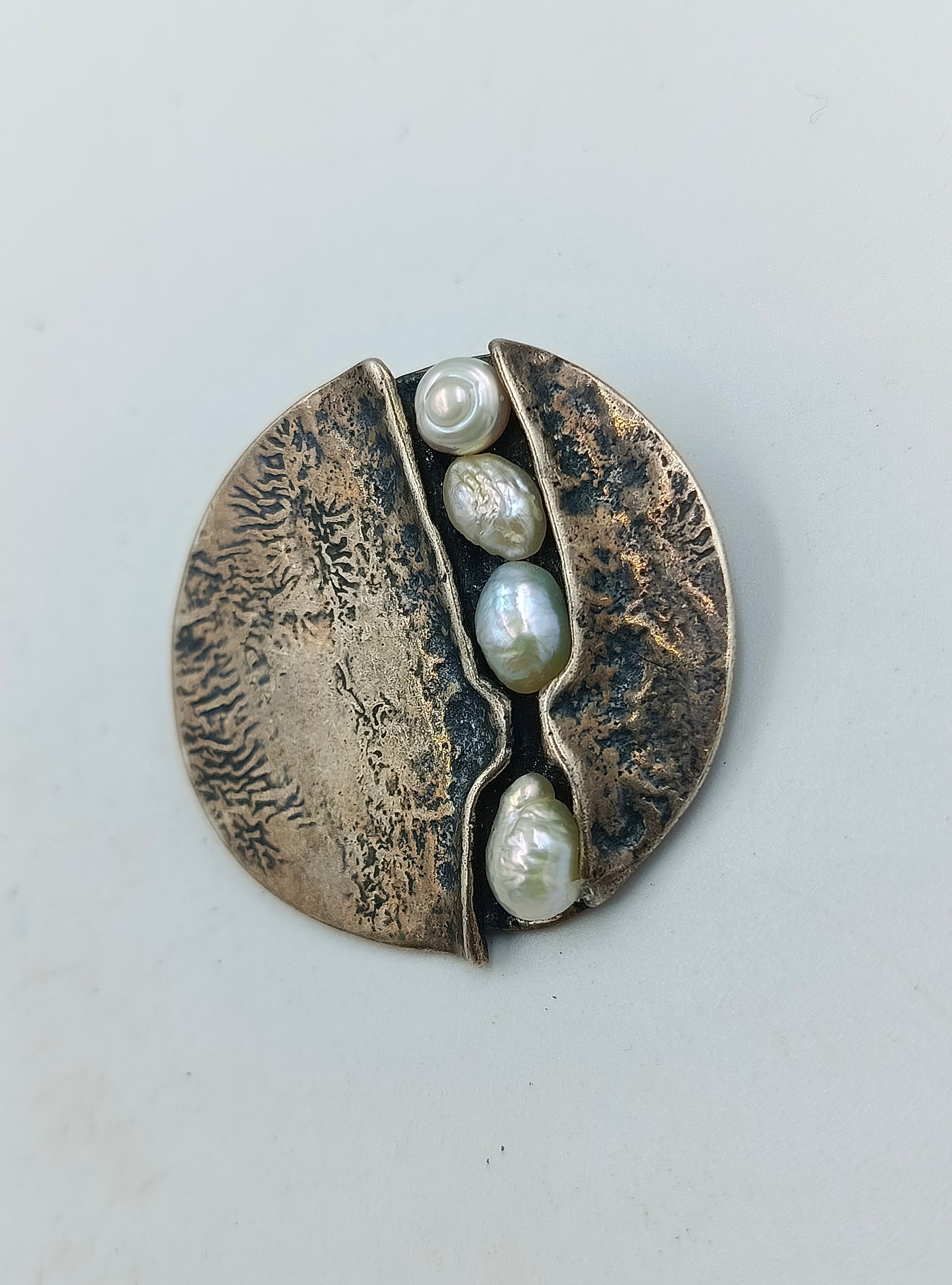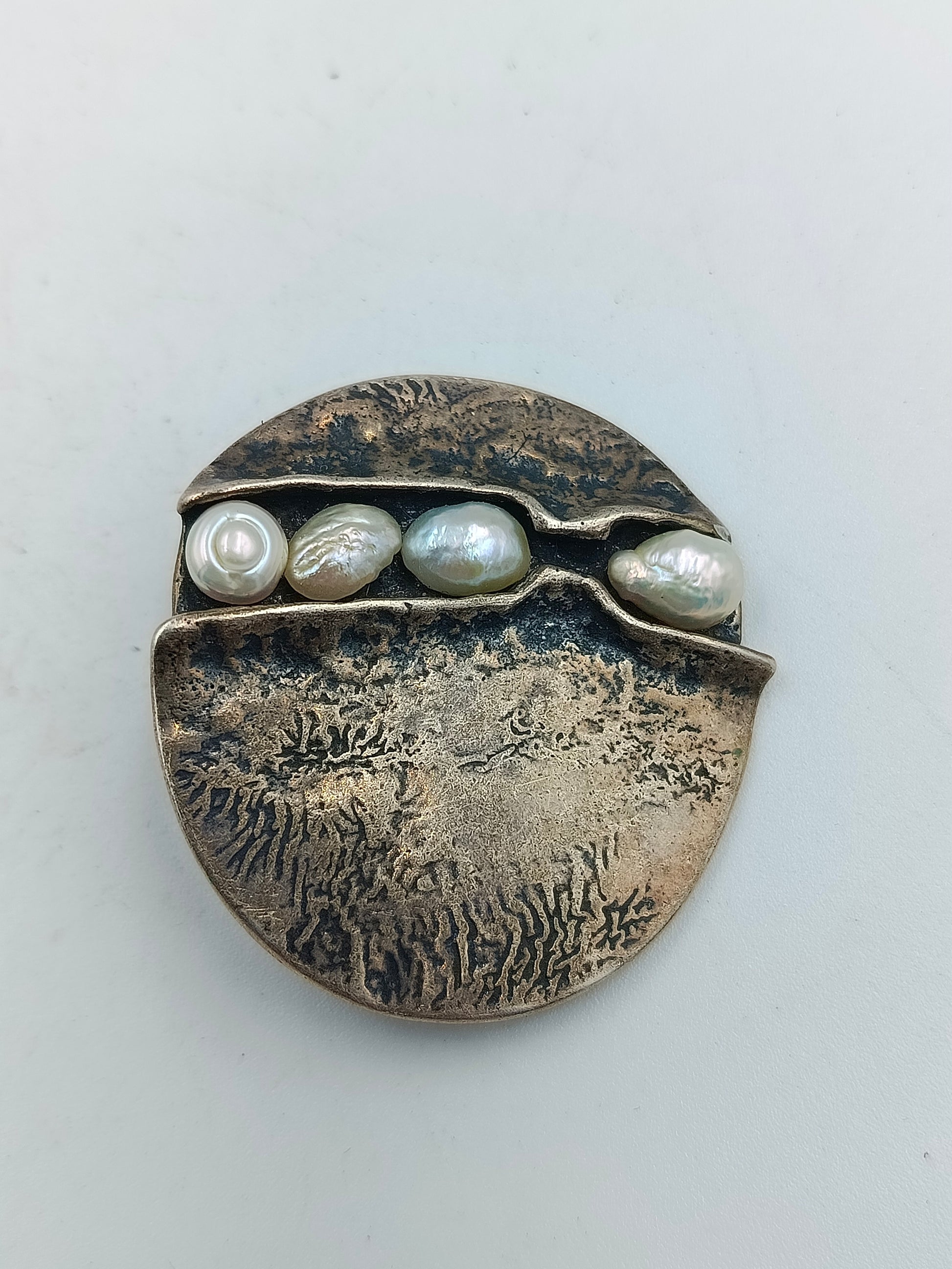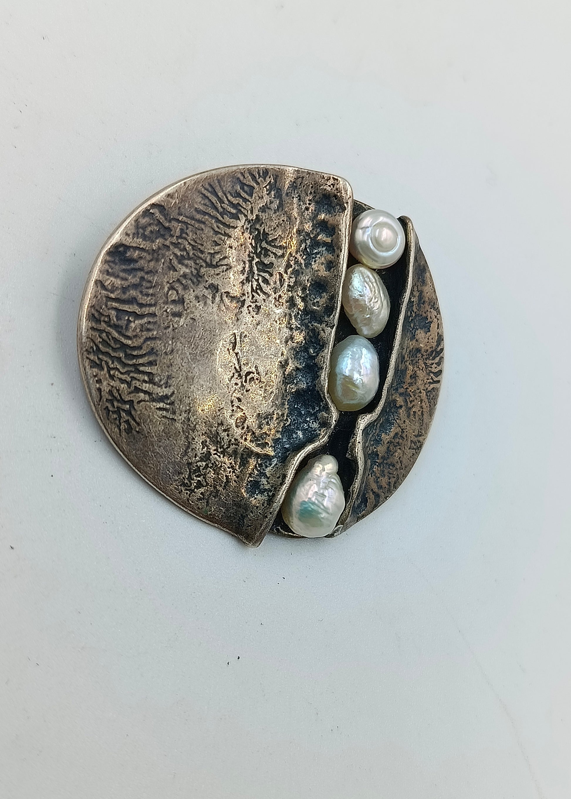 Künstlerisch gestaltete Brosche aus 835 Silber mit organischer Struktur und vier edlen Zuchtperlen. Das Design besticht durch seine rustikale Oberfläche und den natürlichen Kontrast zwischen glänzenden Perlen und patiniertem Silber. Ein ausdrucksstarkes Schmuckstück, das Eleganz und Handwerkskunst vereint.