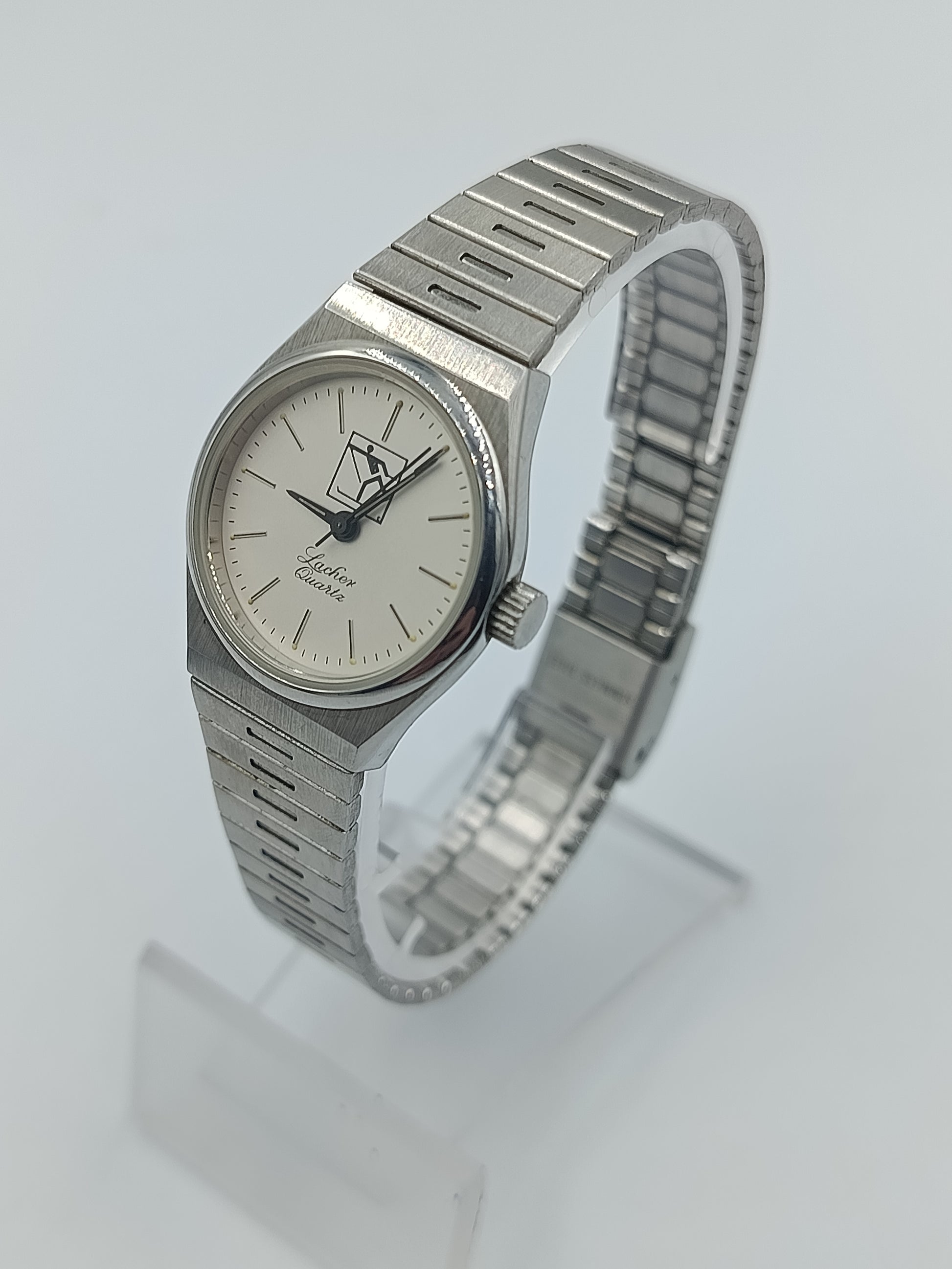 Elegante Vintage-Armbanduhr der Marke Lacher, mit klassischem Edelstahl-Gliederarmband und schlichtem, zeitlosem Zifferblatt. Das Quarzwerk sorgt für präzise Zeitmessung, und das robuste Edelstahlarmband bietet hohen Tragekomfort.