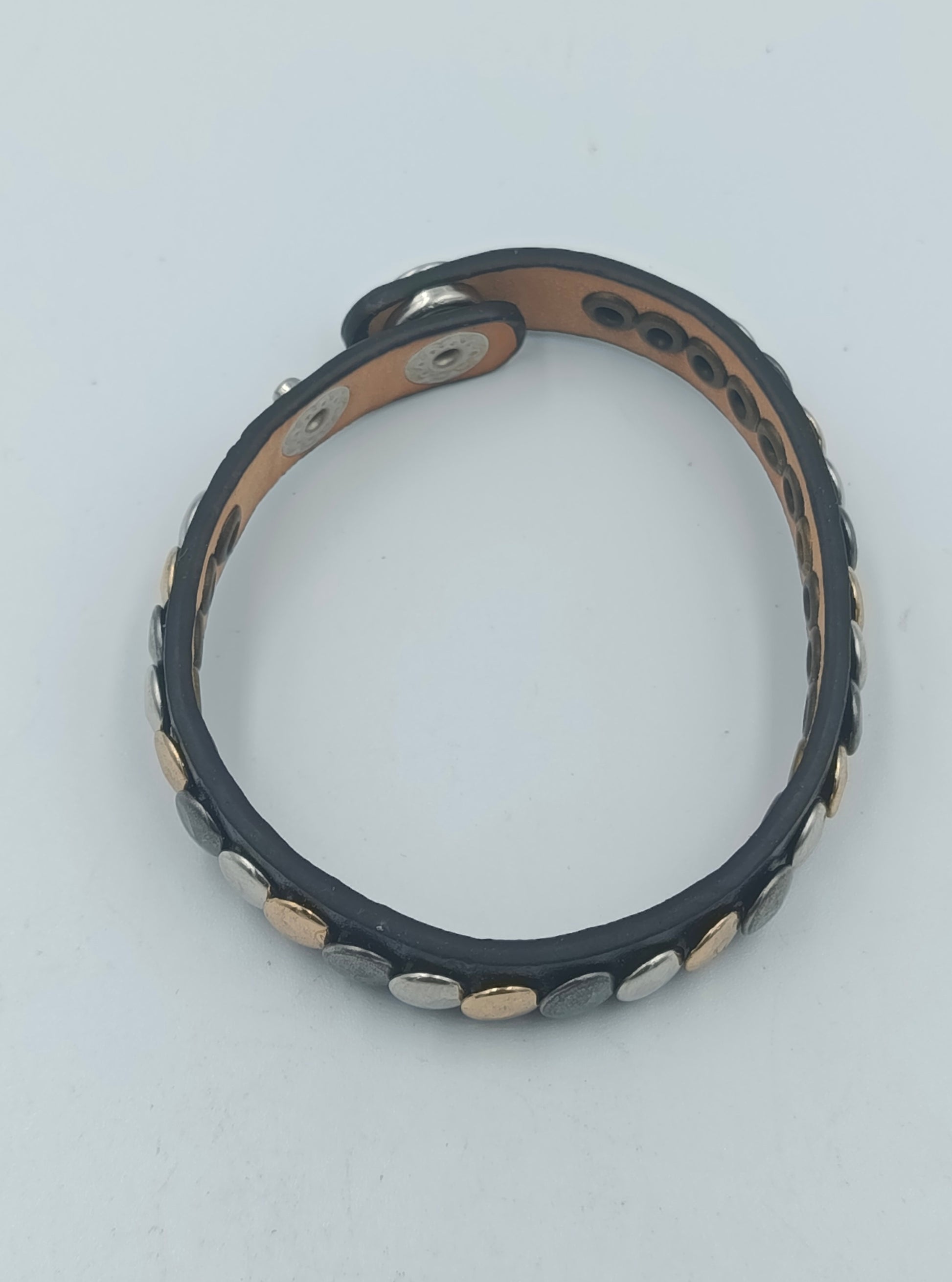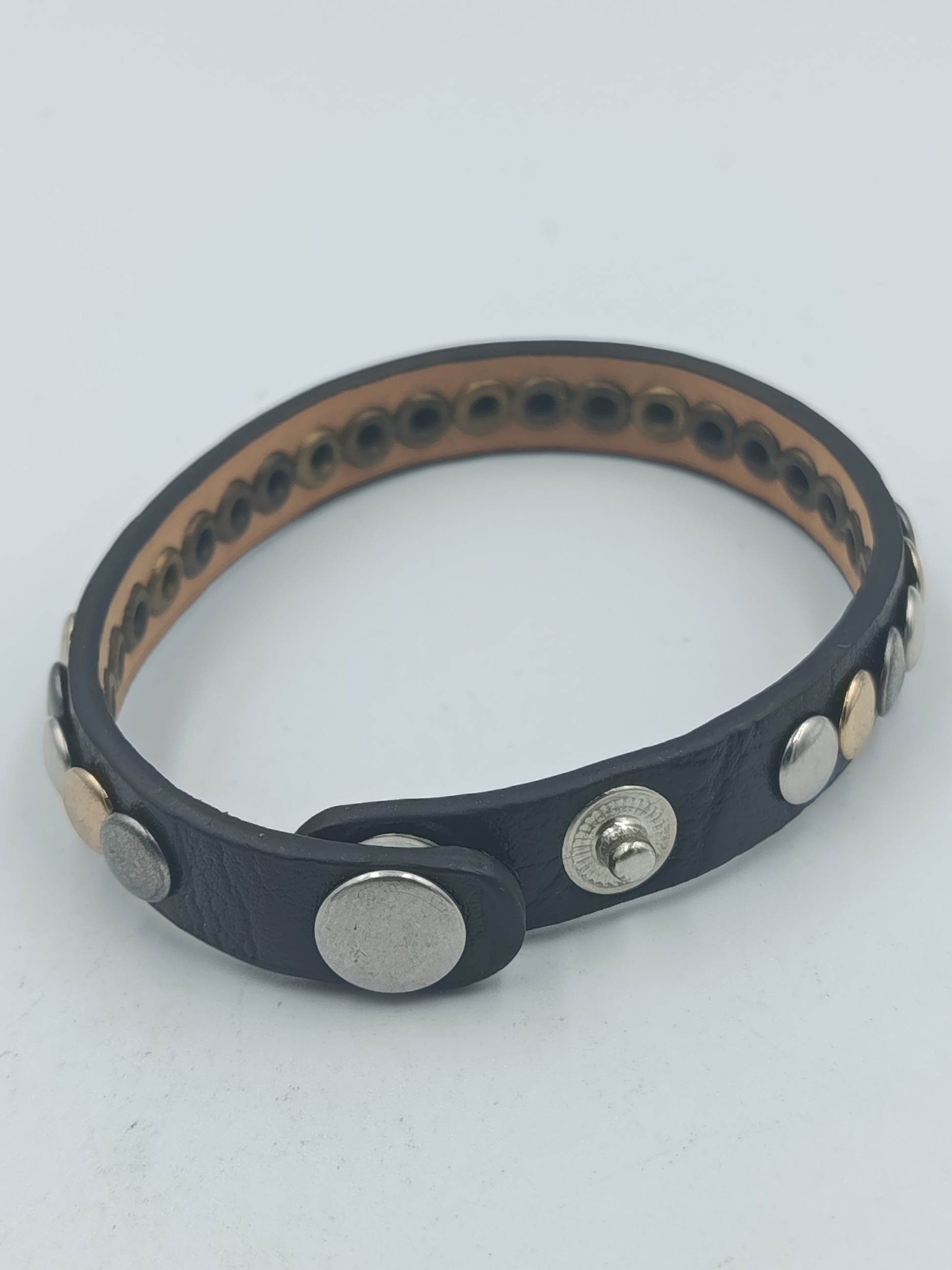 Stylisches Lederarmband in Schwarz mit abwechselnd gold- und silberfarbenen runden Nieten. Das markante Design verleiht dem Armband einen modernen, rockigen Look – ideal für Damen und Herren. Durch den verstellbaren Druckknopfverschluss lässt es sich bequem anpassen und vielseitig kombinieren.