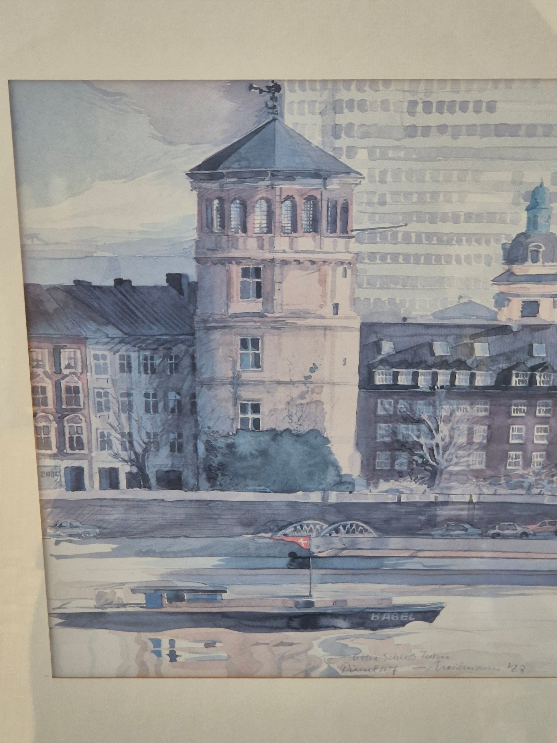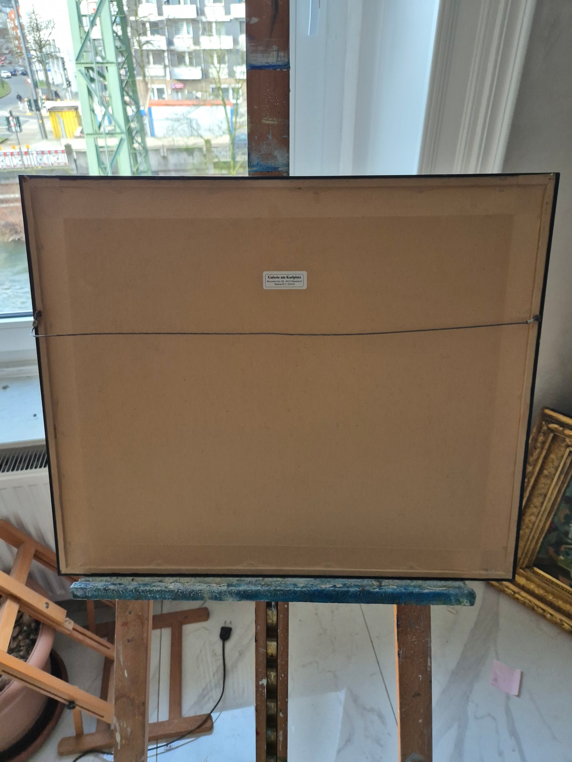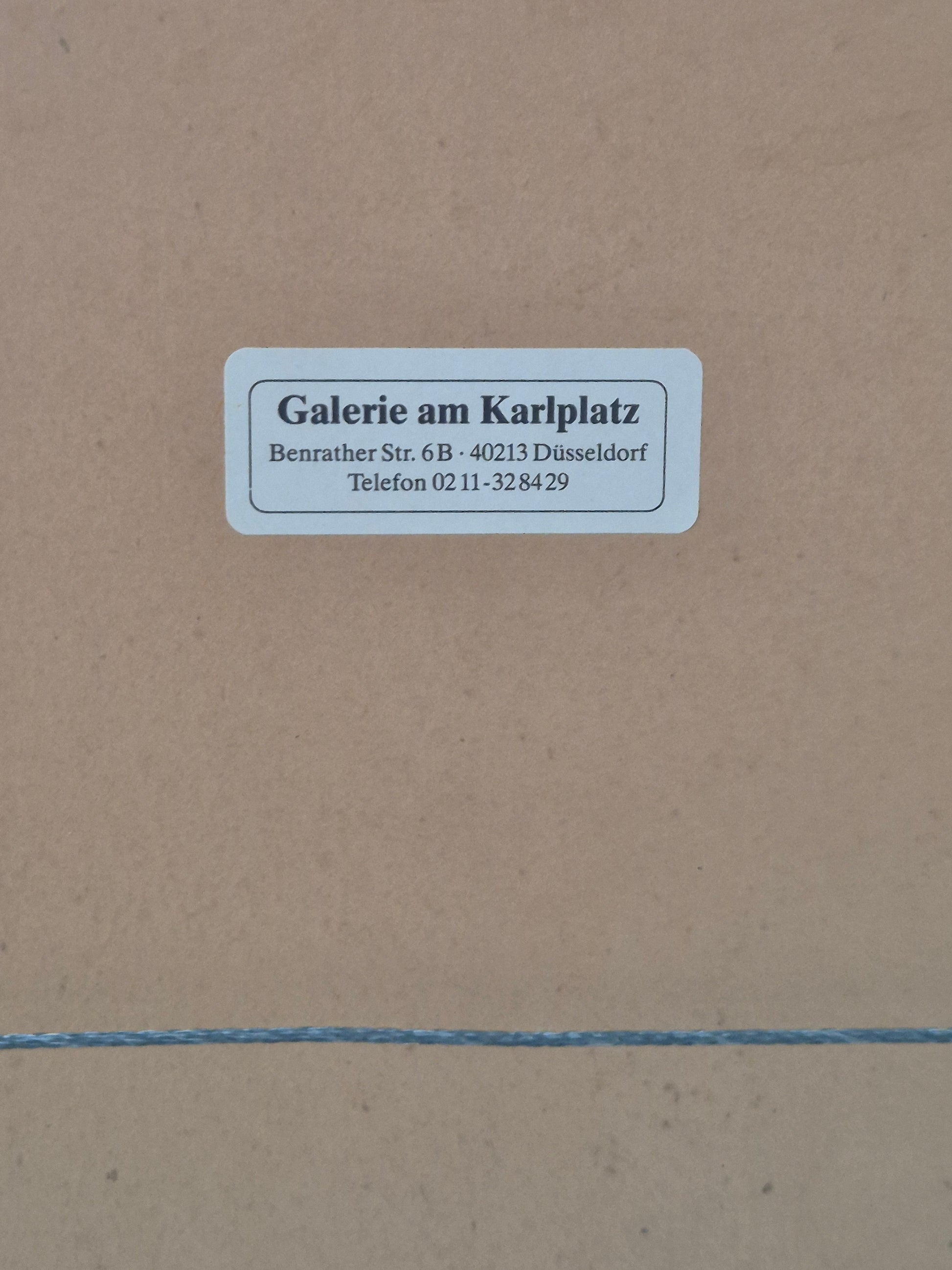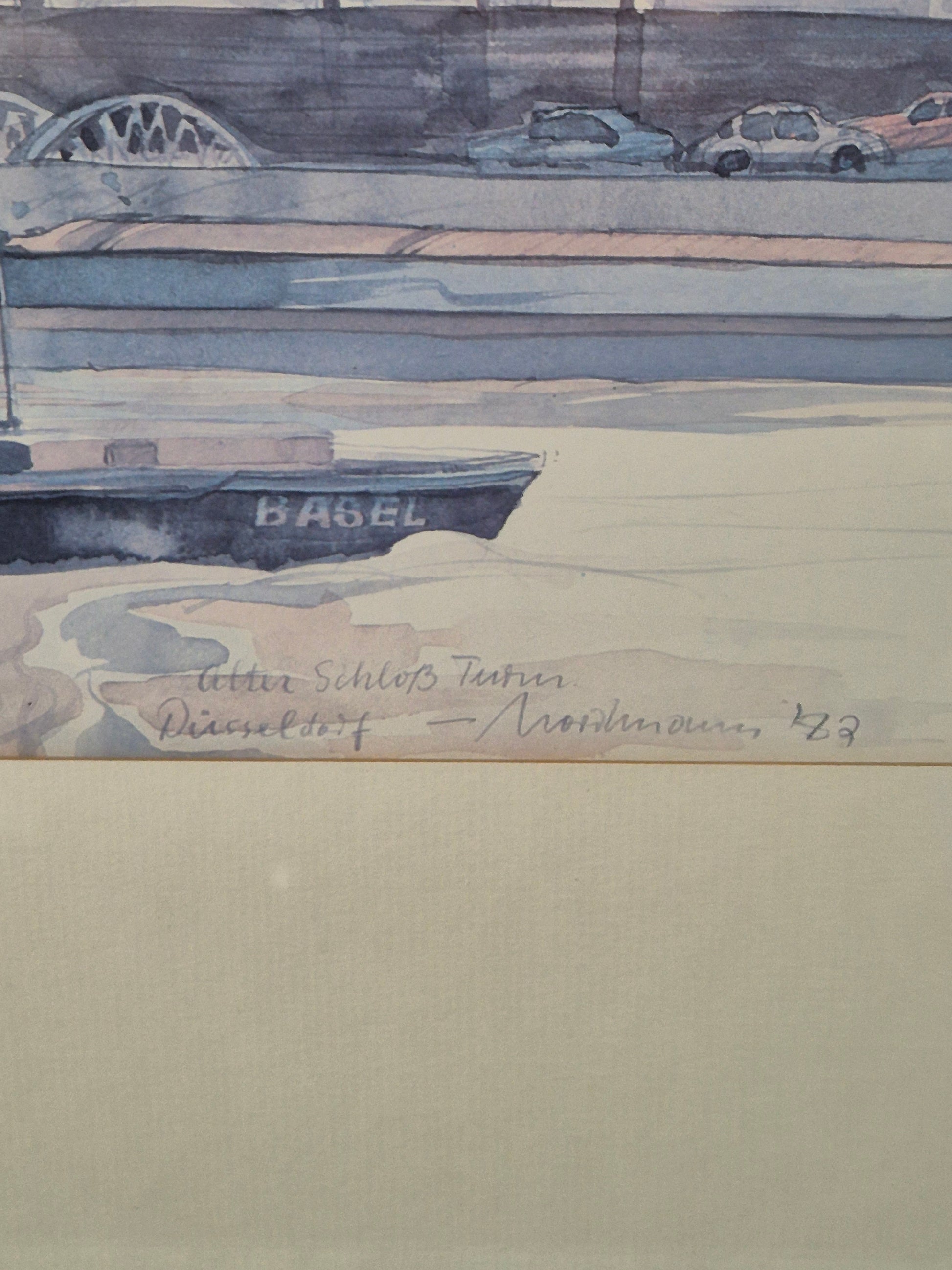 Beschreibung: Dieses detaillierte Aquarell aus dem Jahr 1973 zeigt den historischen Schlossturm in Düsseldorf. Das Kunstwerk wurde in der Galerie am Karlsplatz in Düsseldorf ausgestellt und besticht durch seine präzise Darstellung und den nostalgischen Charme. Ein wunderbares Stück für Sammler historischer Stadtansichten und Liebhaber Düsseldorfer Architektur.