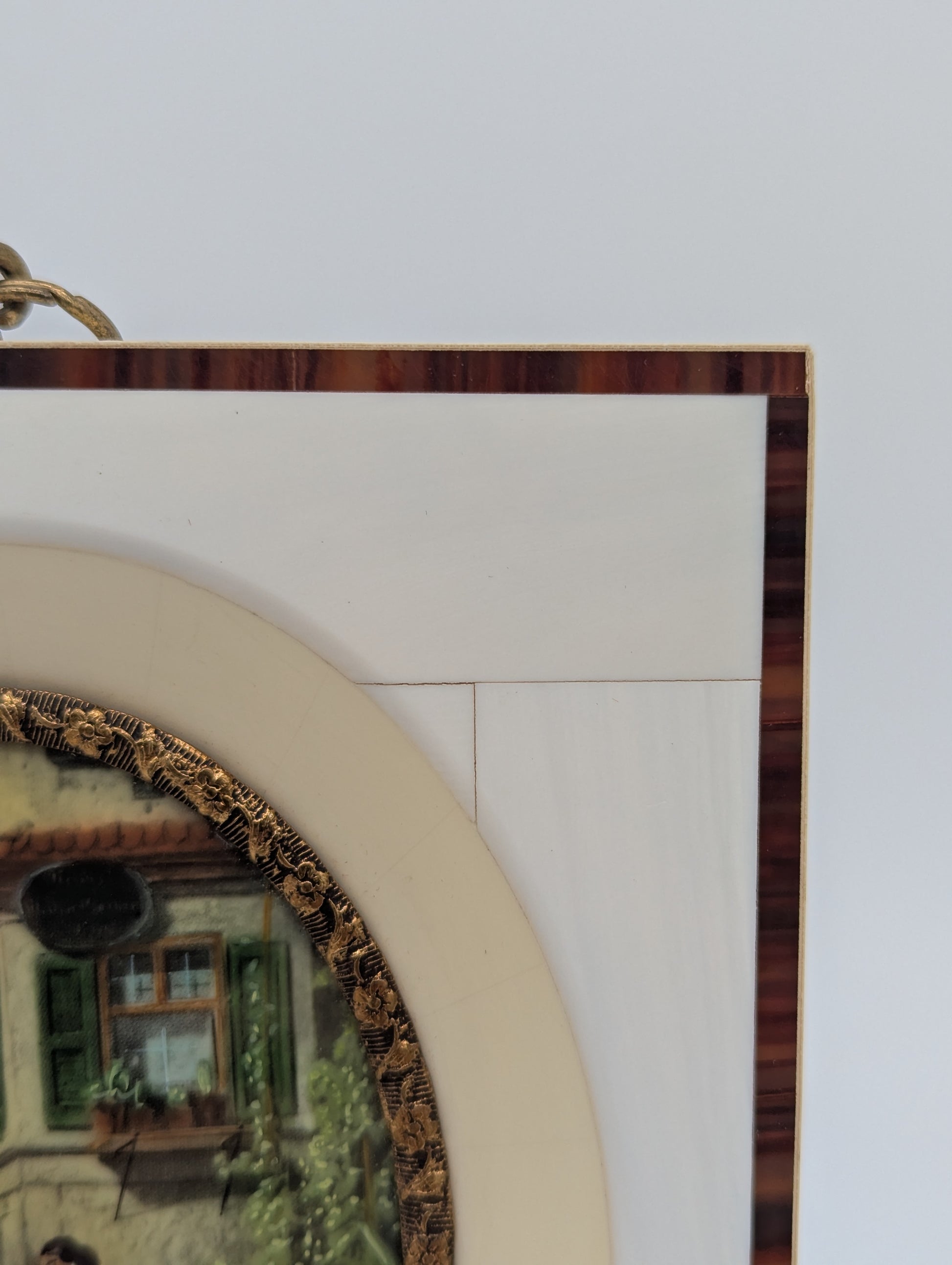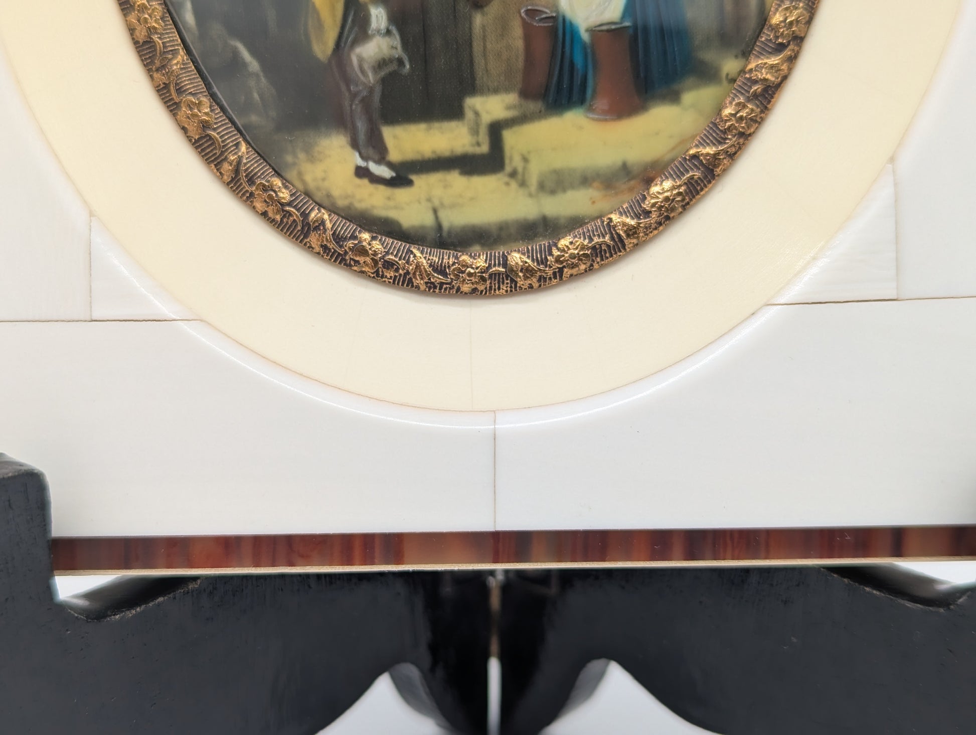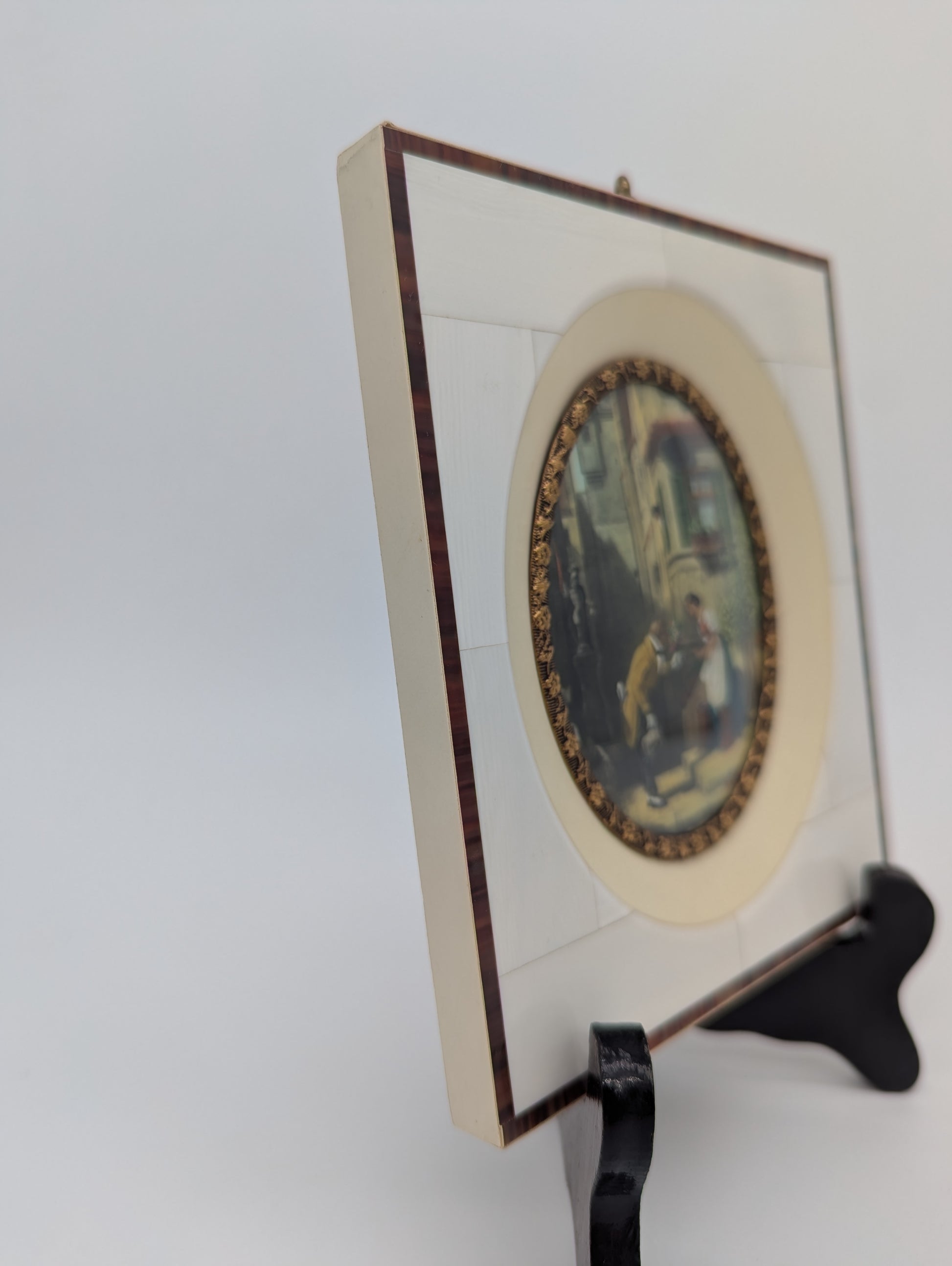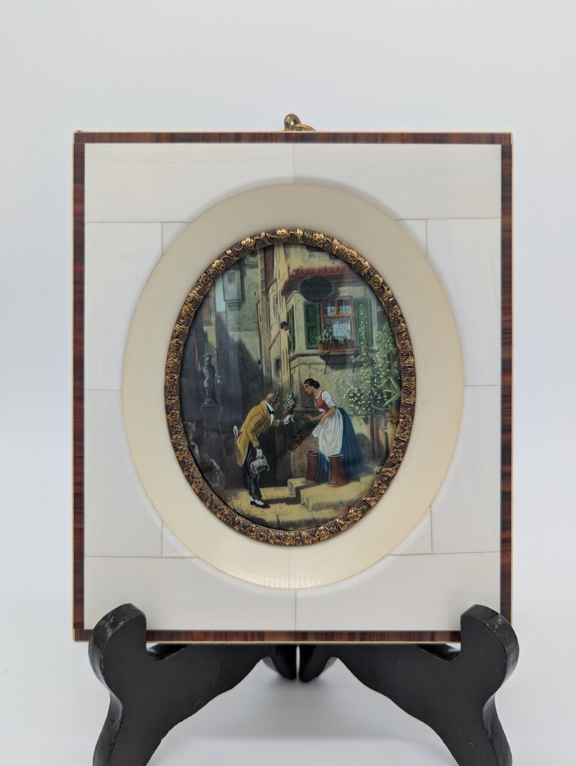 Diese fein ausgeführte Lupenmalerei zeigt das Motiv „Der Gratulant“ nach Carl Spitzweg. In der Szene überreicht ein Herr einer jungen Frau Blumen – ein charmantes Abbild bürgerlicher Romantik des 19. Jahrhunderts. Die detailreiche Ausführung und die harmonische Farbgebung verleihen dem kleinen Kunstwerk besondere Ausdruckskraft.