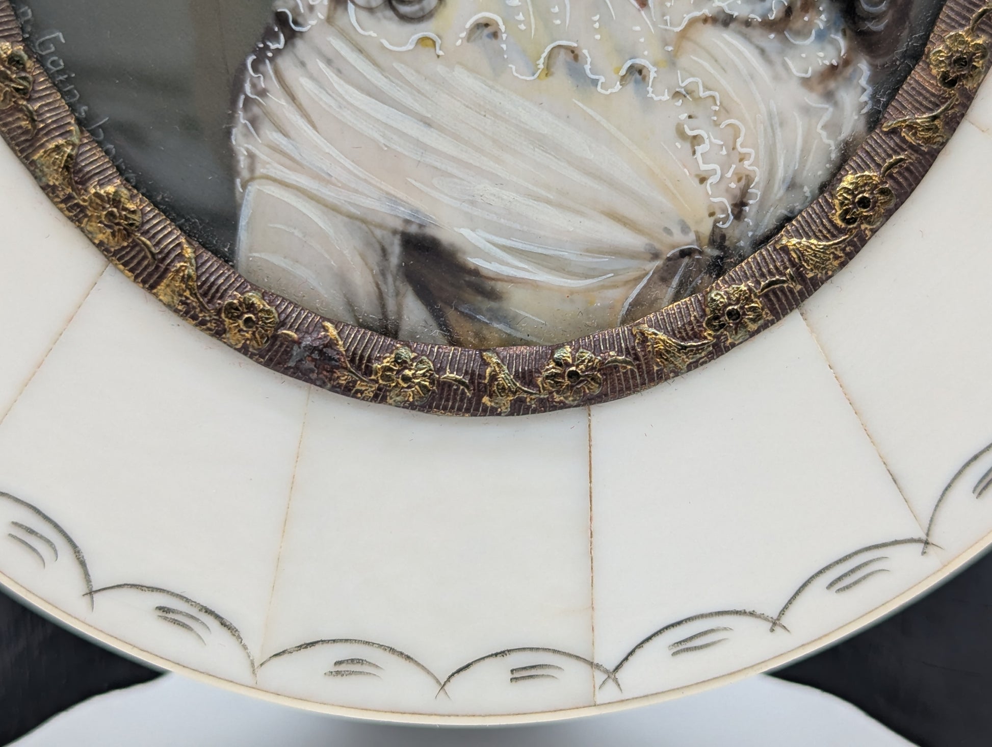 Diese fein ausgeführte Lupenmalerei zeigt die Herzogin von Devonshire in eleganter Pose. Mit ihrem imposanten schwarzen Hut, geschmückt mit weißen Federn, und dem zarten Gesichtsausdruck verkörpert sie die Grazie und Mode des späten 18. Jahrhunderts. Die meisterhafte Ausführung mit präzisen Pinselstrichen und sanften Farbübergängen zeugt von höchster handwerklicher Qualität und künstlerischem Können.