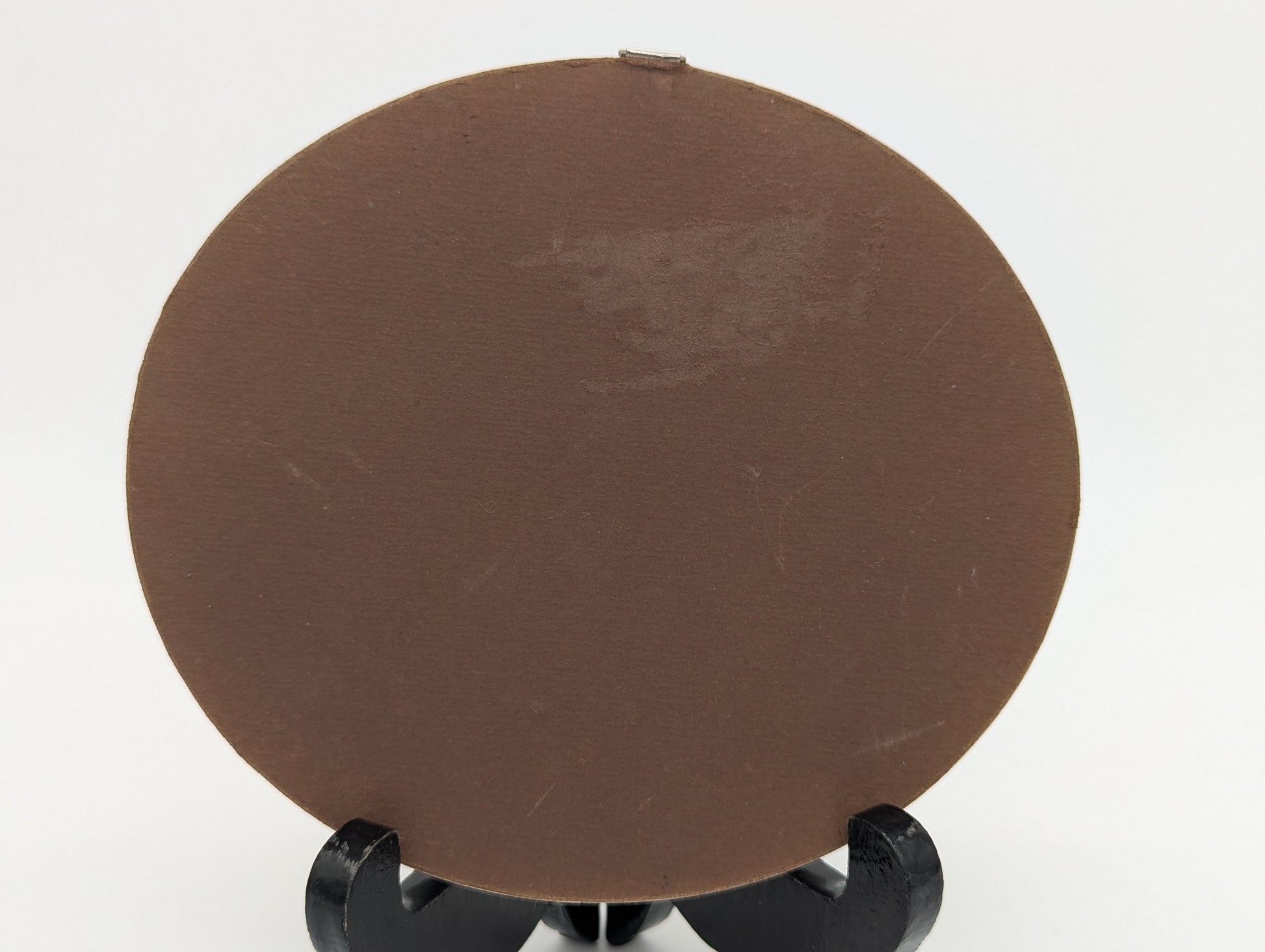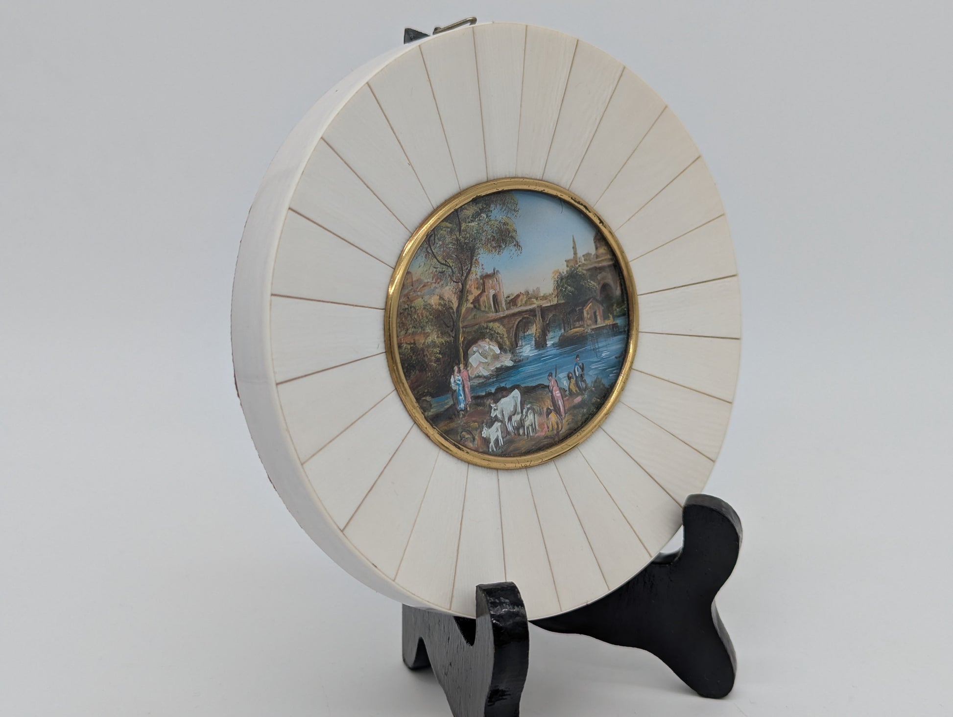 Die meisterhafte Detailarbeit und die harmonische Farbkomposition bringen die warme Atmosphäre des südlichen Lichts perfekt zur Geltung. Der ovale Bildausschnitt ist elegant in einen runden Rahmen eingefasst und unterstreicht den klassischen Charakter dieser Miniatur.