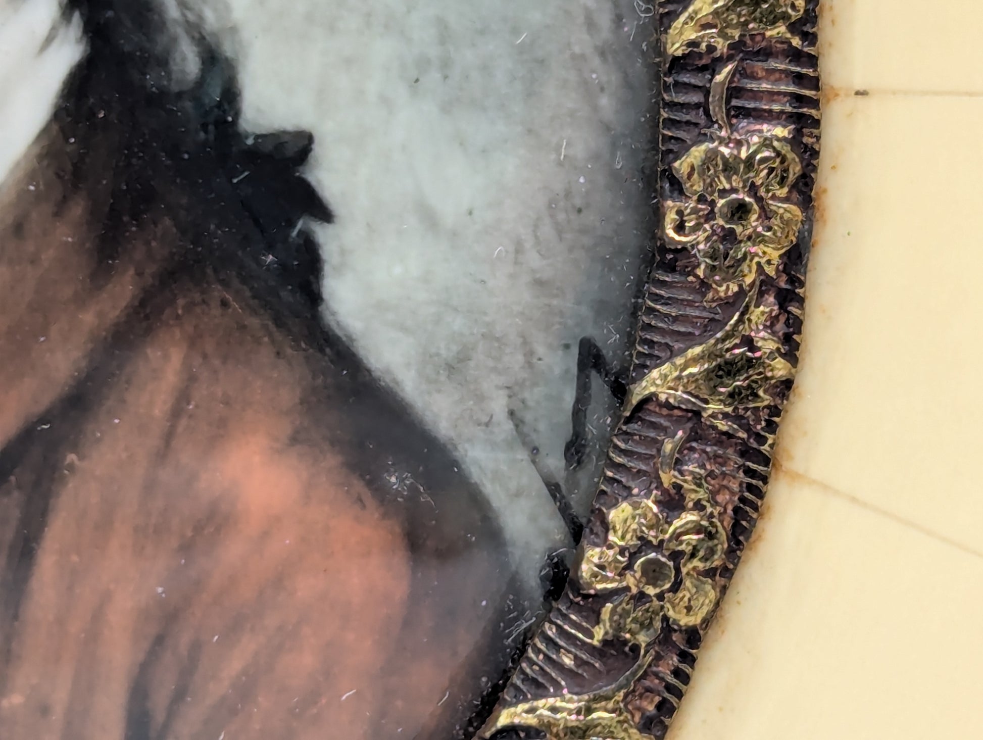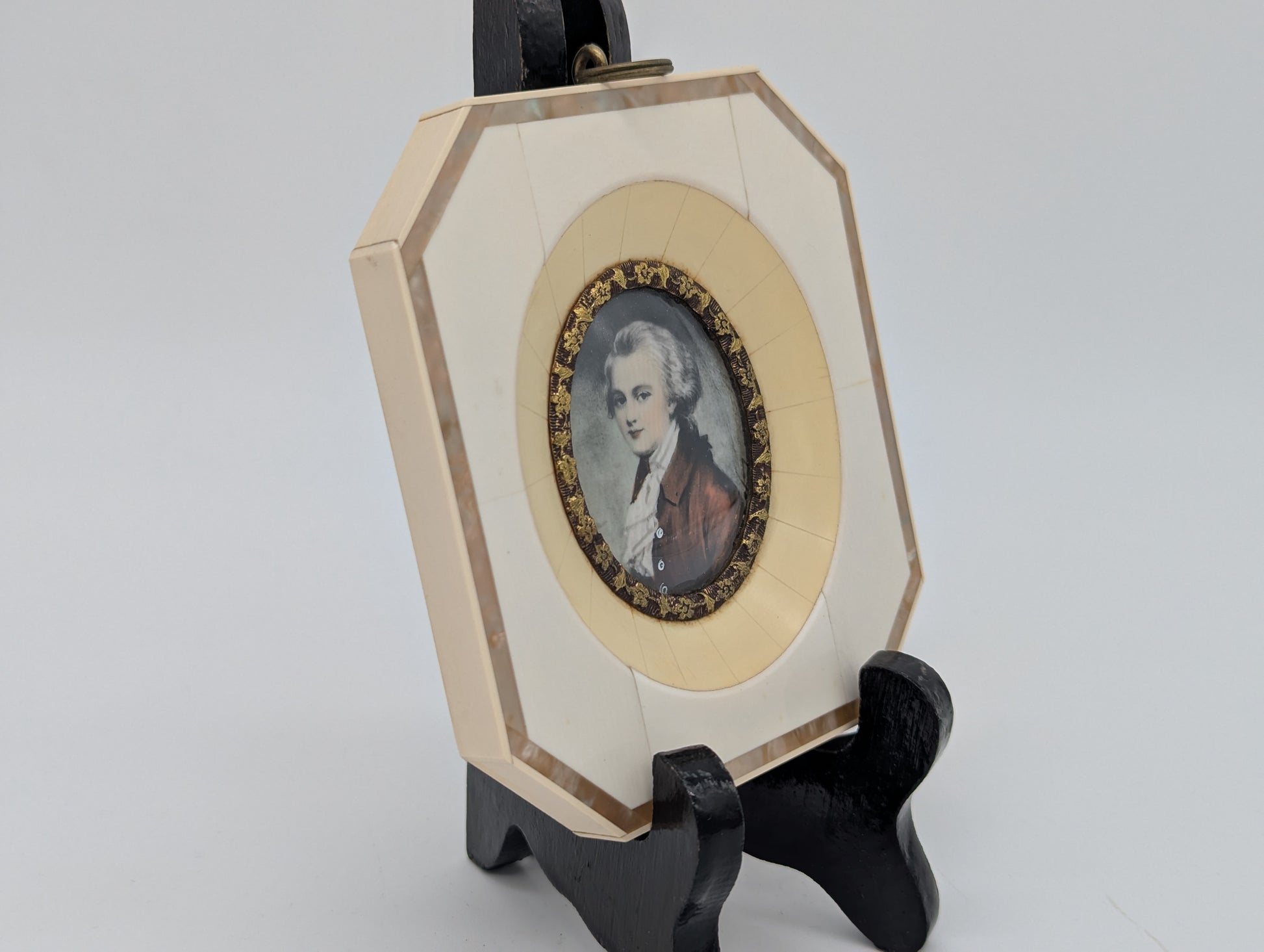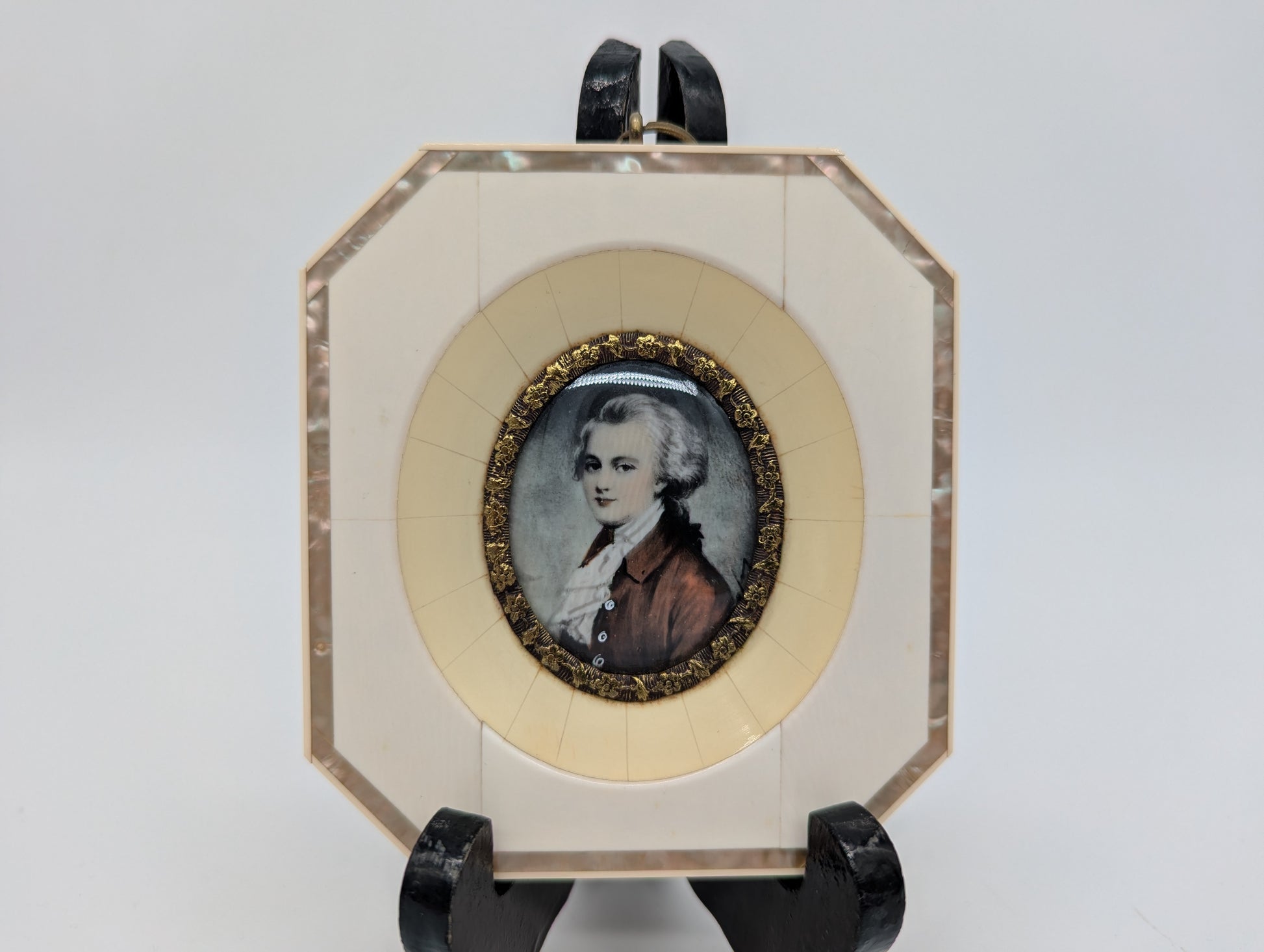 Die fein abgestimmte Farbgebung und der präzise Pinselstrich verleihen der Miniatur Tiefe und Ausdruckskraft. Der achteckige Rahmen mit ovaler Bildöffnung und floraler Zierleiste unterstreicht die klassische Eleganz dieser Miniatur.