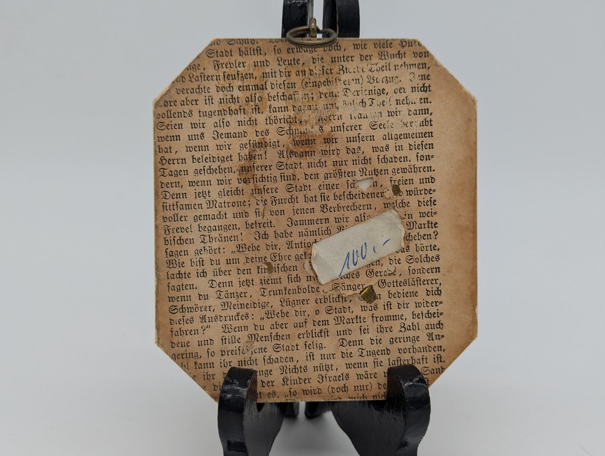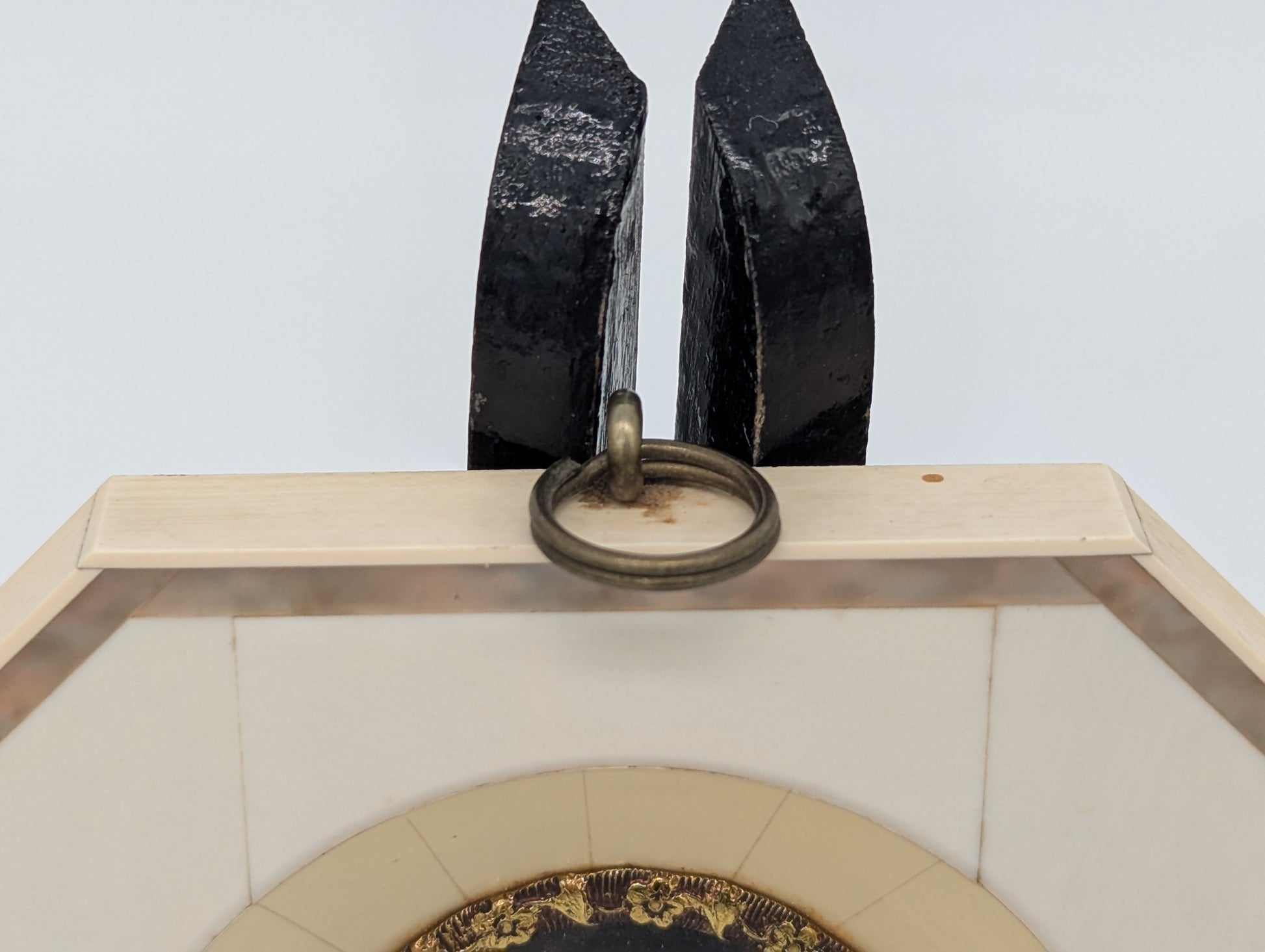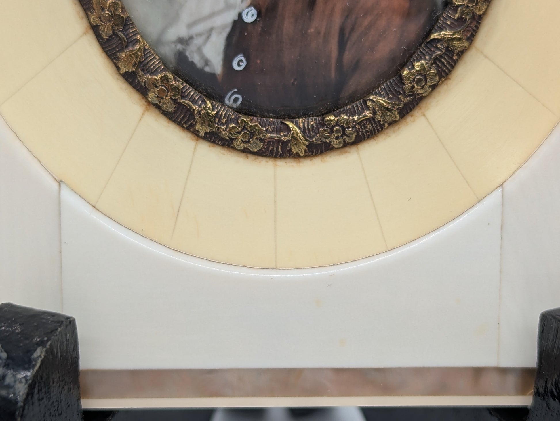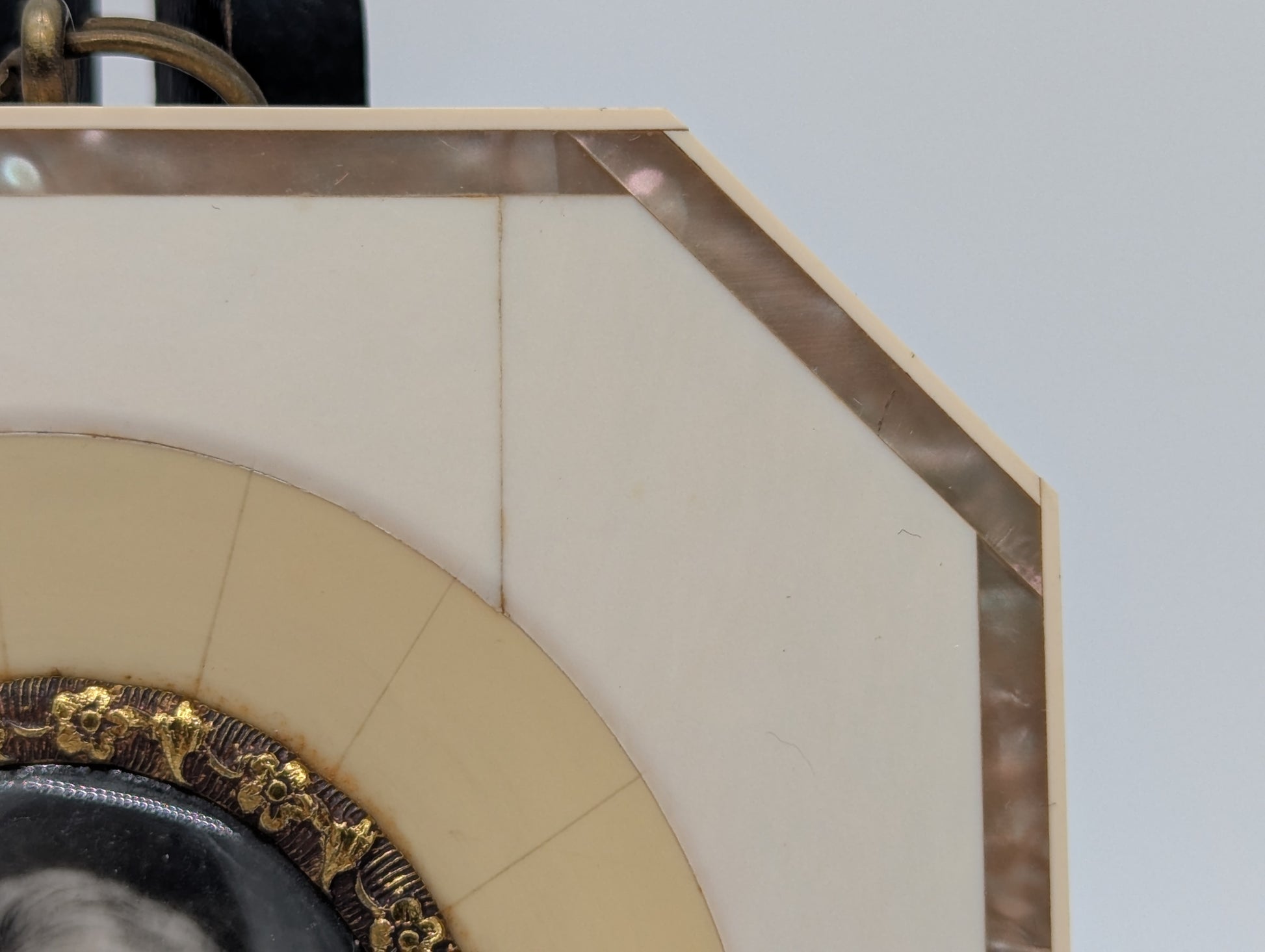 Die fein abgestimmte Farbgebung und der präzise Pinselstrich verleihen der Miniatur Tiefe und Ausdruckskraft. Der achteckige Rahmen mit ovaler Bildöffnung und floraler Zierleiste unterstreicht die klassische Eleganz dieser Miniatur.