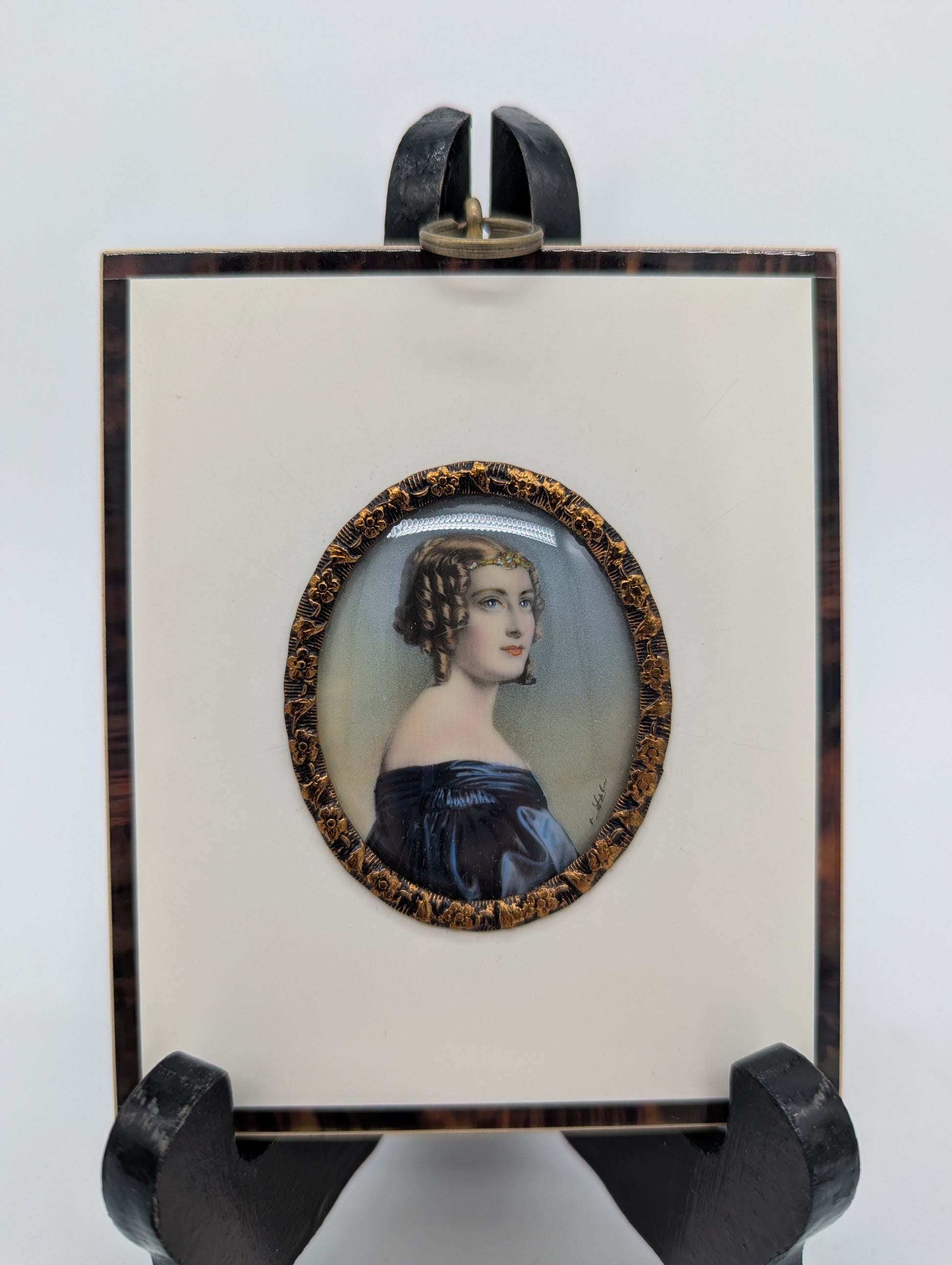 Lupenmalerei Miniaturmalerei Porträt einer Dame im blauen Kleid signiert