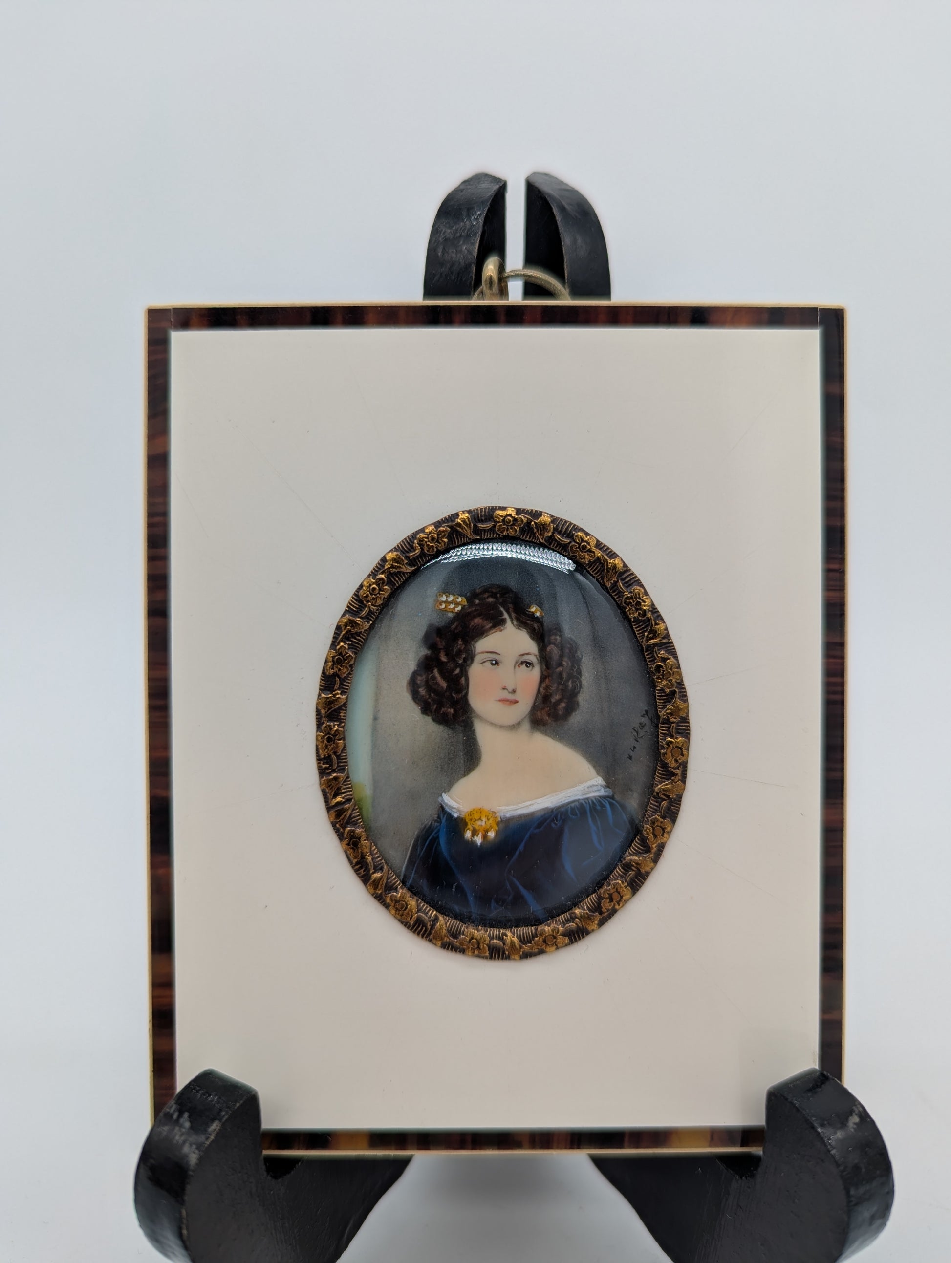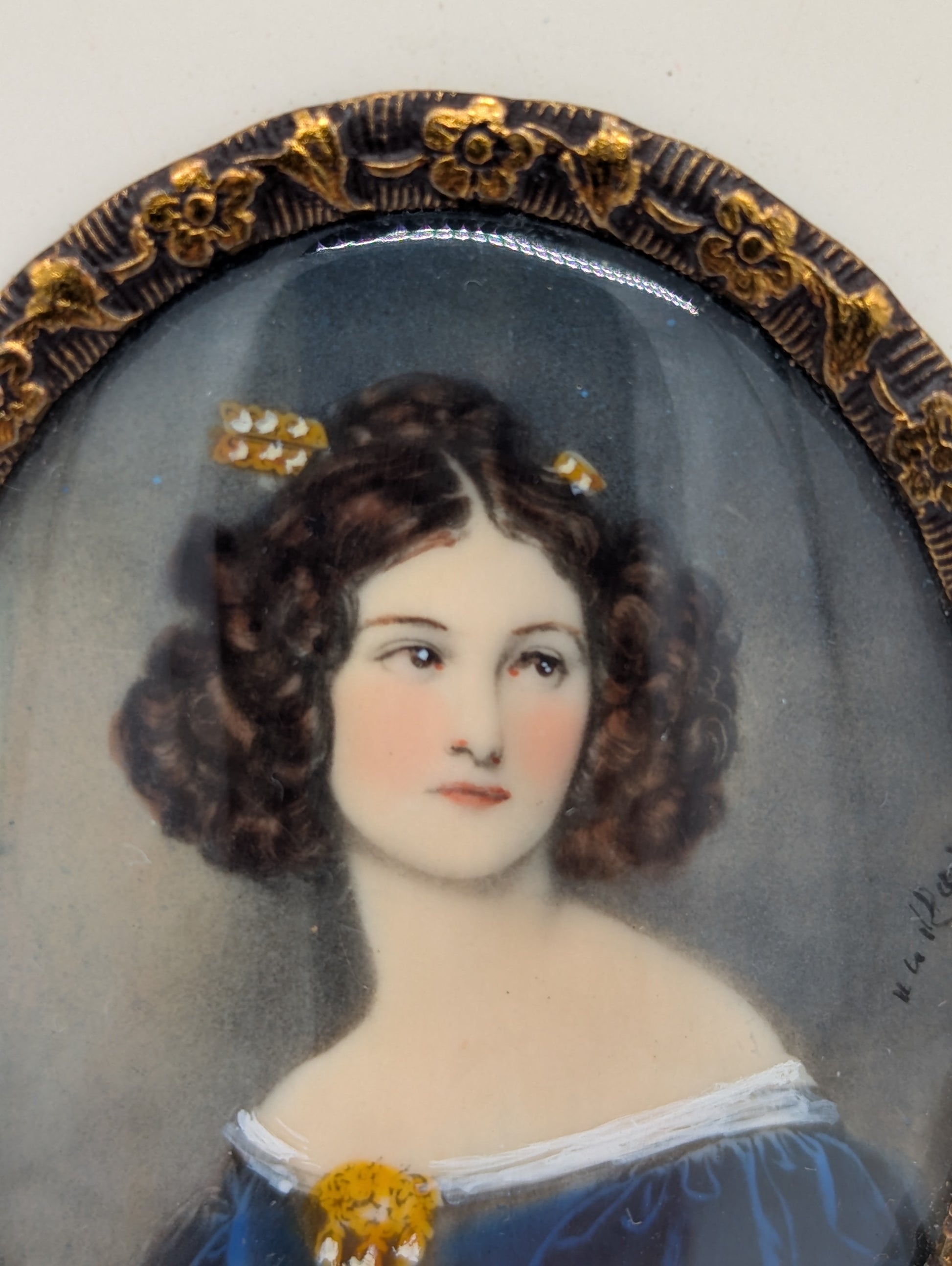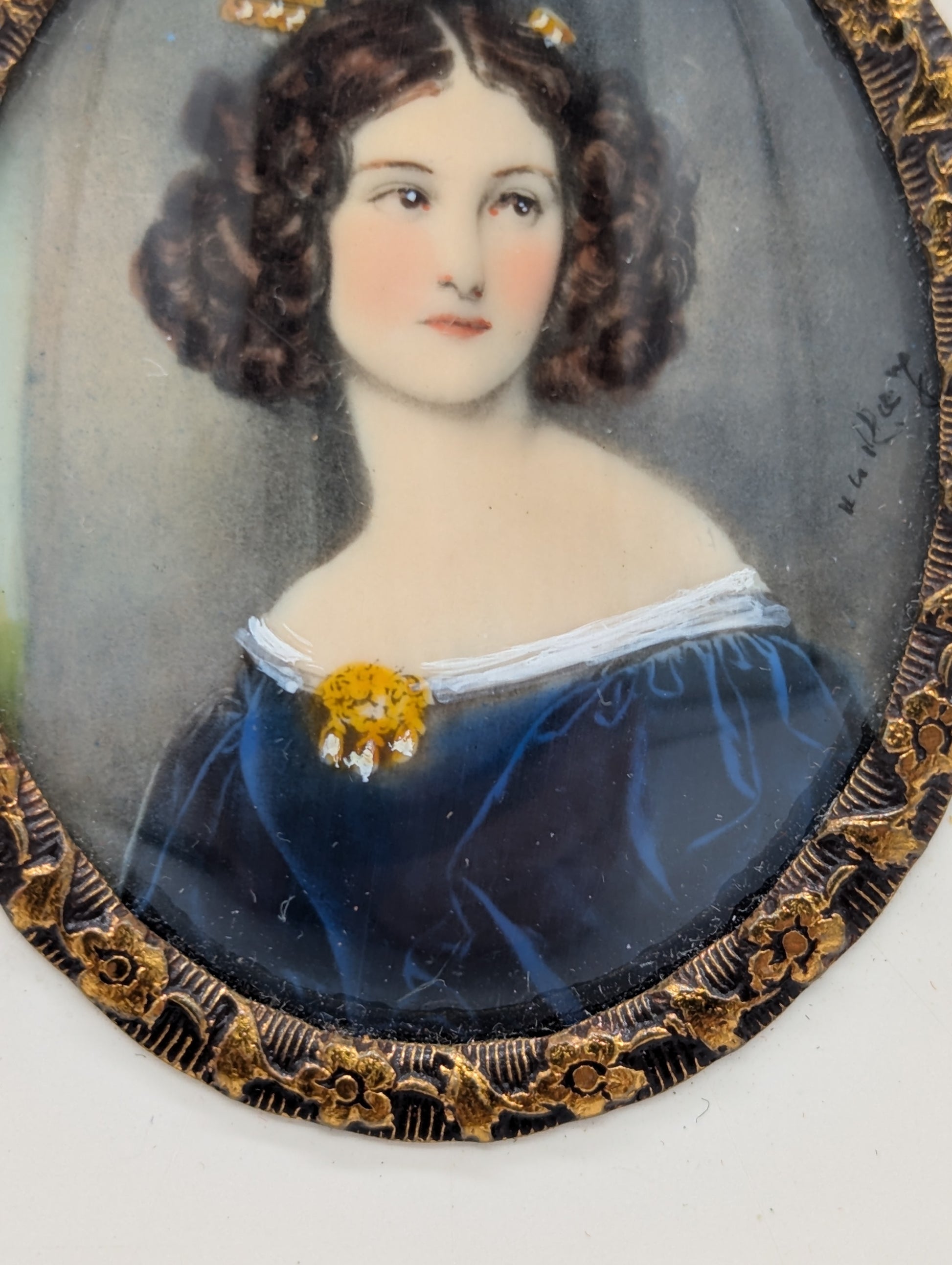 Lupenmalerei Miniaturmalerei Porträt einer Dame im blauen Kleid signiert