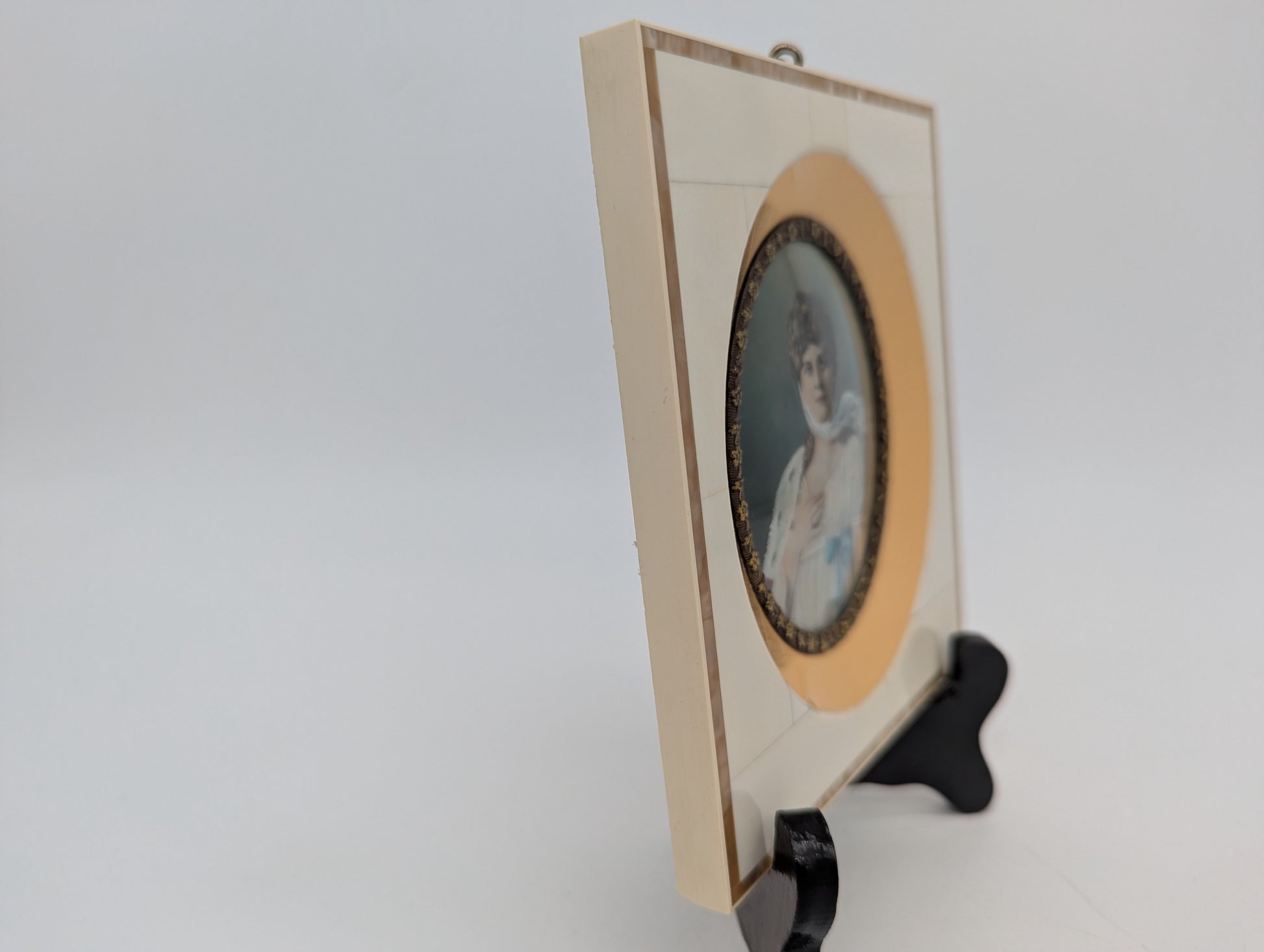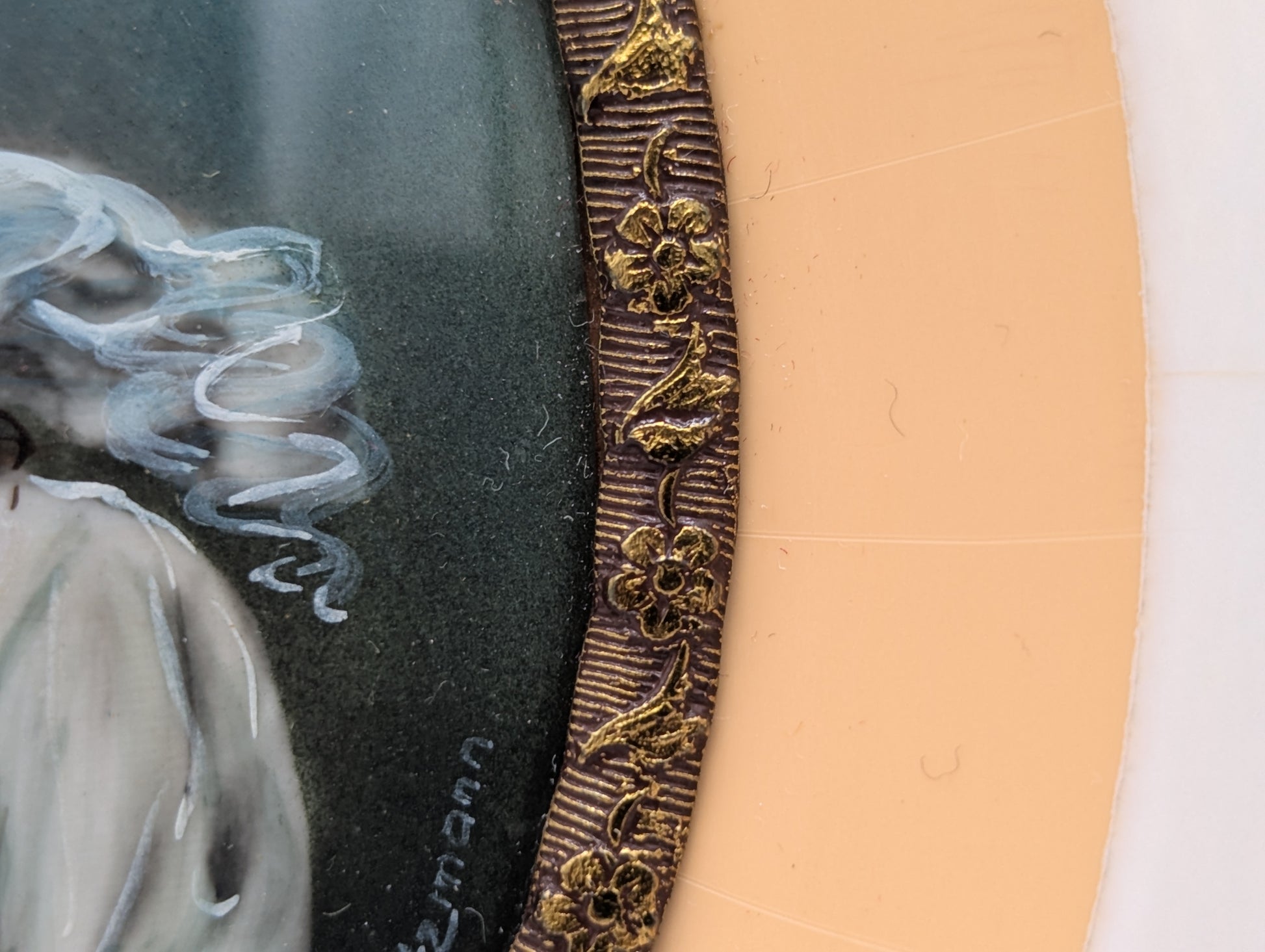 Diese fein ausgeführte Lupenmalerei zeigt das Porträt einer jungen Dame nach Lotzmann. Die zarten Farben, die weichen Übergänge und der ausdrucksvolle Blick verleihen dem Bild eine besondere Tiefe und Anmut. Ein kunstvolles Sammlerstück mit klassischer Eleganz und liebevoller Detailarbeit.