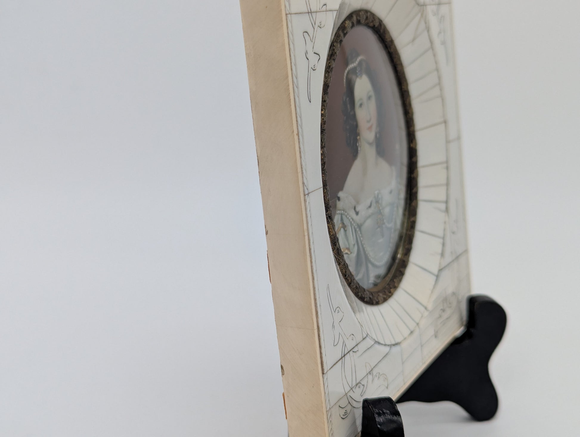 Diese kunstvoll ausgeführte Lupenmalerei zeigt Prinzessin Charlotte von Hagen nach einem Werk von Joseph Stieler. Das fein gemalte Porträt besticht durch seine elegante Darstellung, die detailreiche Ausarbeitung des Kleides und die edle Schmuckverzierung. Ein klassisches Sammlerstück, das künstlerische Präzision und zeitlose Anmut vereint.