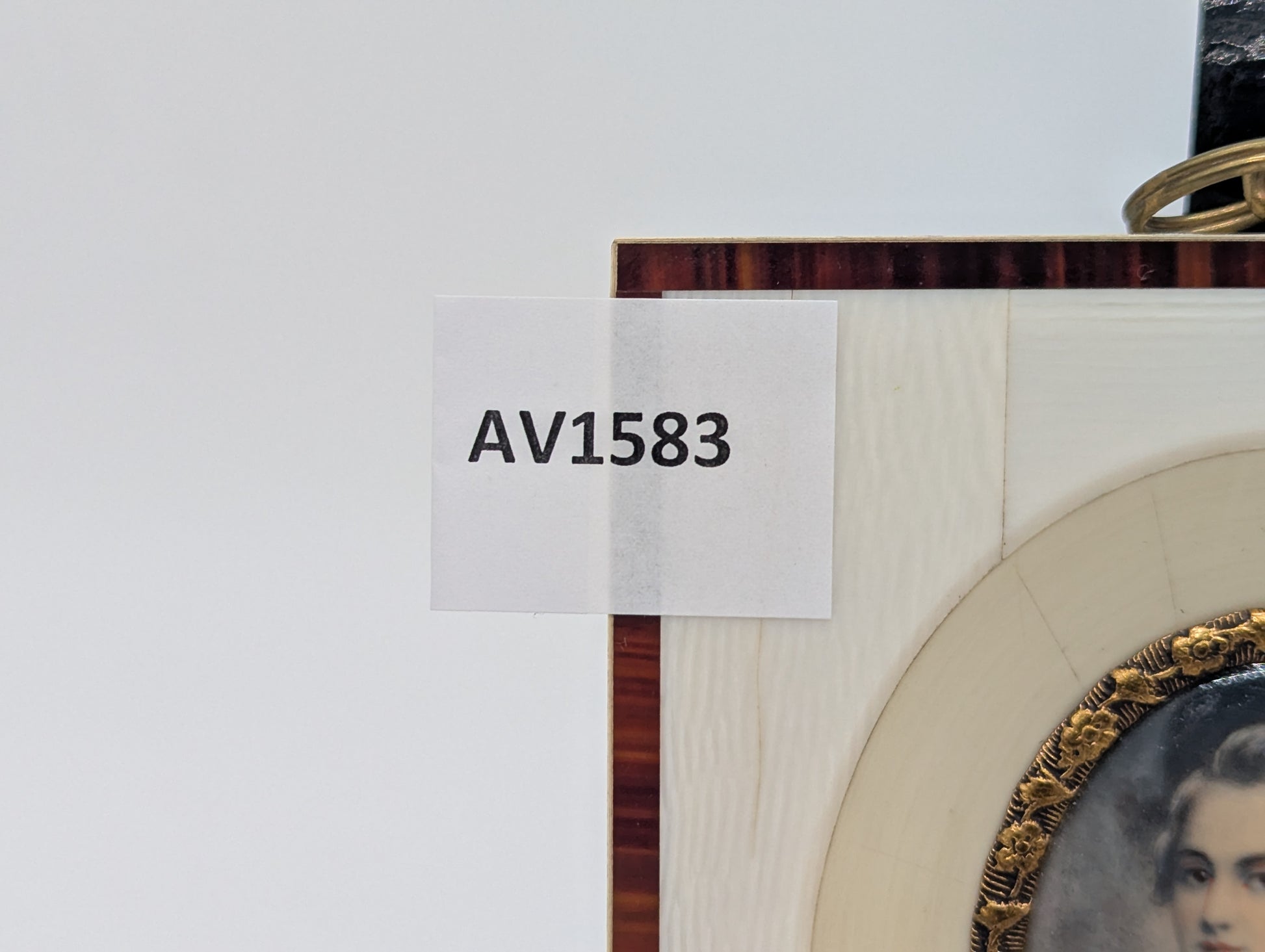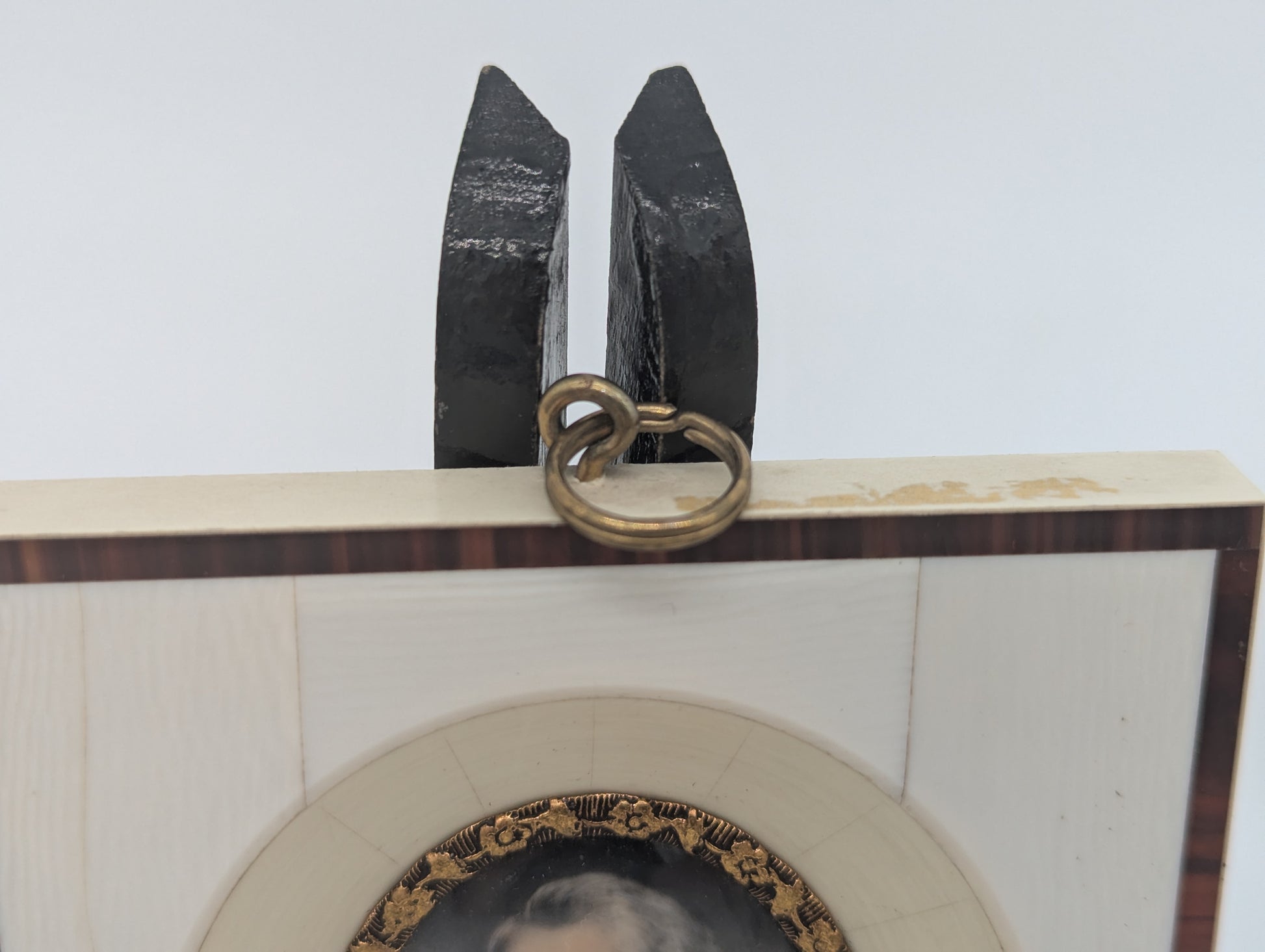 Die Malerei besticht durch ihre feine Linienführung und harmonische Farbgebung, die den Charakter des Dargestellten lebendig einfängt. Der rechteckige Rahmen mit ovaler Bildöffnung verleiht der Miniatur eine zeitlose Eleganz und macht sie zu einem wertvollen Sammlerstück für Liebhaber klassischer Porträtkunst.