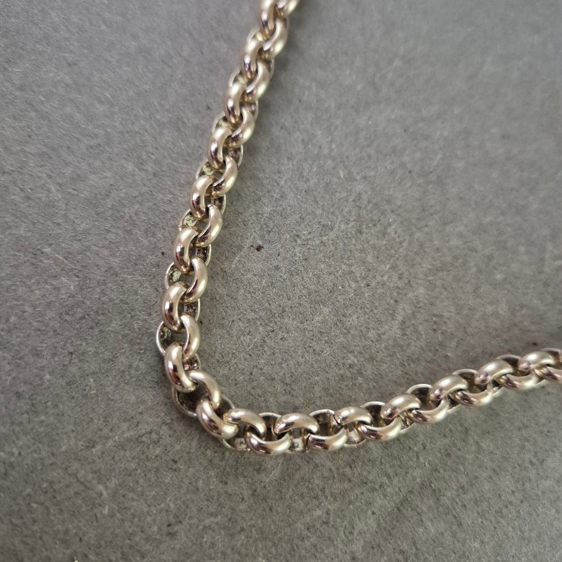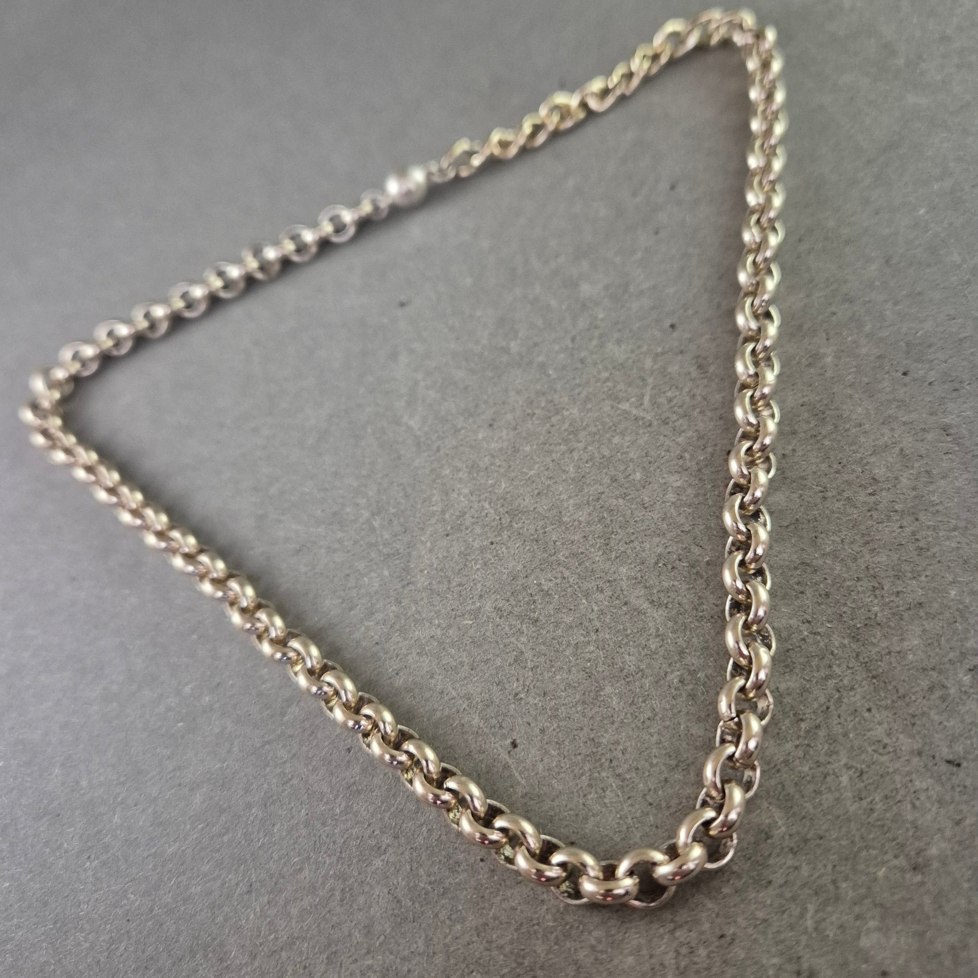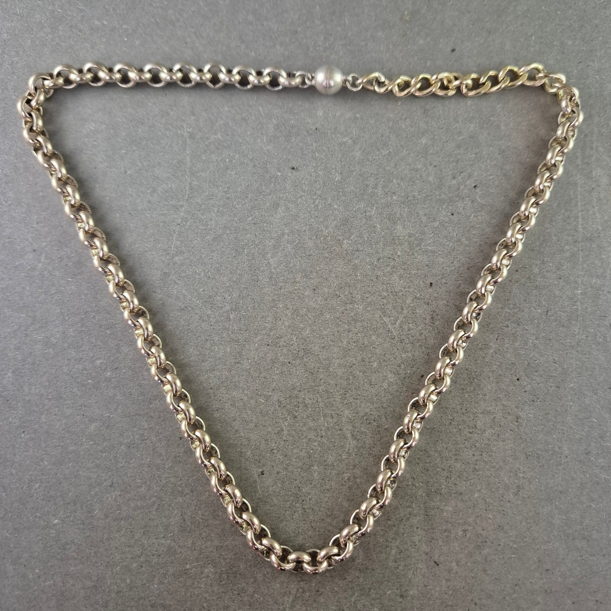 Diese silberfarbene Panzer Kette überzeugt mit ihrem massiven Gliederdesign und einem zeitlosen Look. Mit einer Gesamtlänge von ca. 42 cm (geschlossen gemessen ca. 21 cm) liegt sie markant am Hals und eignet sich sowohl für elegante als auch für moderne Outfits.