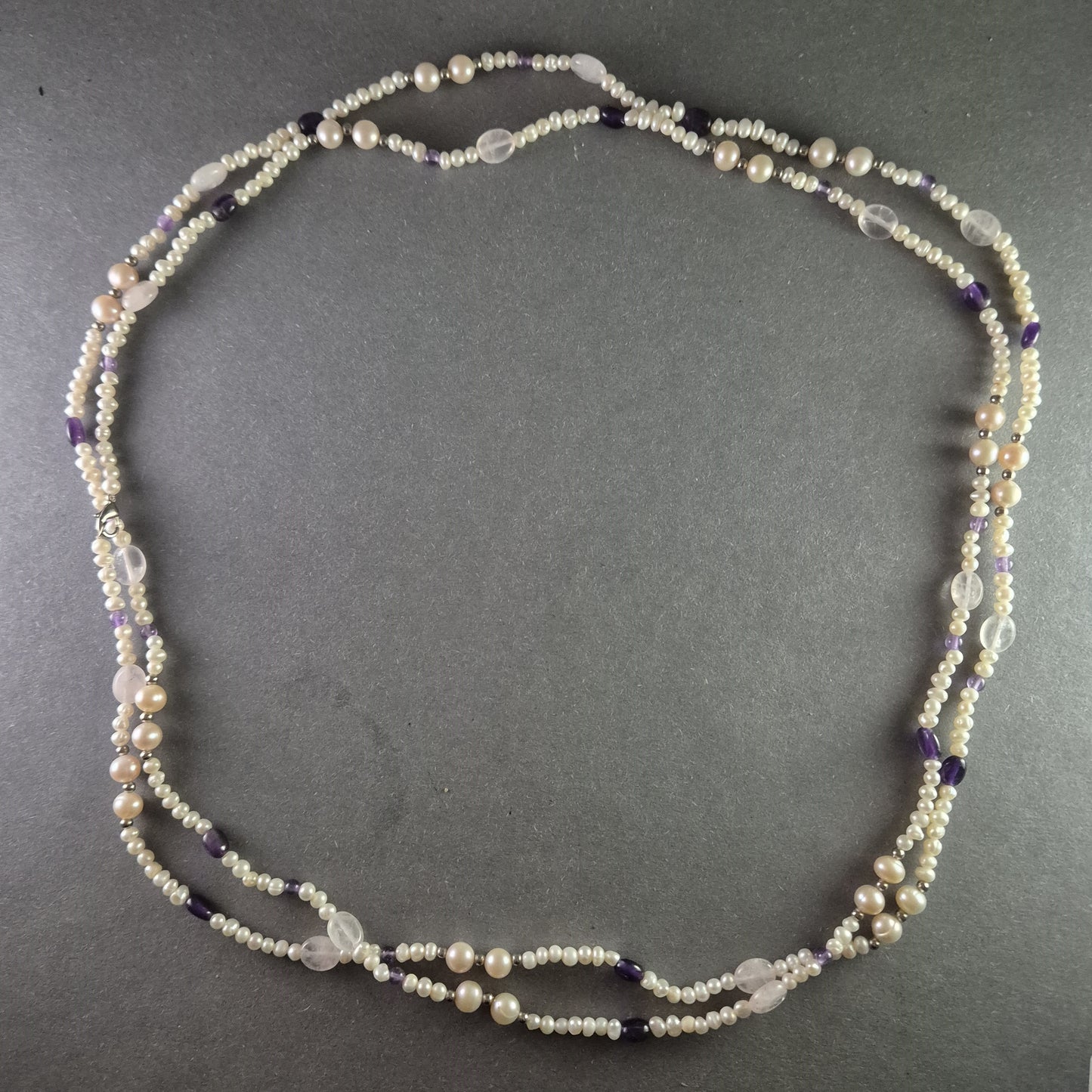 Diese exquisite Halskette kombiniert natürliche Süßwasserperlen mit Amethysten und Rosenquarz zu einem harmonischen Schmuckstück. Die zarten Lila- und Rosa-Töne der Edelsteine ergänzen die glänzenden Perlen und verleihen der Kette eine einzigartige Eleganz. Mit ihrem mehrreihigen Design eignet sie sich perfekt für besondere Anlässe und elegante Outfits. Der hochwertige Karabinerverschluss bietet sicheren Tragekomfort.