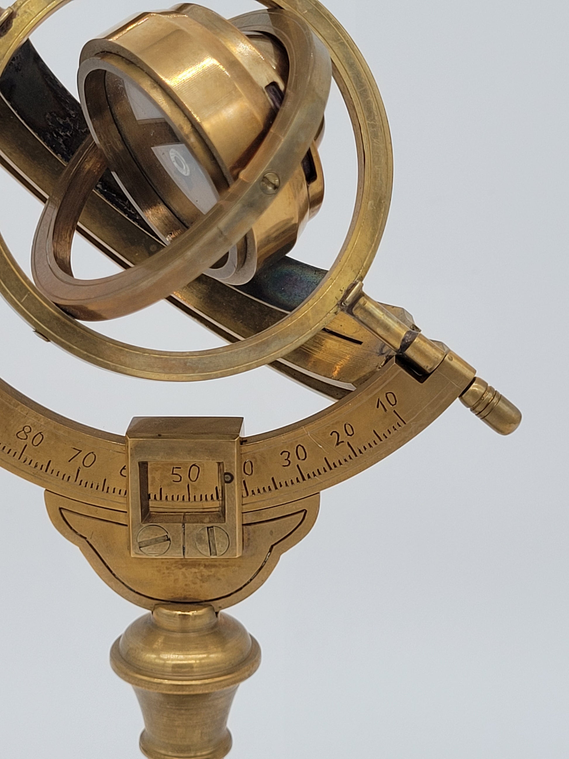 Im Zentrum befindet sich ein kleiner Kompass, der von mehreren beweglichen Ringen eingefasst ist. Auf den Ringen sind Gradskalen zur Messung eingraviert, die zusammen mit den Ortsangaben die historische Nutzung solcher Instrumente als Anschauungs- und Lehrmittel für Astronomie und Navigation unterstreichen.
