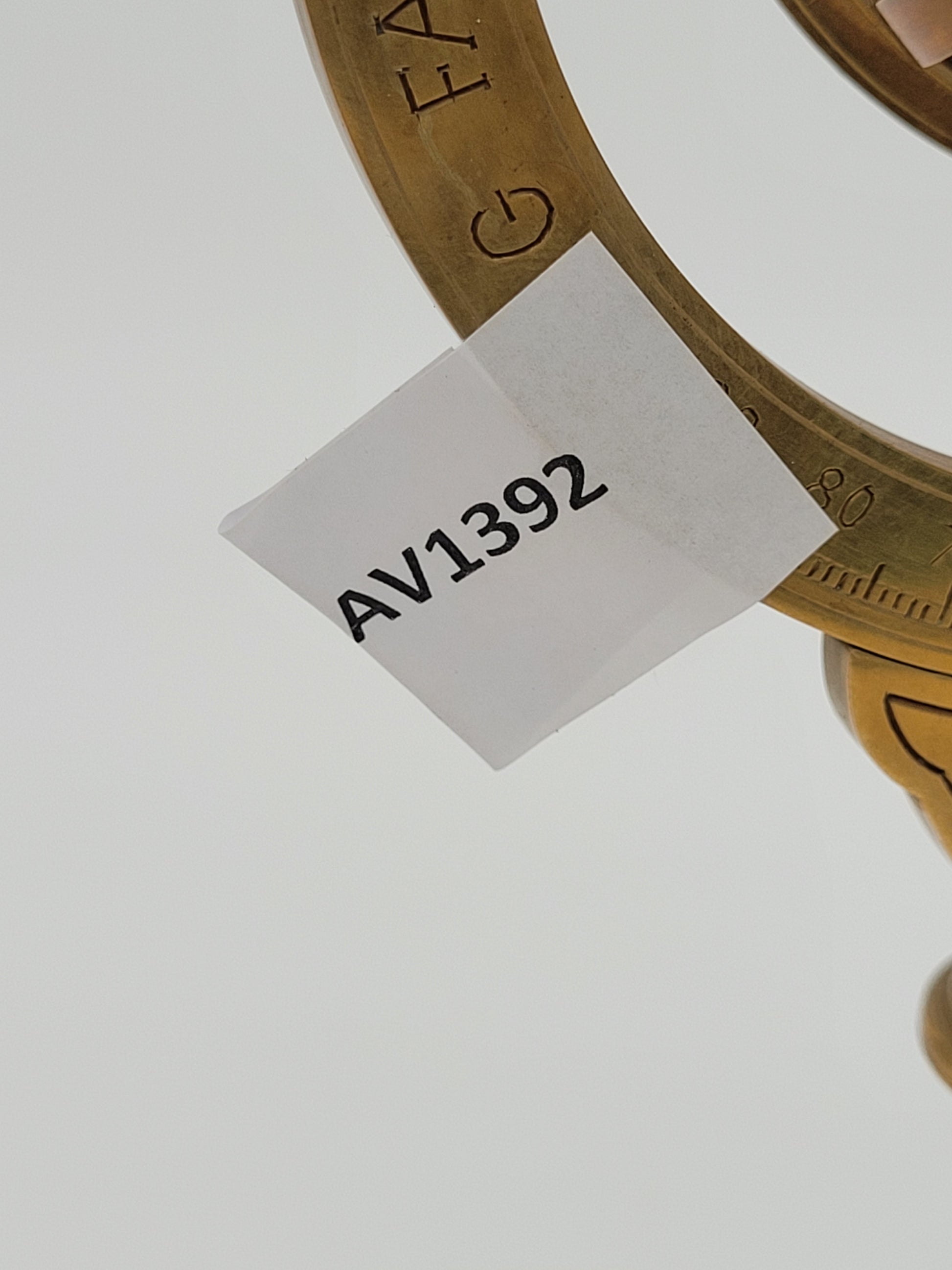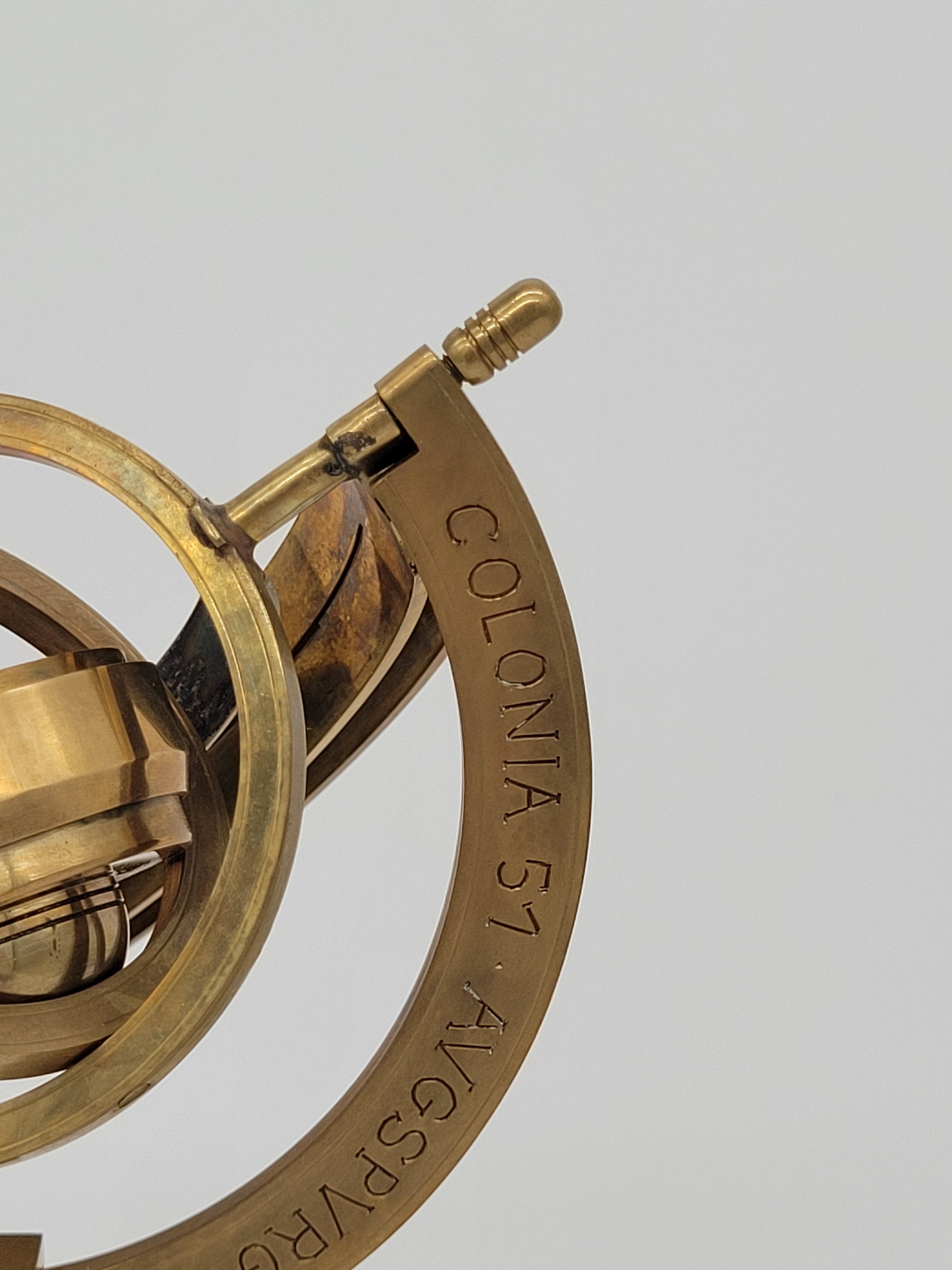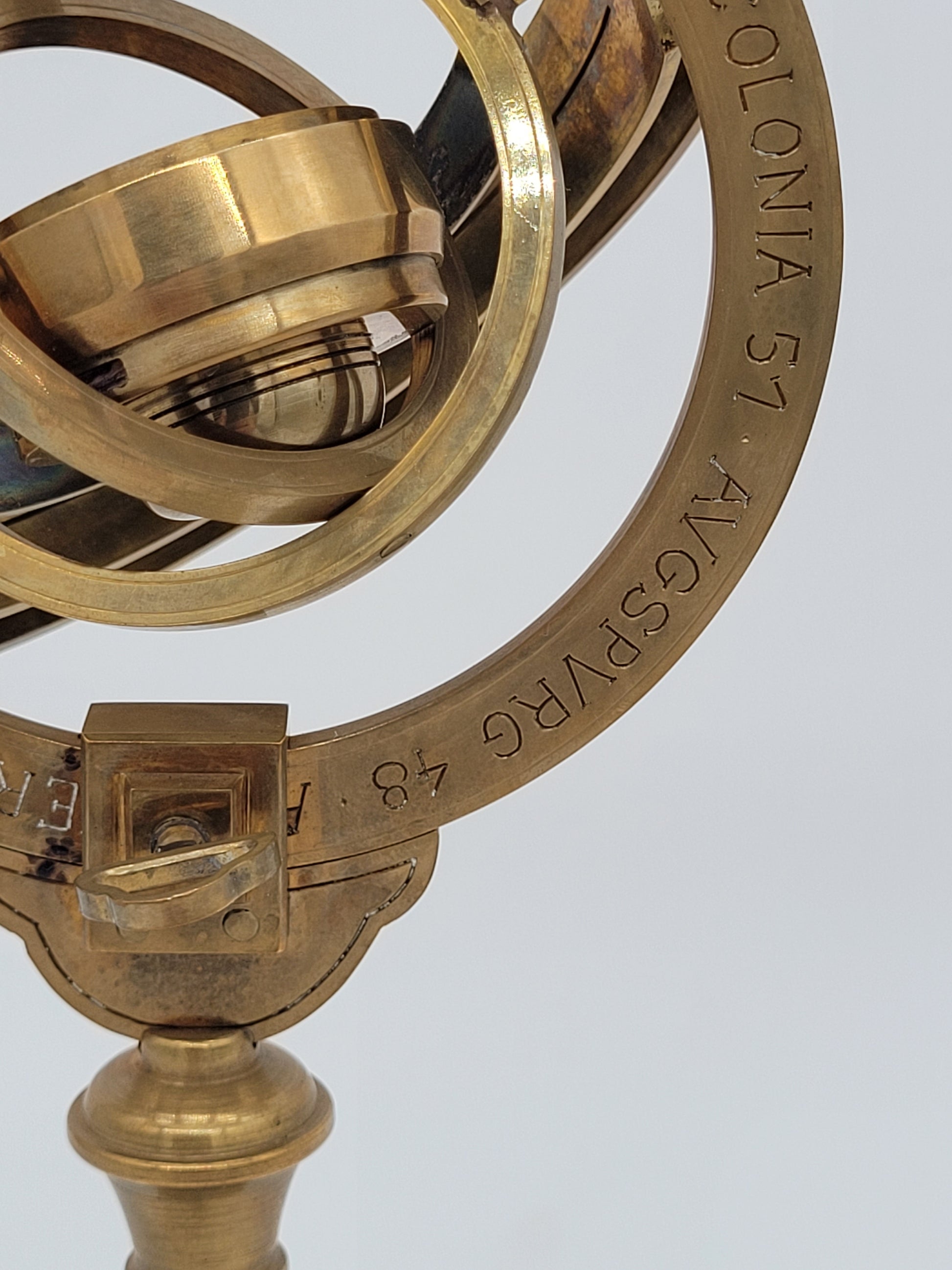 Diese Armillarsphäre aus Messing ist aufwendig gearbeitet und trägt Gravuren, die sich an historischen Vorbildern orientieren. Besonders hervorzuheben ist die Gravur „PG FACIBAT 1692“, welche auf ein traditionelles Herstellungsdatum verweist, sowie Ortsangaben wie „COLONIA“ und „AVGSBVRG“ (Köln und Augsburg). Solche Inschriften sind typisch für Reproduktionen klassischer wissenschaftlicher Instrumente.