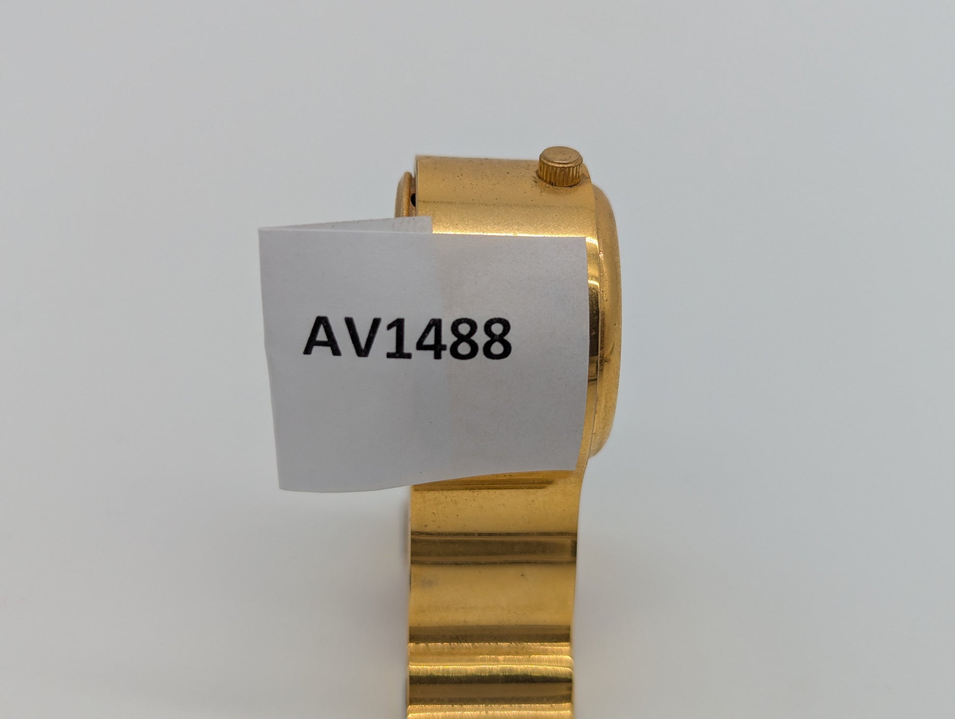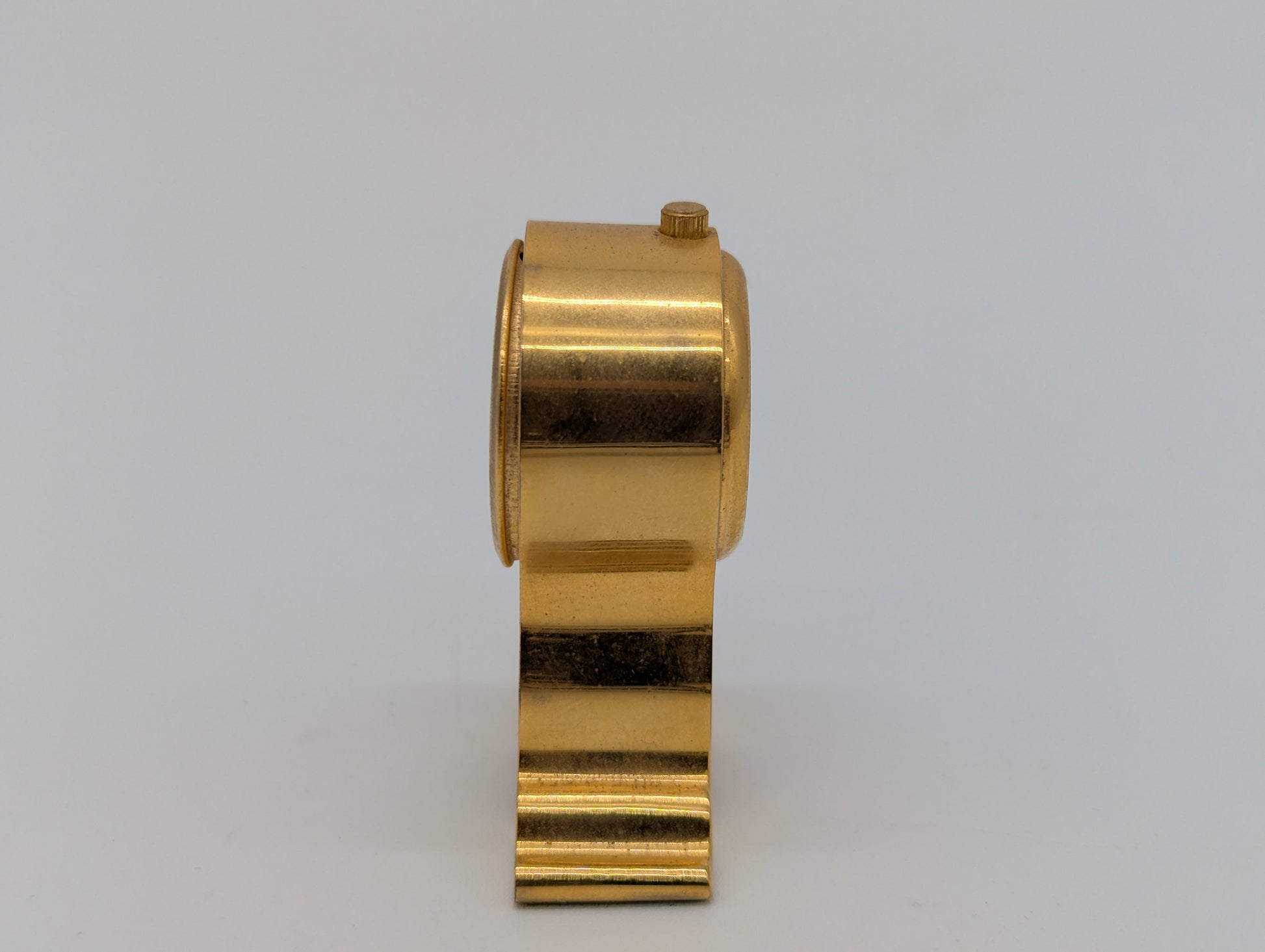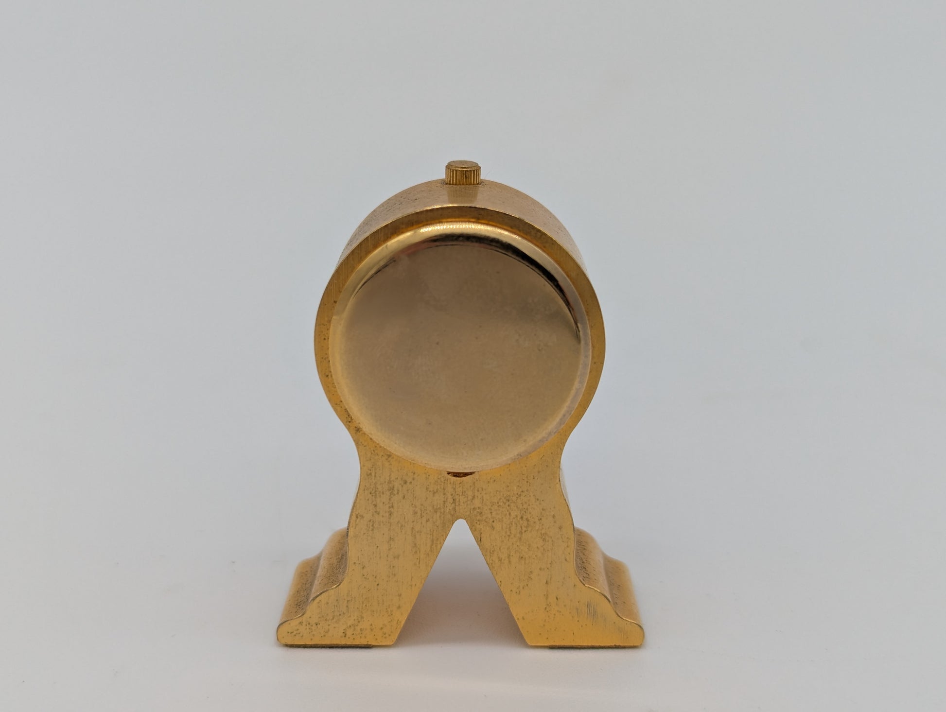 Angeboten wird eine kleine Miniatur Tischuhr im eleganten goldfarbenen Design. Die Uhr besteht aus einem massiven Metallgehäuse mit glänzender Oberfläche und einem weißen Zifferblatt mit schwarzen Ziffern.