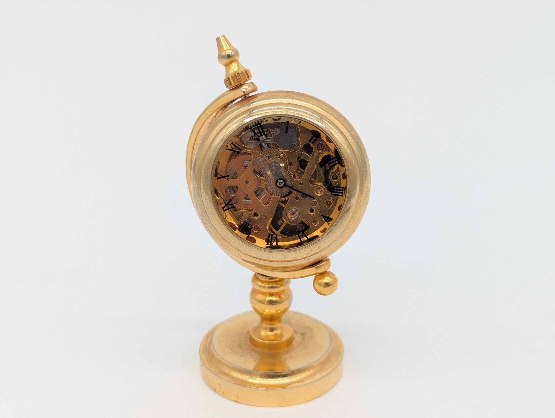 Die Uhr steht auf einem runden Sockel mit verziertem Ständer, wodurch sie an eine kleine Weltkugel erinnert. Das Zifferblatt verfügt über römische Ziffern und filigrane Zeiger, die dem Stück einen eleganten Vintage-Charme verleihen.