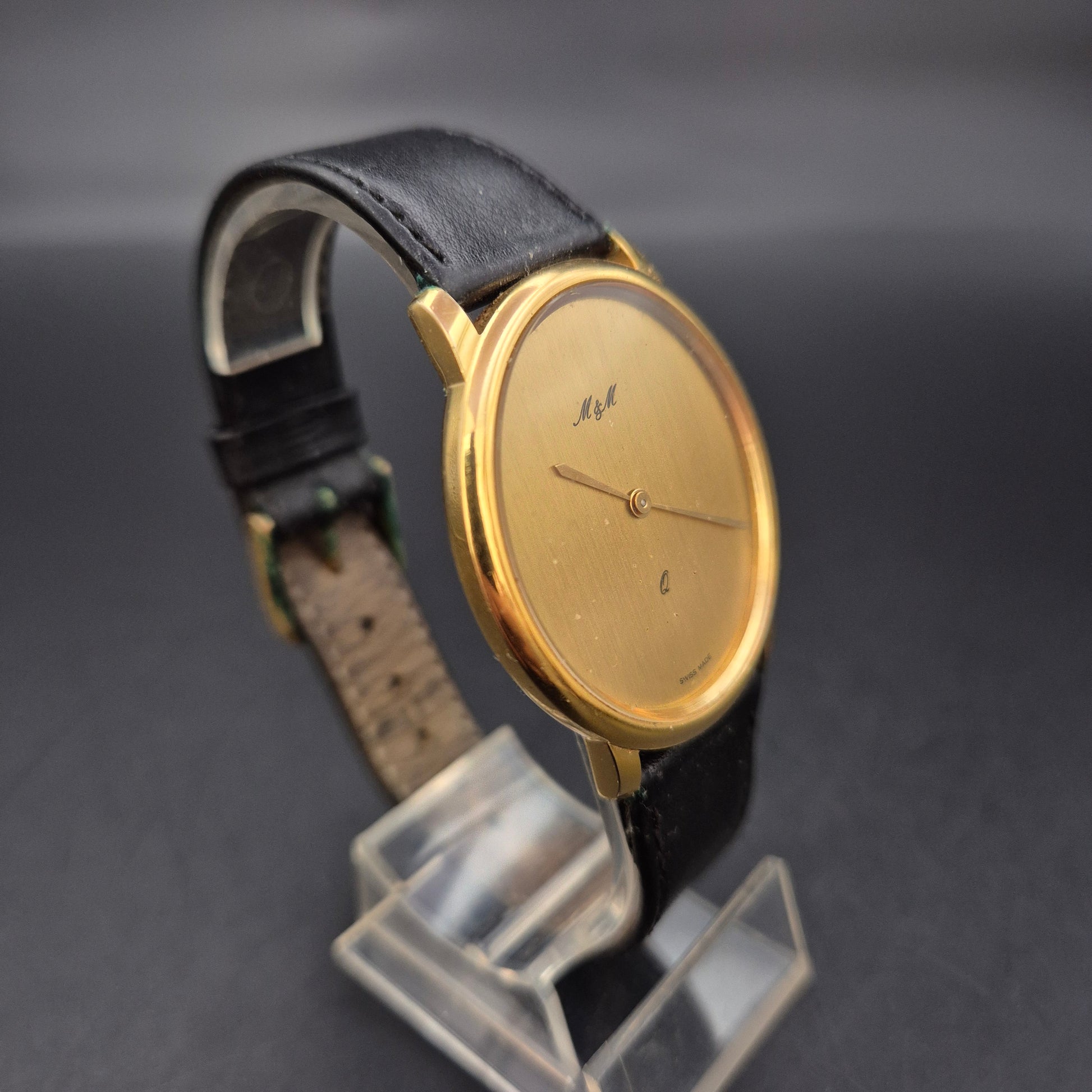 Diese elegante M&M Herren Uhr aus der Schweiz überzeugt durch ein minimalistisches Design mit goldfarbenem Zifferblatt und schlankem Gehäuse. Das schlichte schwarze Lederarmband ergänzt das edle Erscheinungsbild perfekt. Eine stilvolle Wahl für Männer, die Understatement und Qualität schätzen.