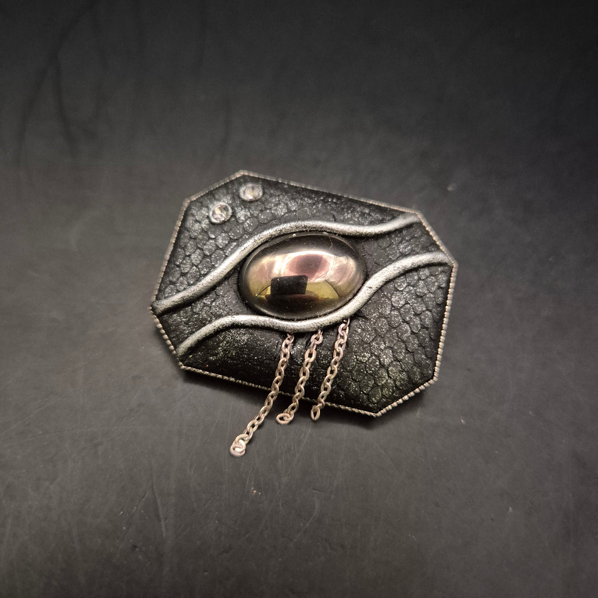 Diese auffällige Brosche besticht durch ihr geometrisches Design und kontrastreiche Materialien. Die achteckige Grundform in Schwarz wird von einer silbernen Metallfassung umrahmt. Im Zentrum sitzt ein ovaler, glänzender Glas-Cabochon, flankiert von zwei funkelnden Strasssteinen. Vier filigrane Metallkettchen hängen dekorativ herab und verleihen dem Schmuckstück Dynamik und Eleganz. Ein präziser Nadelverschluss sorgt für sicheren Halt an jeder Kleidung.