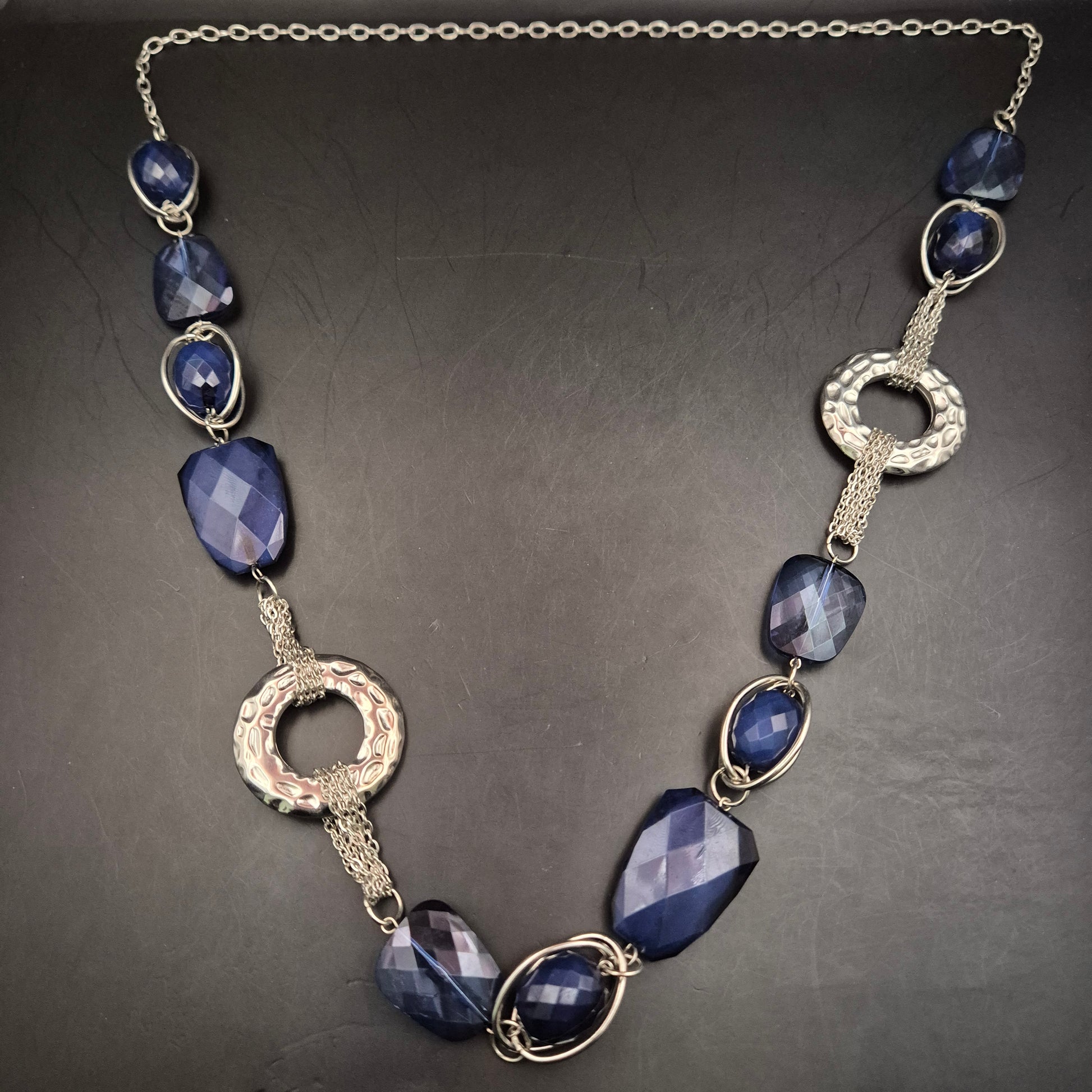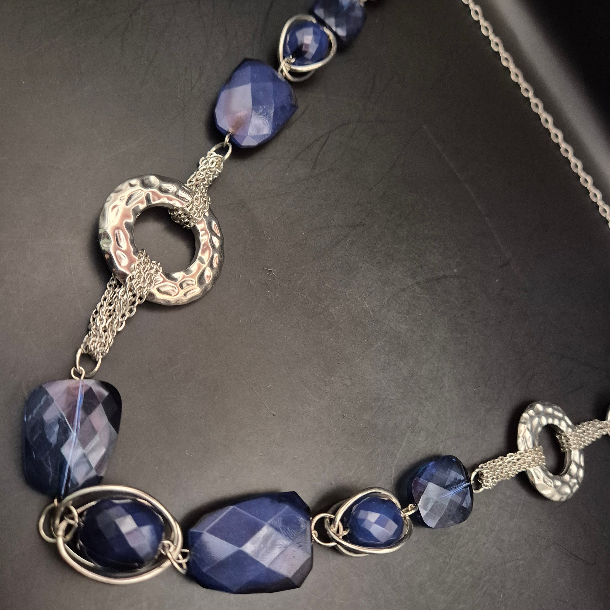 Diese auffällige Halskette kombiniert tiefblaue, facettierte Schmucksteine mit gehämmerten, silberfarbenen Ringen und feinen Kettenelementen. Die geometrischen Formen und die Kontraste zwischen den Materialien verleihen der Kette einen modernen, stilvollen Charakter – ideal für modische Outfits mit einem Hauch Eleganz.