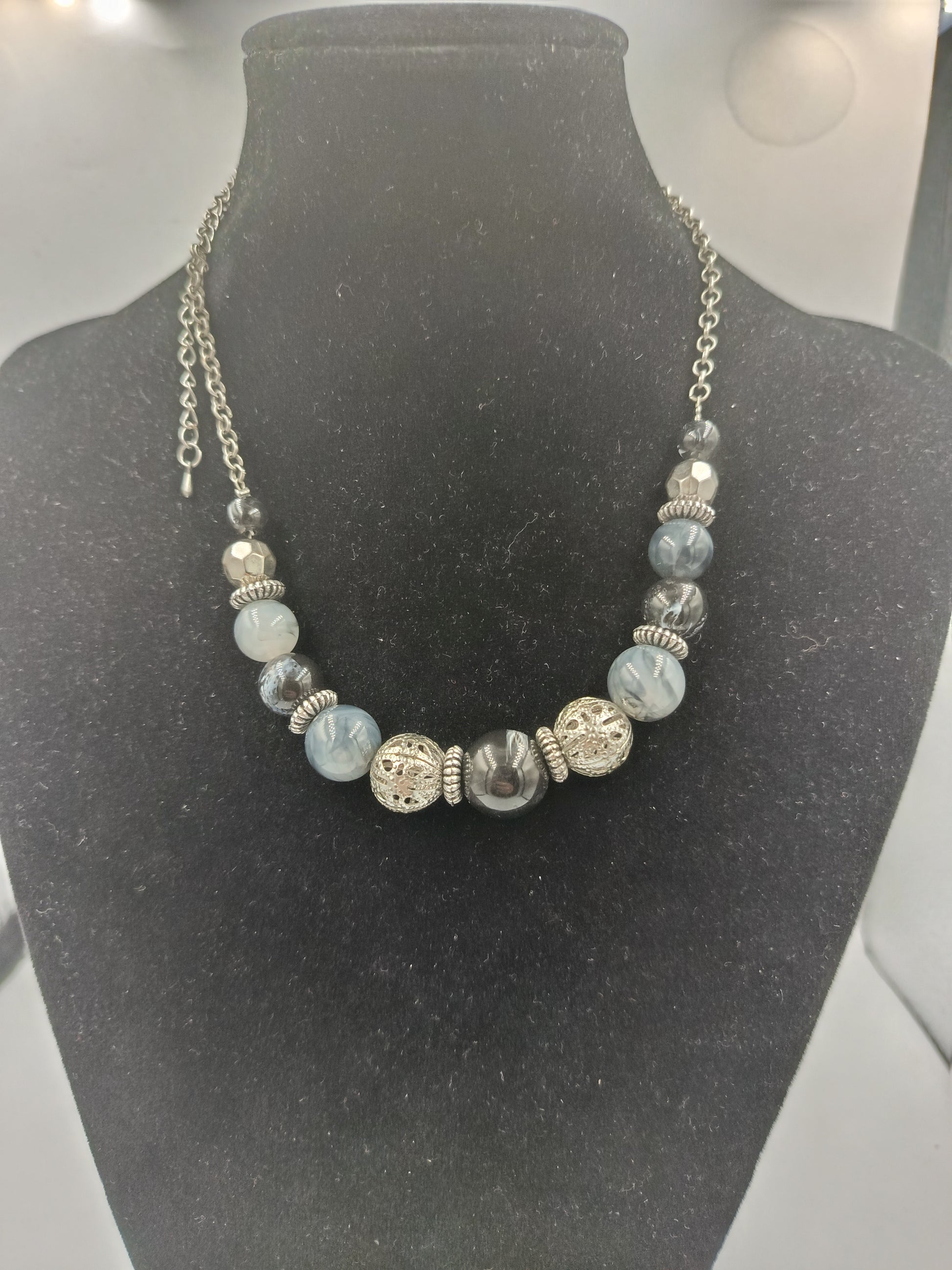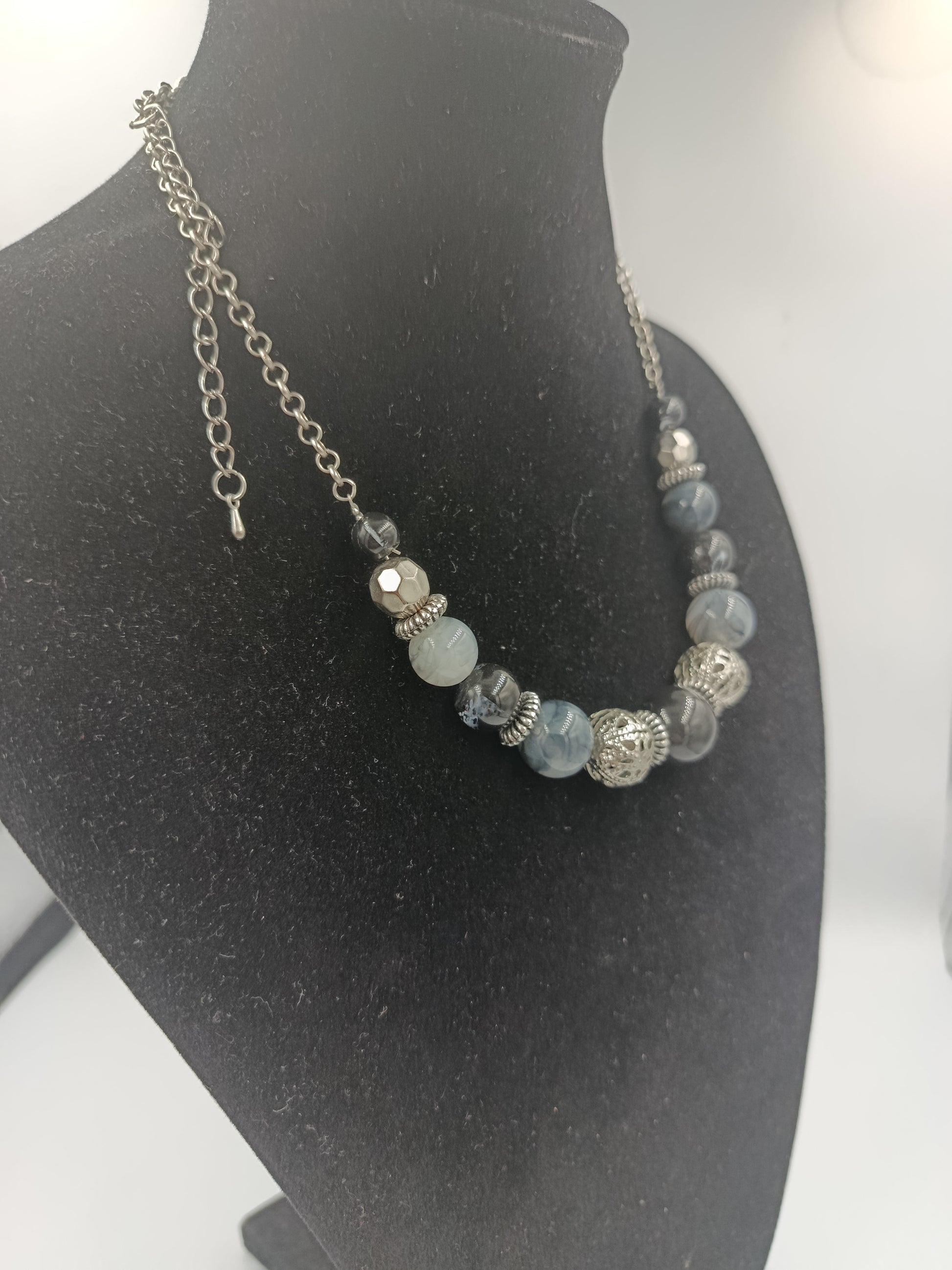 Dieses stilvolle Collier vereint kühle Eleganz mit modernem Design. Verschieden strukturierte Perlen – von glänzenden Glasperlen in Grau- und Blautönen bis zu filigran gearbeiteten Metallperlen – reihen sich zu einer harmonischen Komposition. Die Kombination aus glatten, facettierten und durchbrochenen Elementen verleiht dem Schmuckstück Tiefe und eine faszinierende Optik.