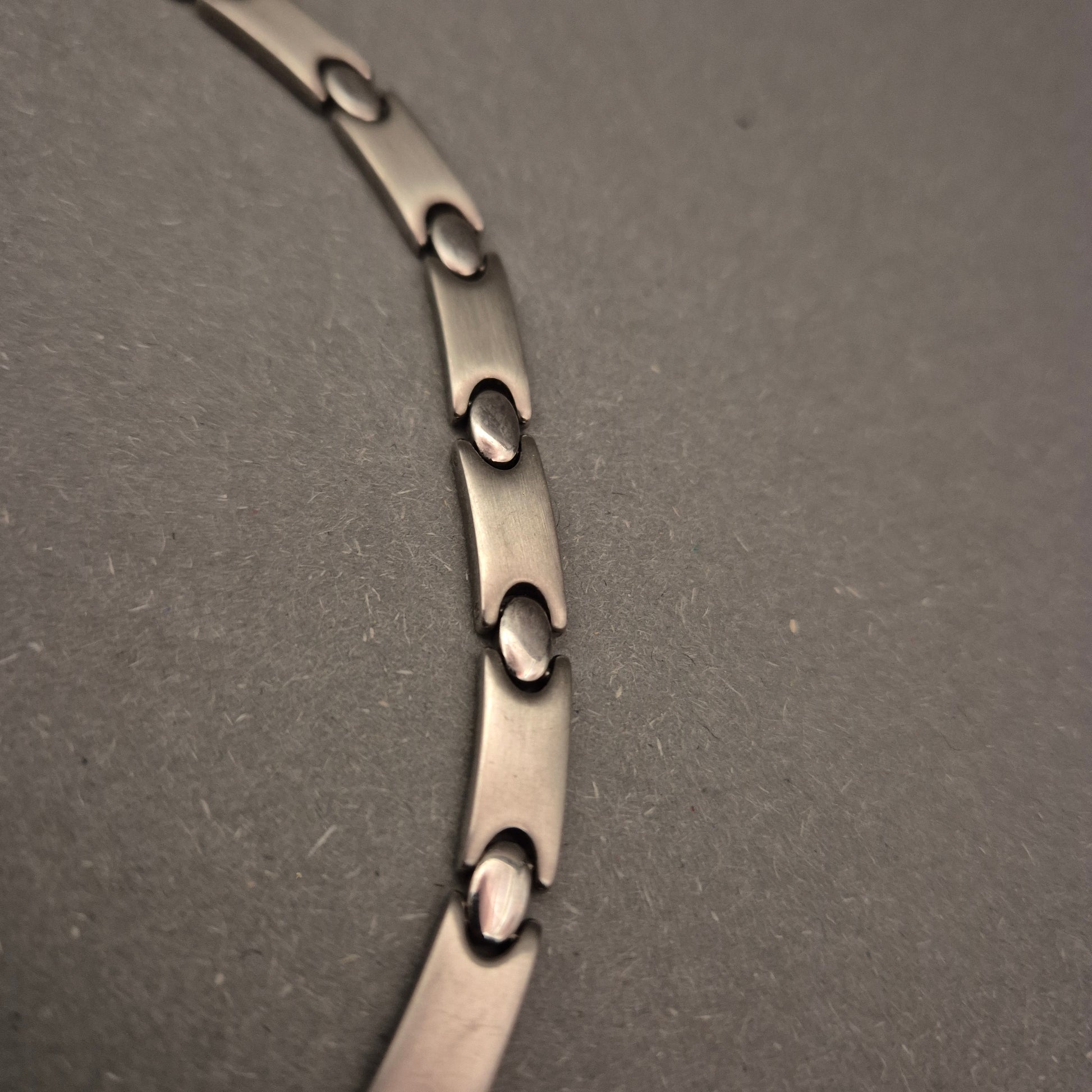 Dieses moderne Glieder-Collier besticht durch seine schlichte Eleganz und sein flaches, minimalistisches Design. Die Kette besteht aus einer abwechselnden Sequenz von matt gebürsteten und polierten silberfarbenen Gliedern, die bei Bewegung einen subtilen Glanz erzeugen und eine spannende optische Textur bieten. Die hochwertige Metall-Optik (vermutlich in Richtung Edelstahl) macht dieses Collier zu einem robusten und vielseitigen Schmuckstück. Es eignet sich perfekt als stilvolles Statement für den modernen Business-Look oder als tägliches Accessoire, das durch seine klaren Linien überzeugt.