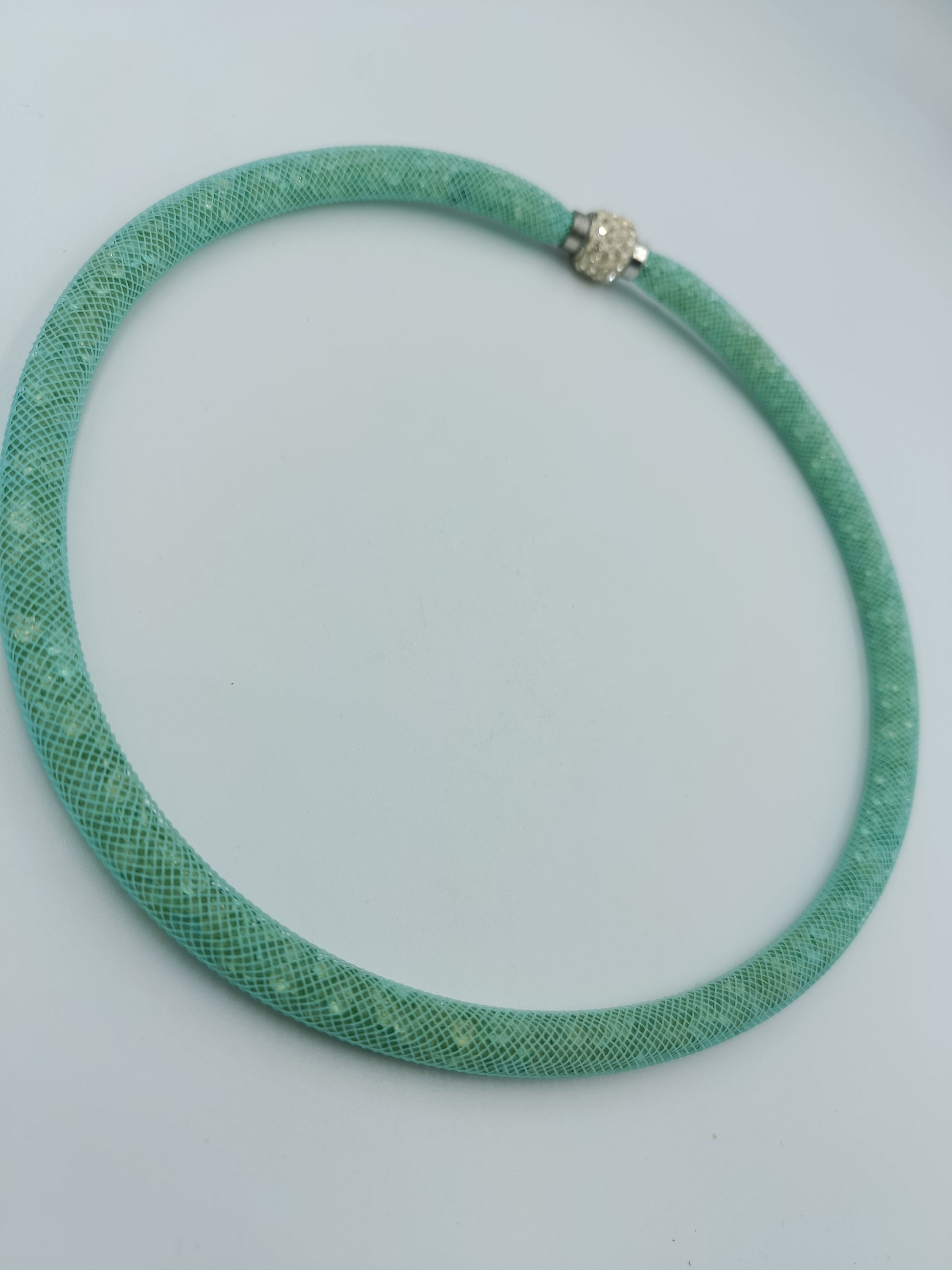 Diese moderne Collier-Kette zieht durch ihr frisches Design alle Blicke auf sich. Das türkise Netzband ist mit funkelnden Kügelchen gefüllt, die bei Bewegung leicht schimmern. Abgerundet wird das Design durch einen praktischen Magnetverschluss, der mit klaren Strasssteinen besetzt ist. Ideal als trendiges Accessoire für Alltag und Party.