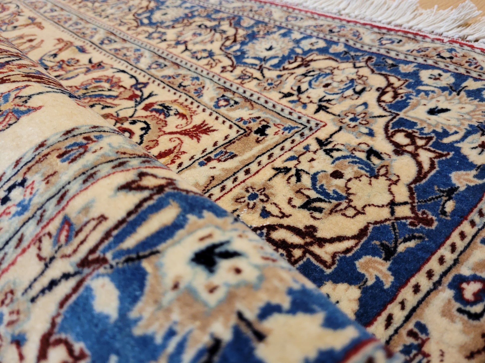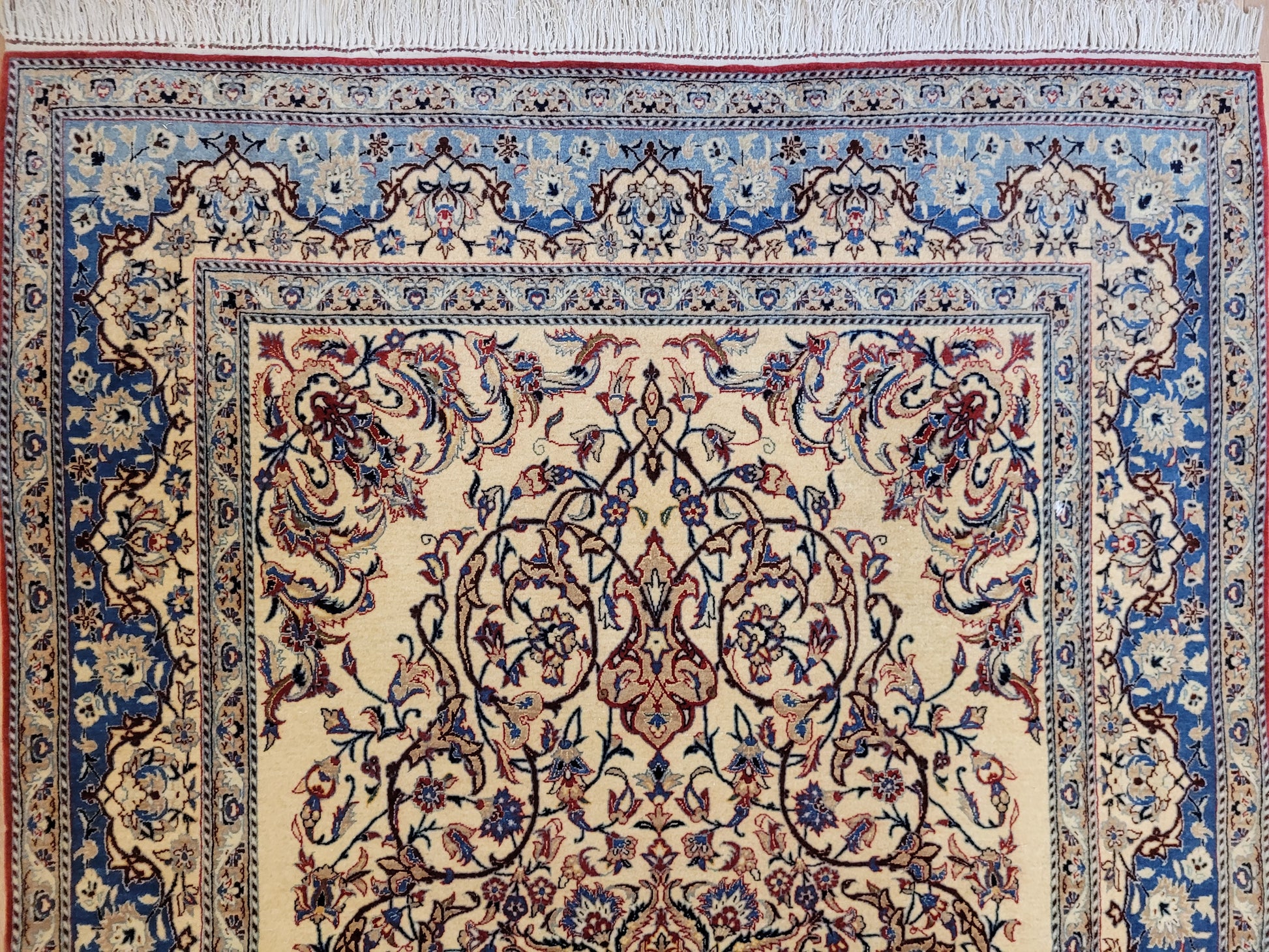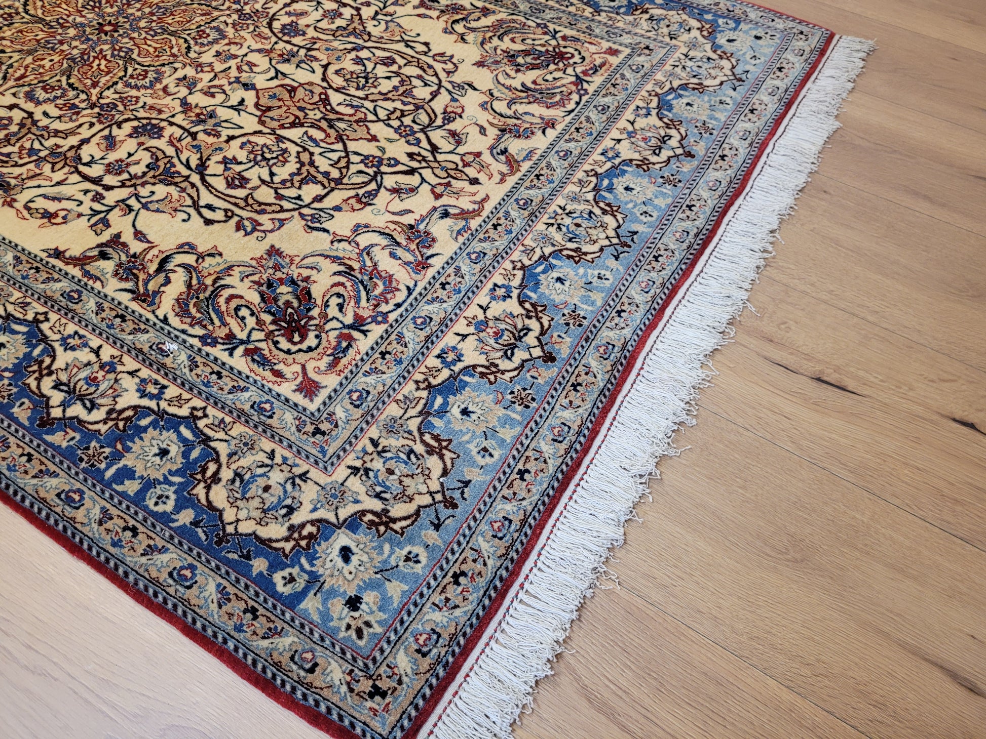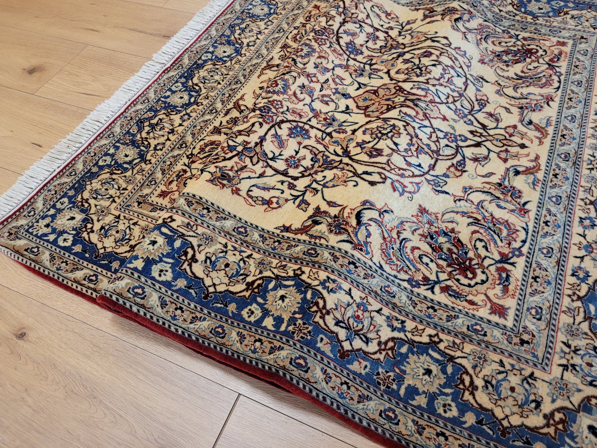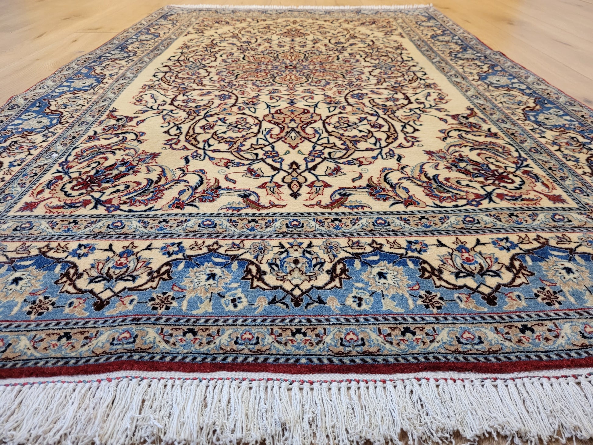 angeboten wird ein eleganter Nain Teppich, handgeknüpft aus feiner Wolle mit Seidenakzenten. Das Design zeigt ein reich verziertes Zentralmedaillon auf hellem Fond, umgeben von geschwungenen Rankenornamenten und floralen Details. Die Bordüre in Blau mit Blütenmotiven rahmt das Kunstwerk harmonisch ein und betont die ausgewogene Komposition.