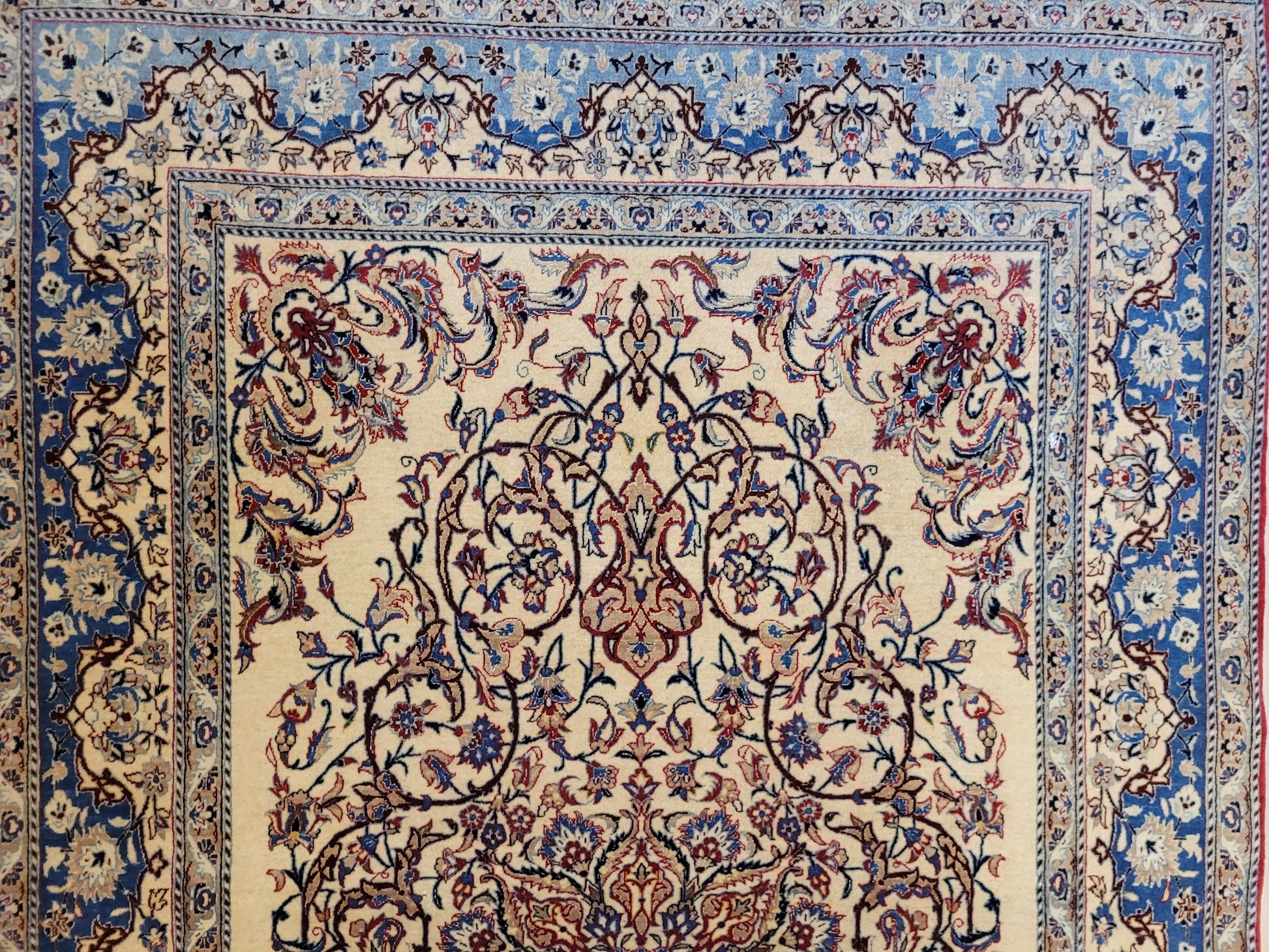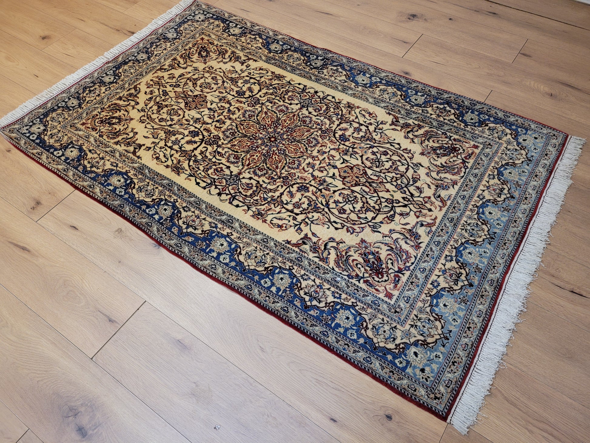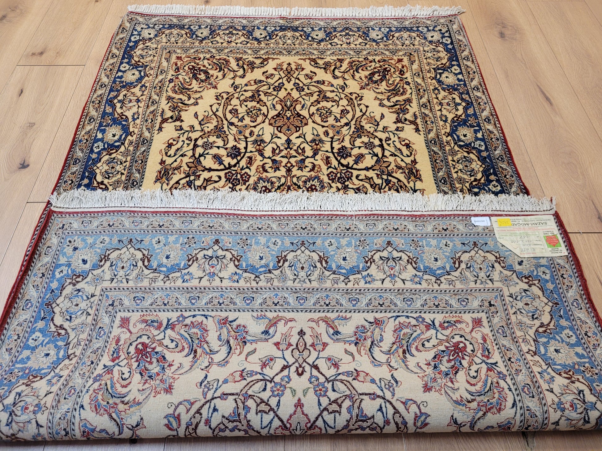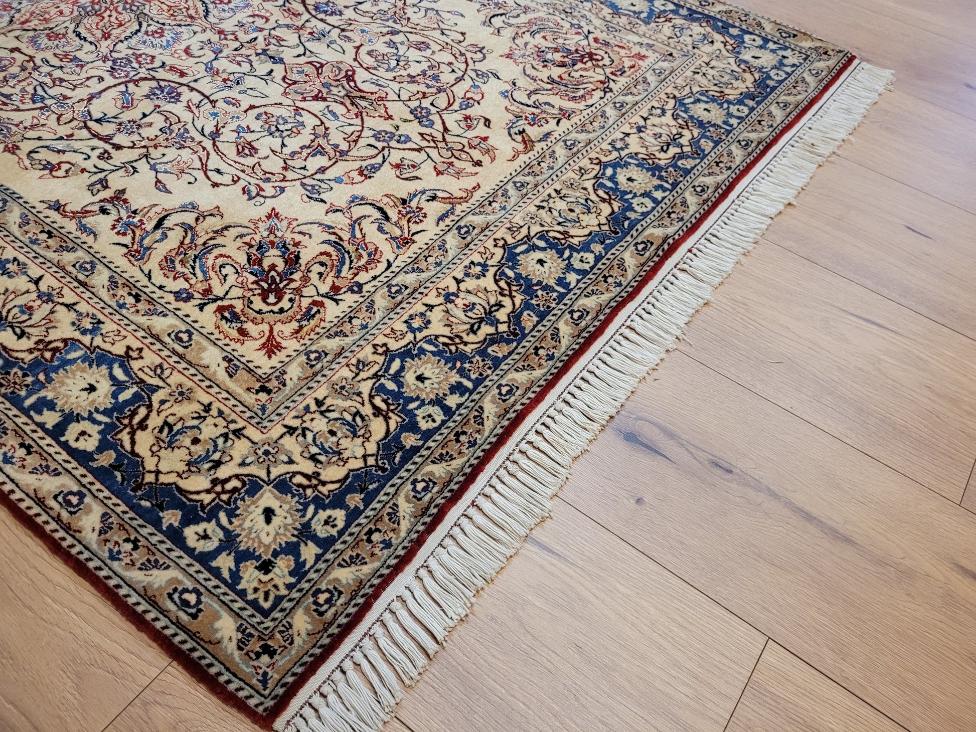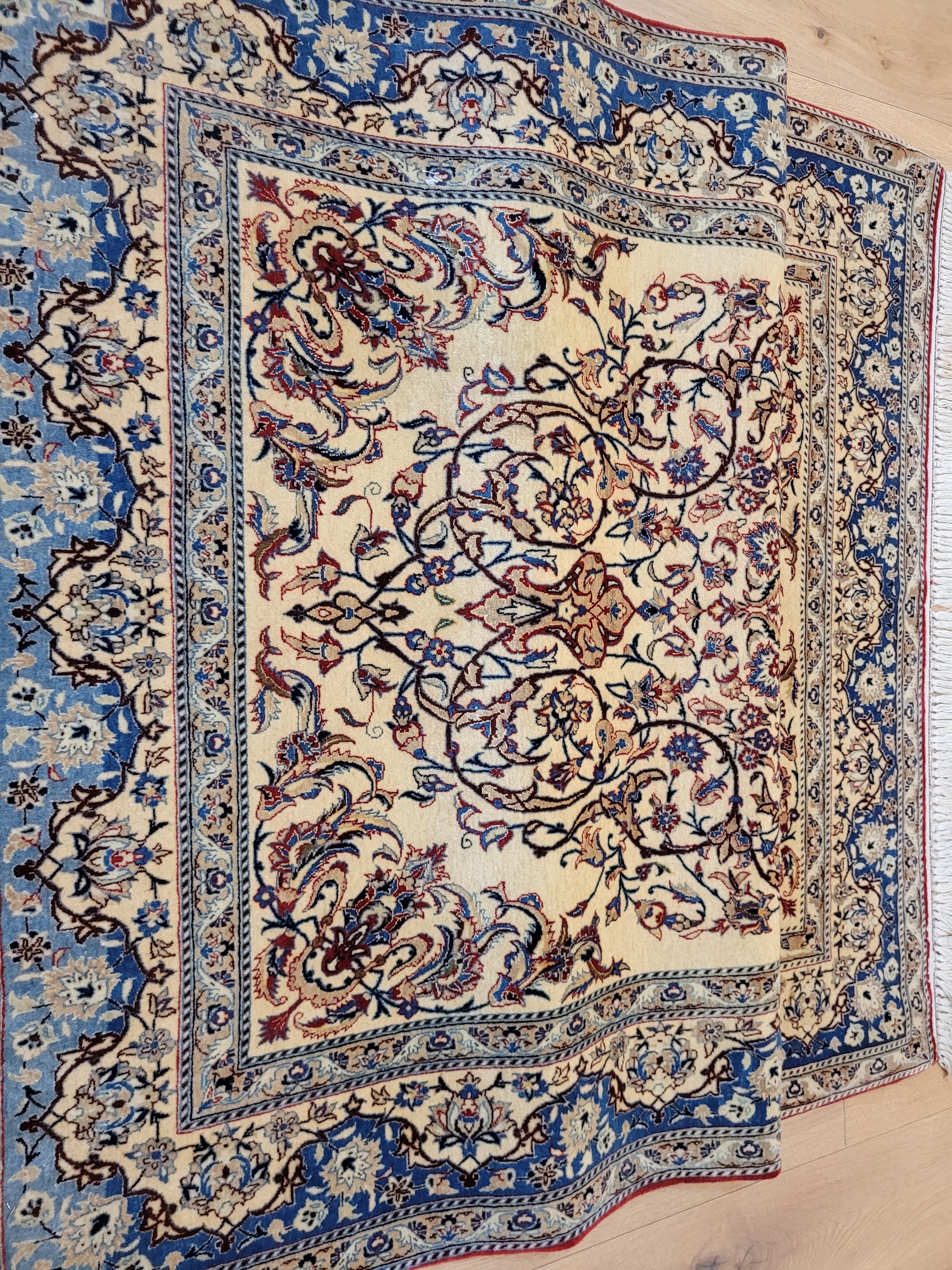 angeboten wird ein eleganter Nain Teppich, handgeknüpft aus feiner Wolle mit Seidenakzenten. Das Design zeigt ein reich verziertes Zentralmedaillon auf hellem Fond, umgeben von geschwungenen Rankenornamenten und floralen Details. Die Bordüre in Blau mit Blütenmotiven rahmt das Kunstwerk harmonisch ein und betont die ausgewogene Komposition.