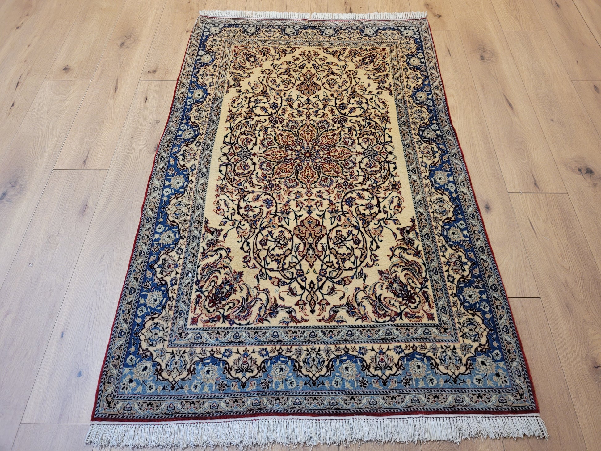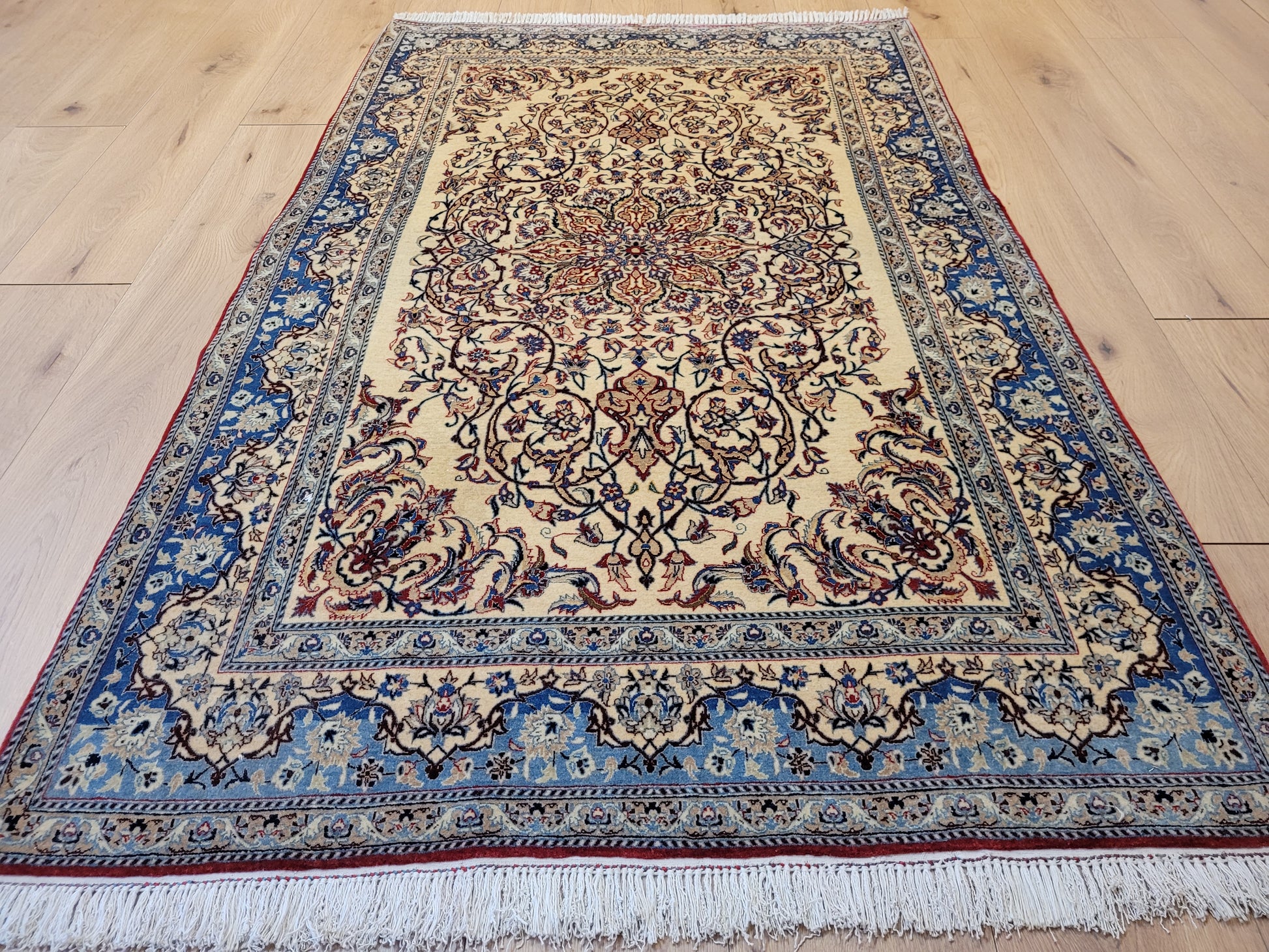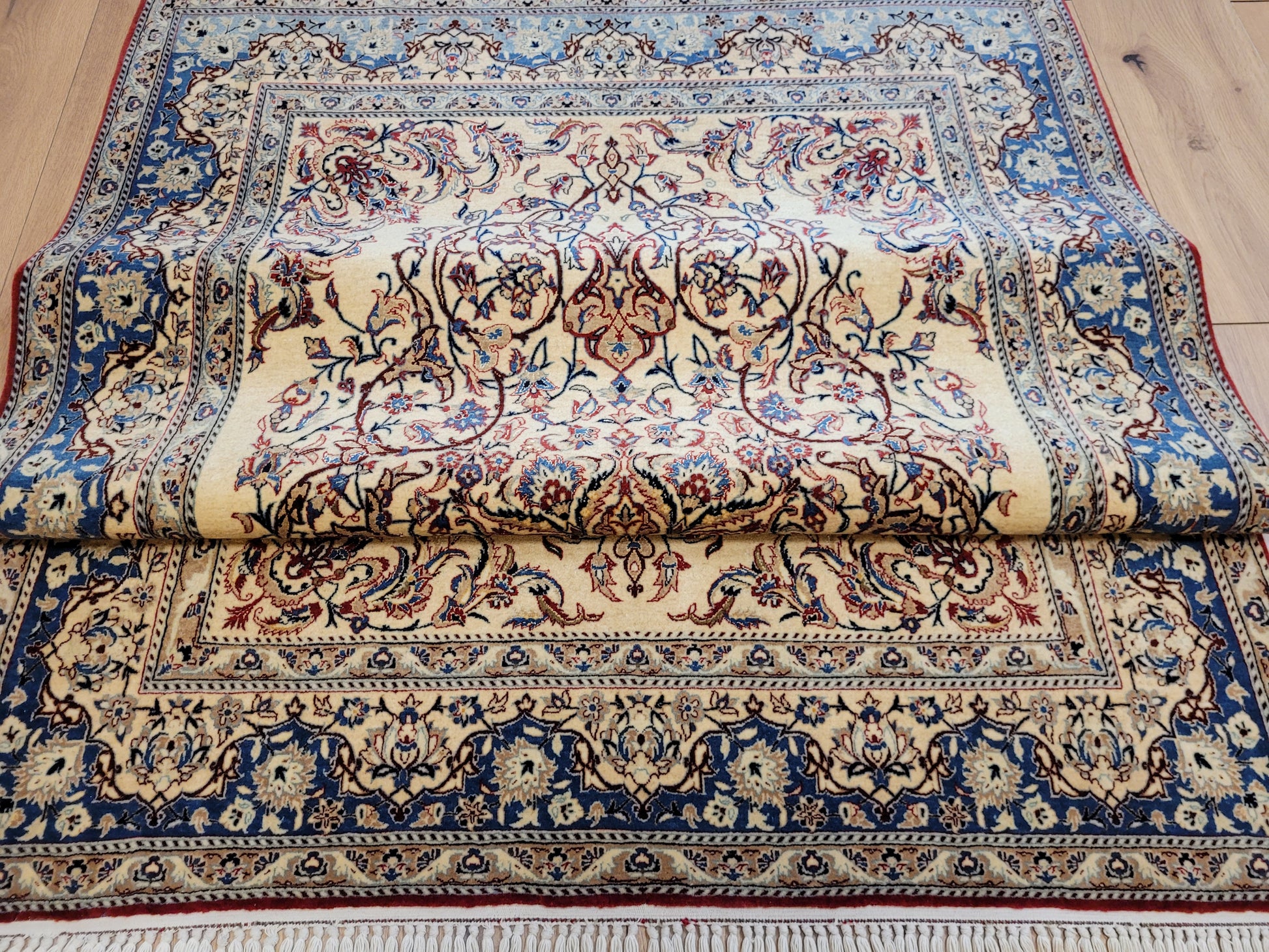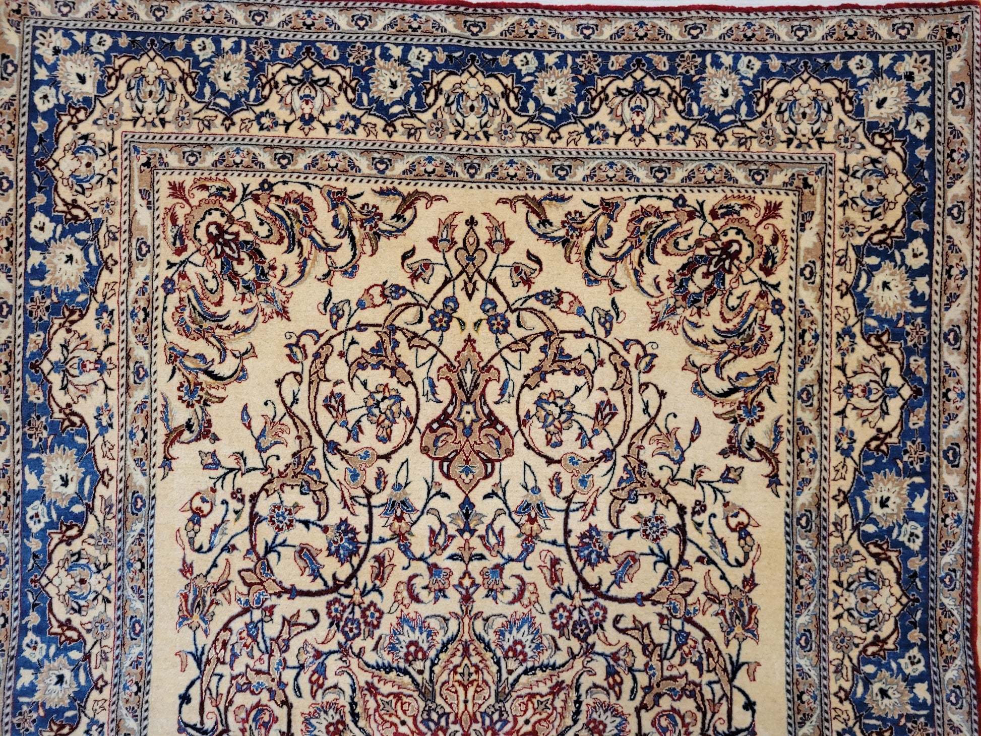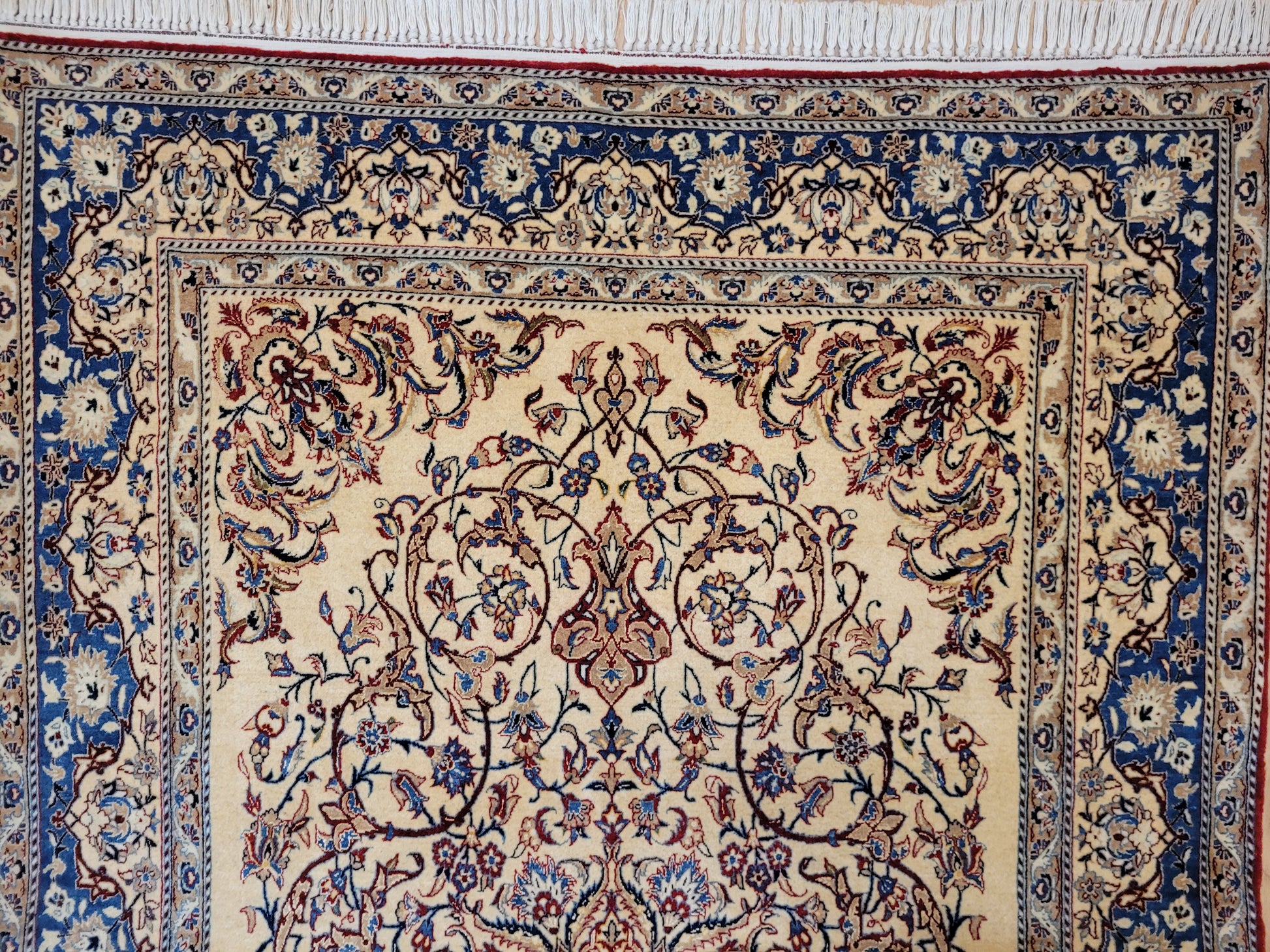 angeboten wird ein eleganter Nain Teppich, handgeknüpft aus feiner Wolle mit Seidenakzenten. Das Design zeigt ein reich verziertes Zentralmedaillon auf hellem Fond, umgeben von geschwungenen Rankenornamenten und floralen Details. Die Bordüre in Blau mit Blütenmotiven rahmt das Kunstwerk harmonisch ein und betont die ausgewogene Komposition.