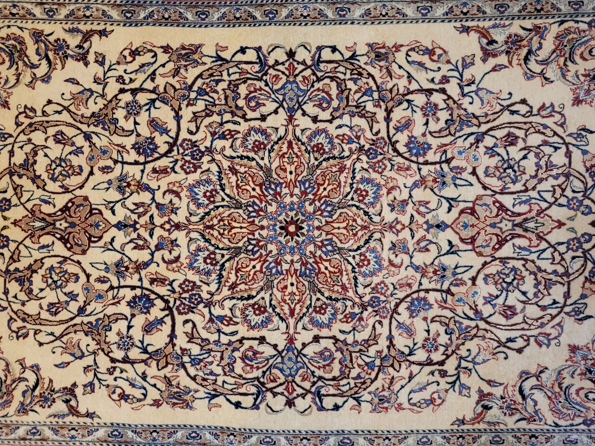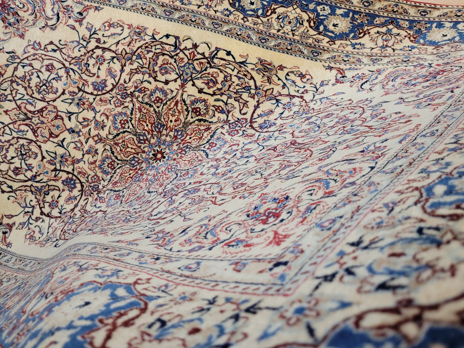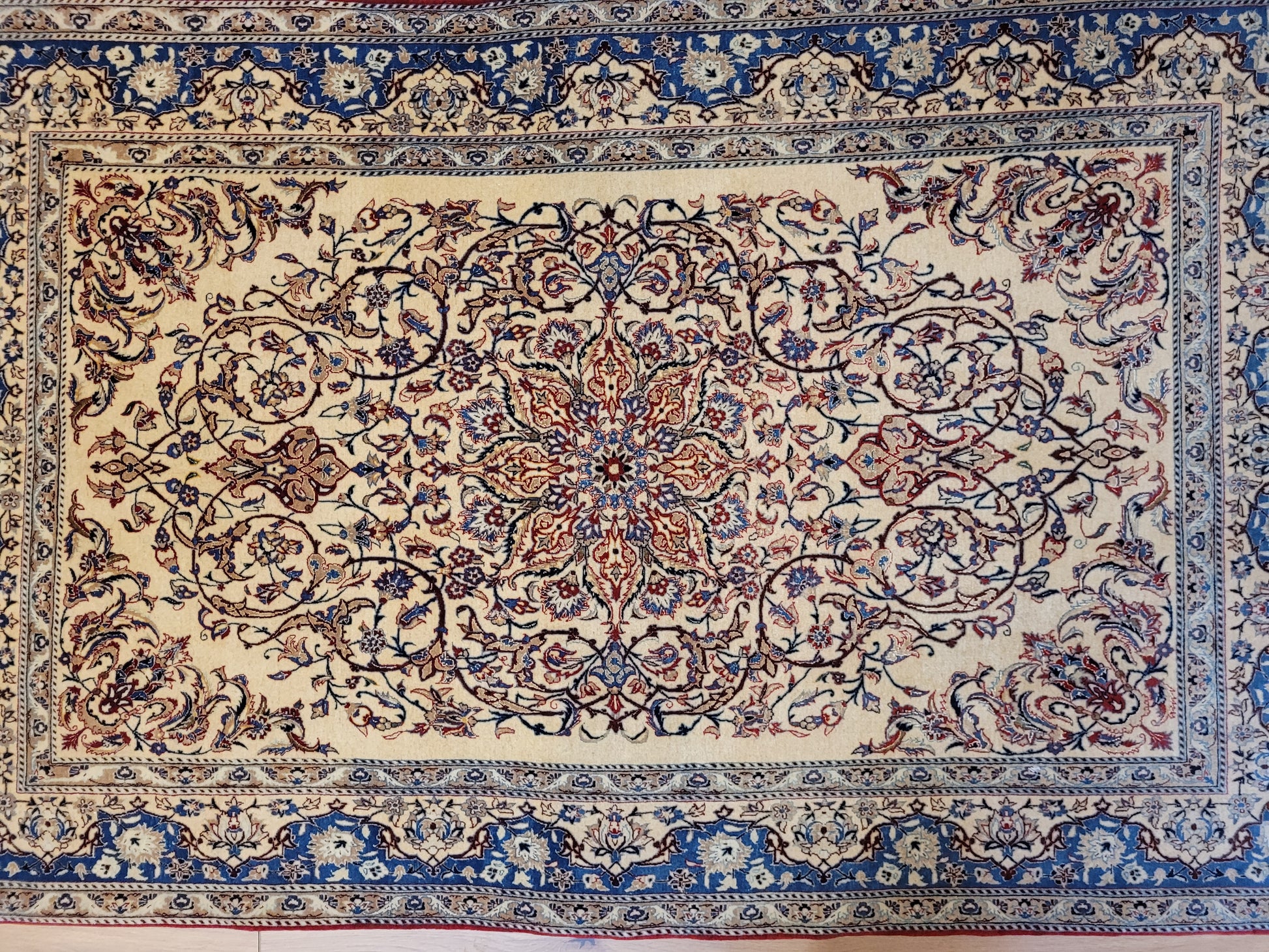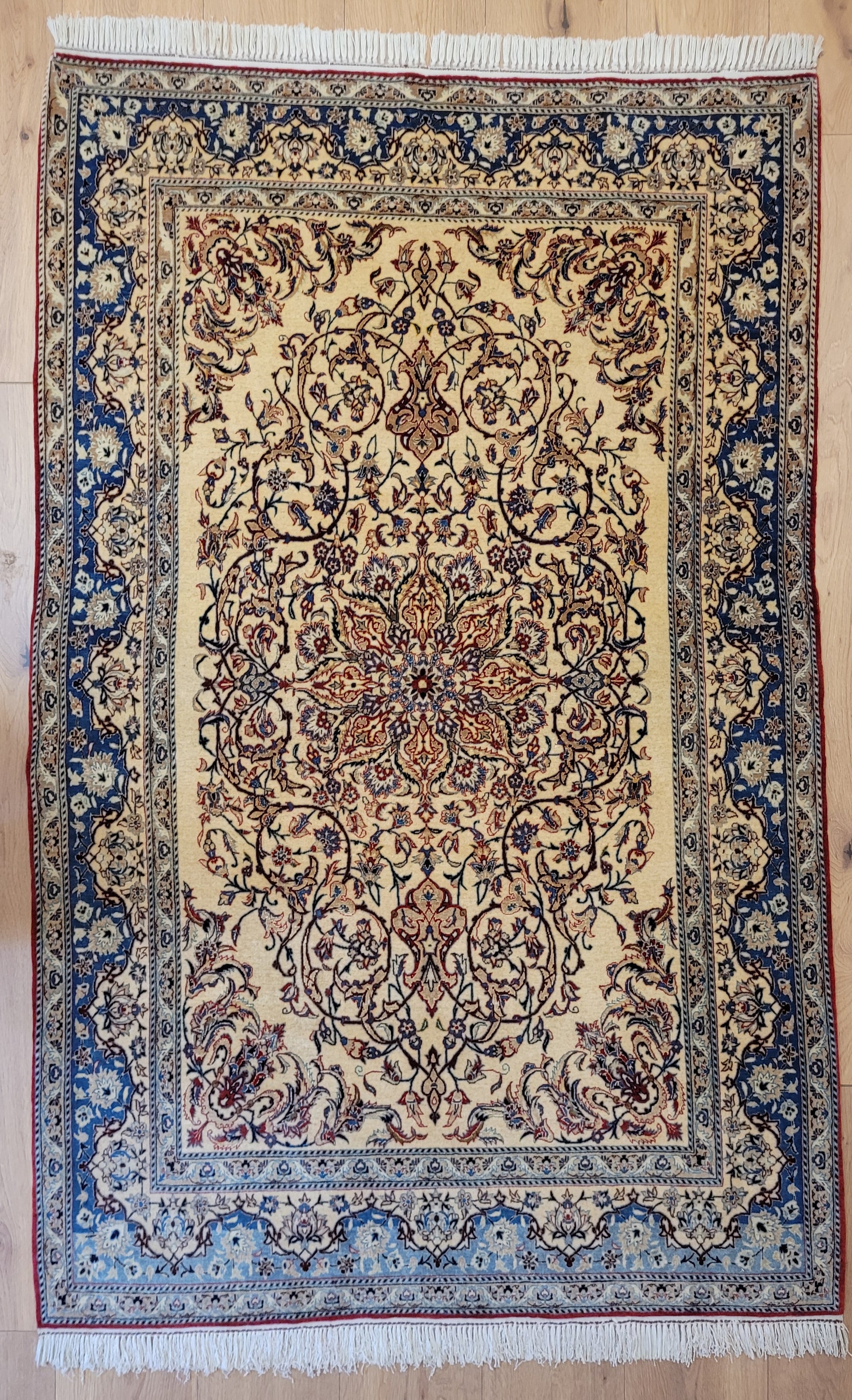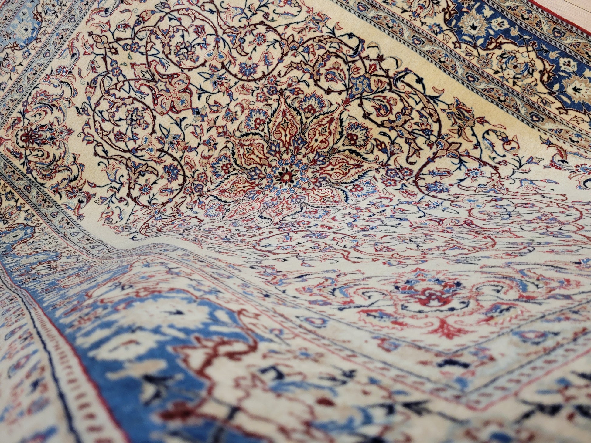 angeboten wird ein eleganter Nain Teppich, handgeknüpft aus feiner Wolle mit Seidenakzenten. Das Design zeigt ein reich verziertes Zentralmedaillon auf hellem Fond, umgeben von geschwungenen Rankenornamenten und floralen Details. Die Bordüre in Blau mit Blütenmotiven rahmt das Kunstwerk harmonisch ein und betont die ausgewogene Komposition.