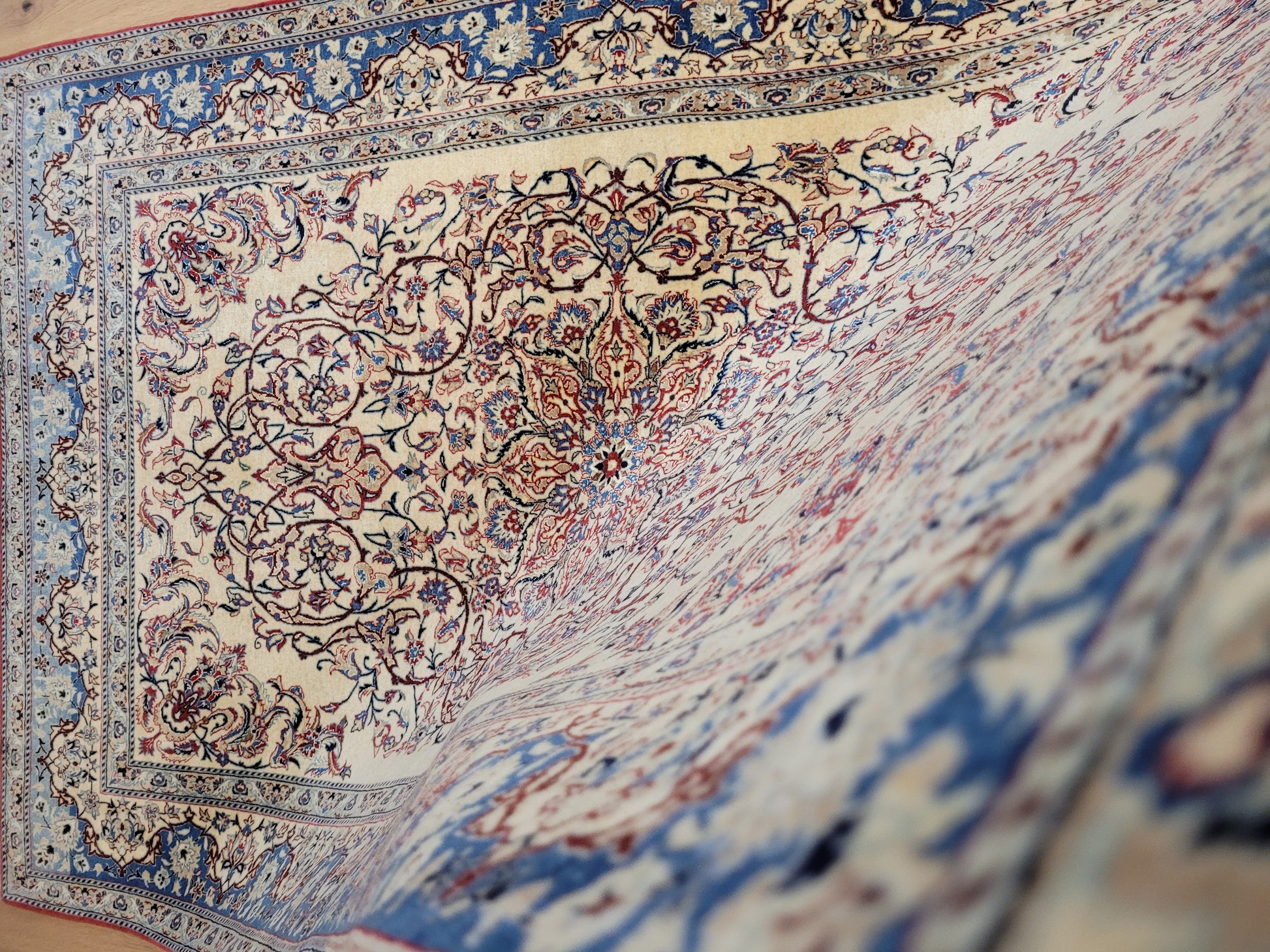 Sehr guter, gepflegter Zustand. Klare Farben und feinste Knüpfkunst. Die Bilder sind Teil der Zustandsbeschreibung.