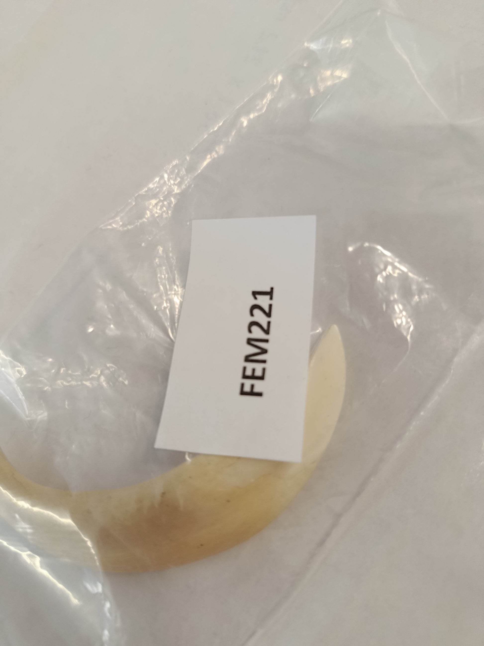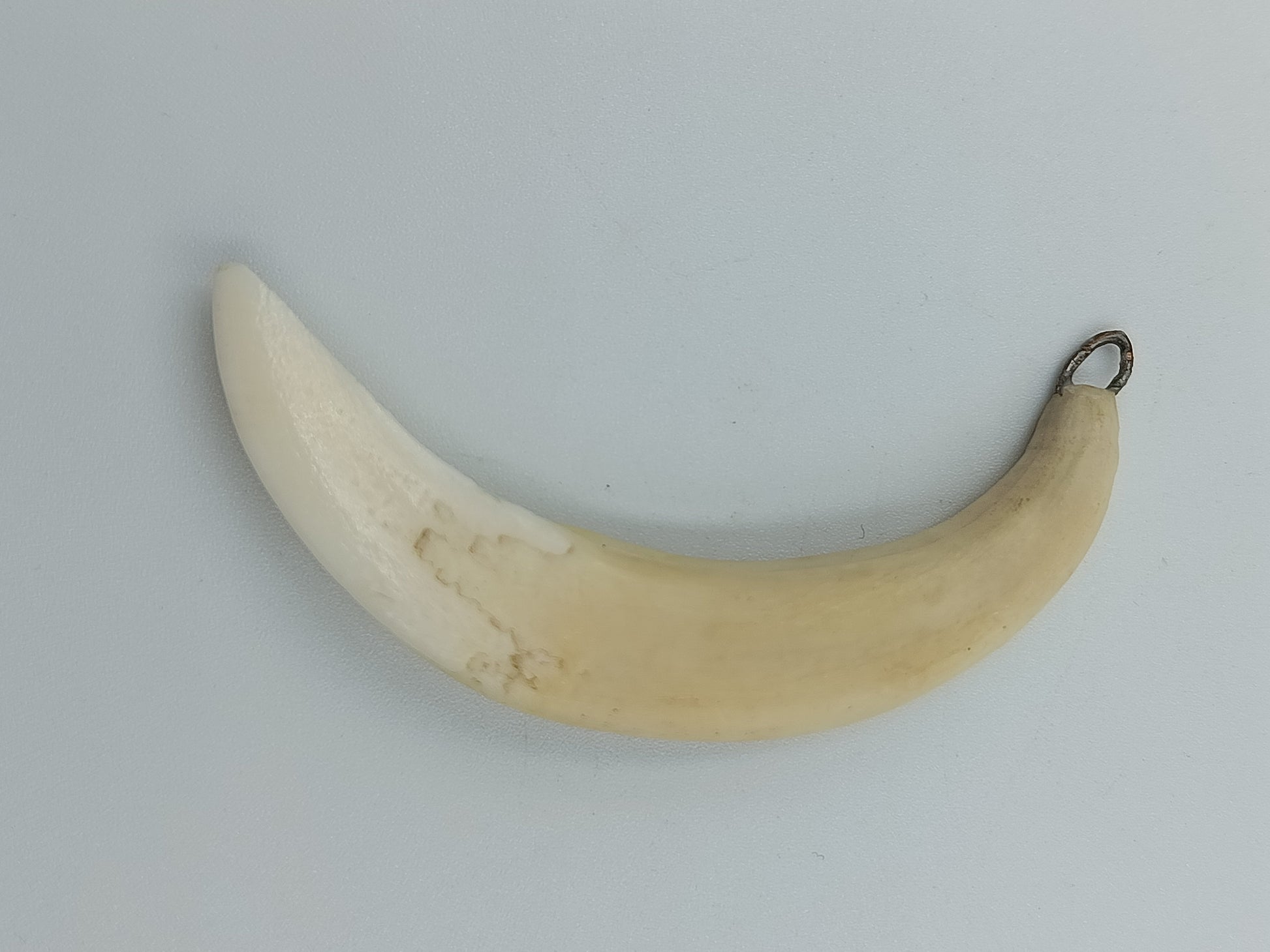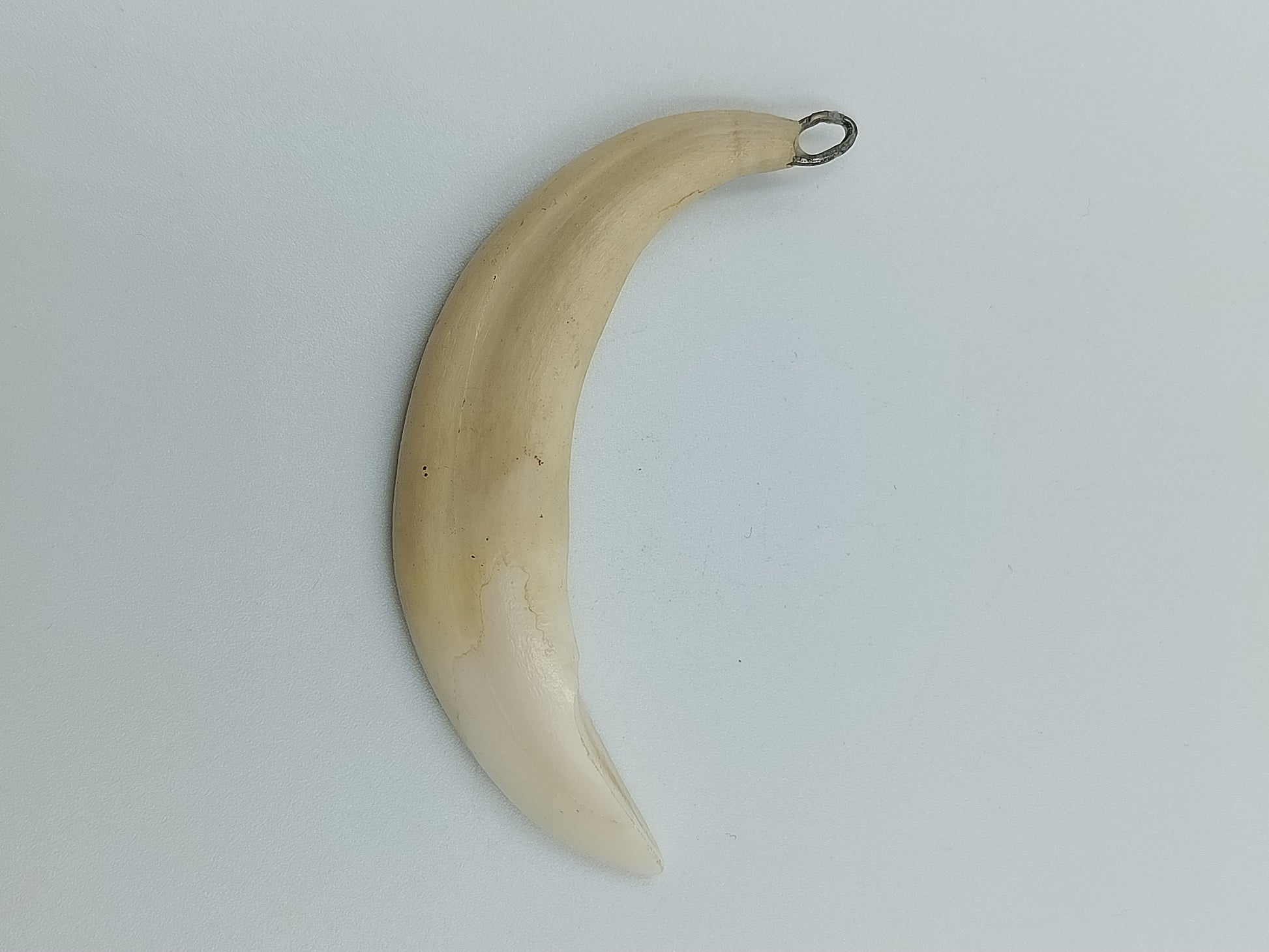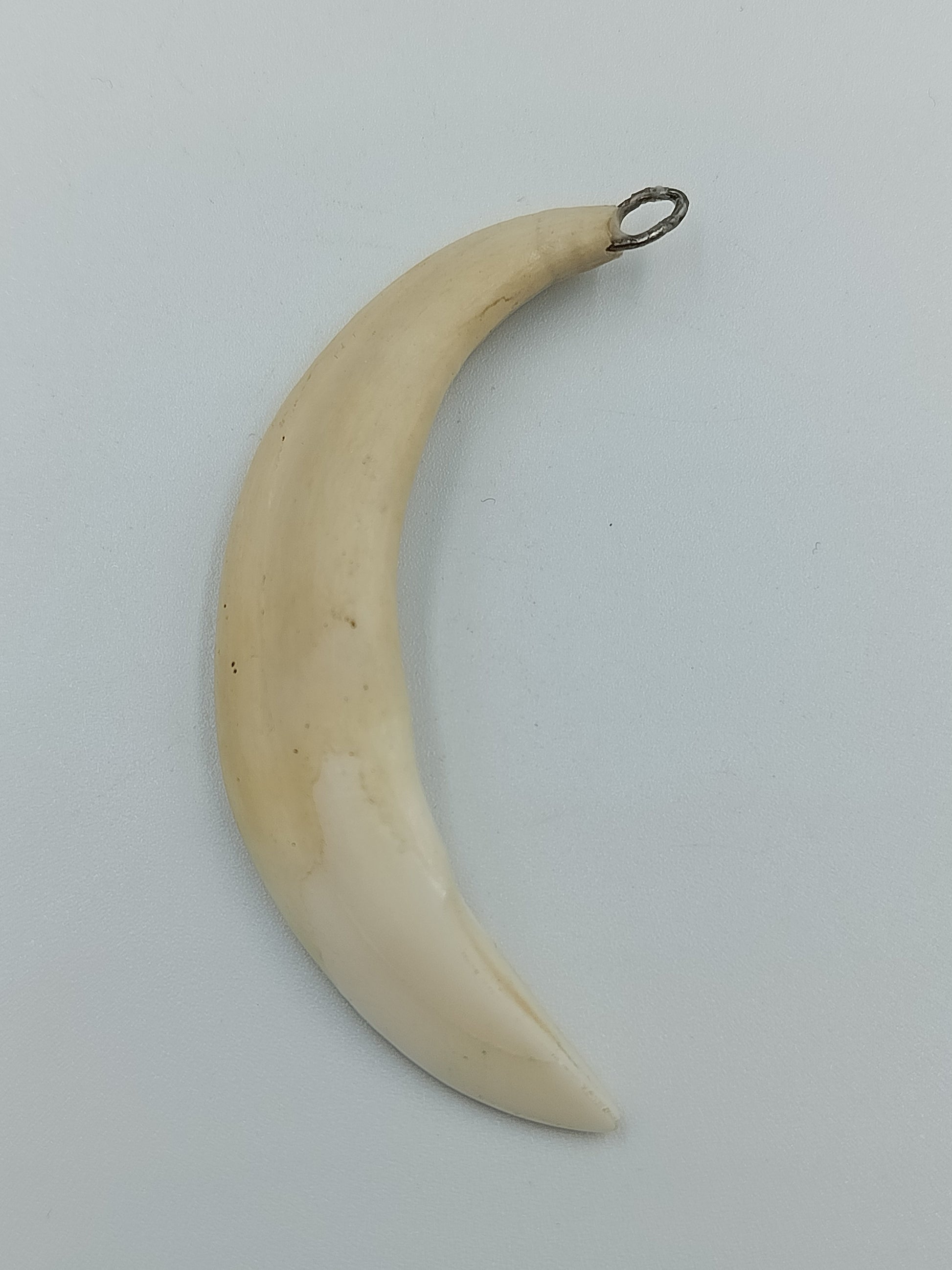 Rustikaler Anhänger aus einem echten Wildschweinzahn. Das naturbelassene Stück hat eine schöne, geschwungene Form und eine warme, cremefarbene Patina. Am oberen Ende befindet sich eine kleine Metallöse zum Befestigen an einer Kette oder einem Lederband.