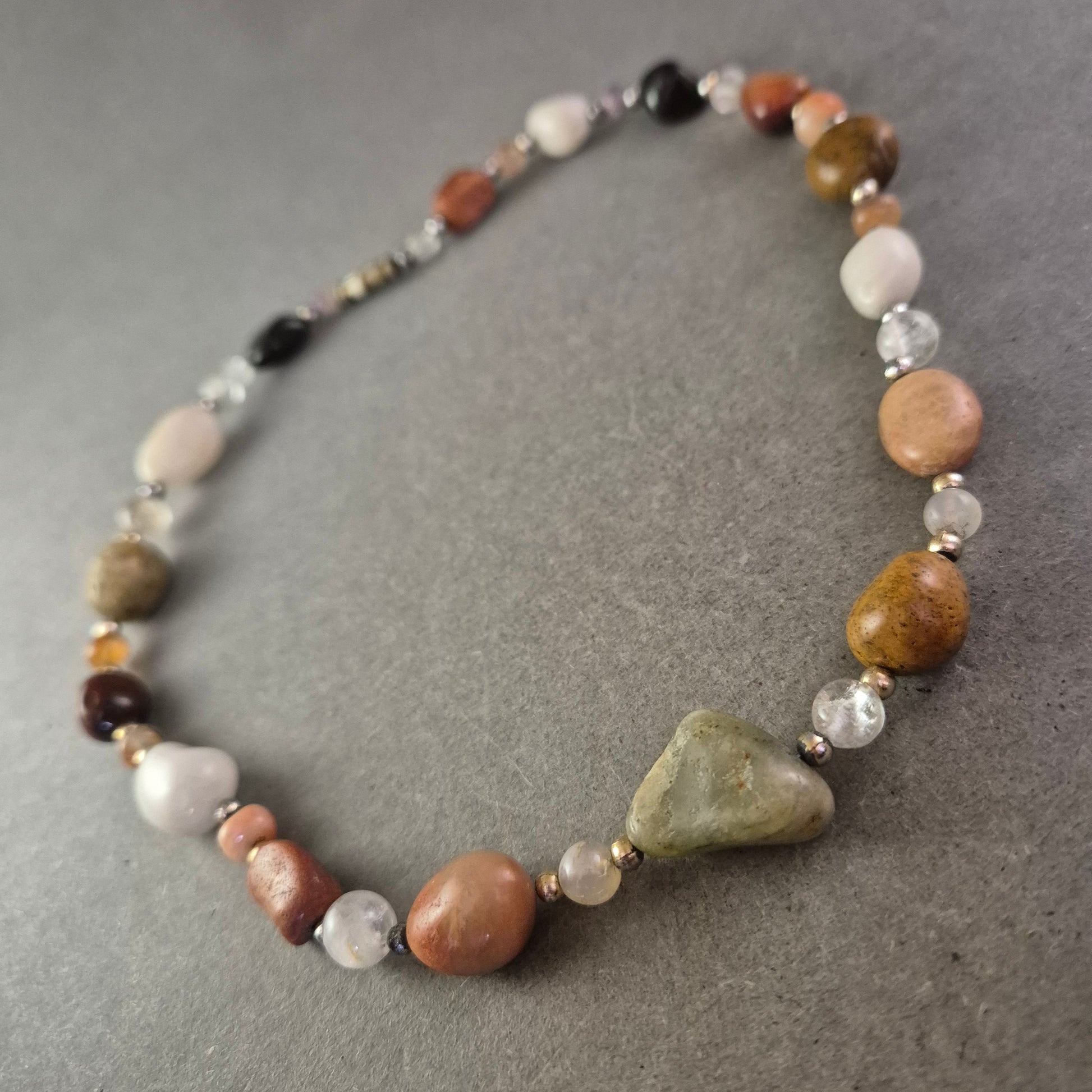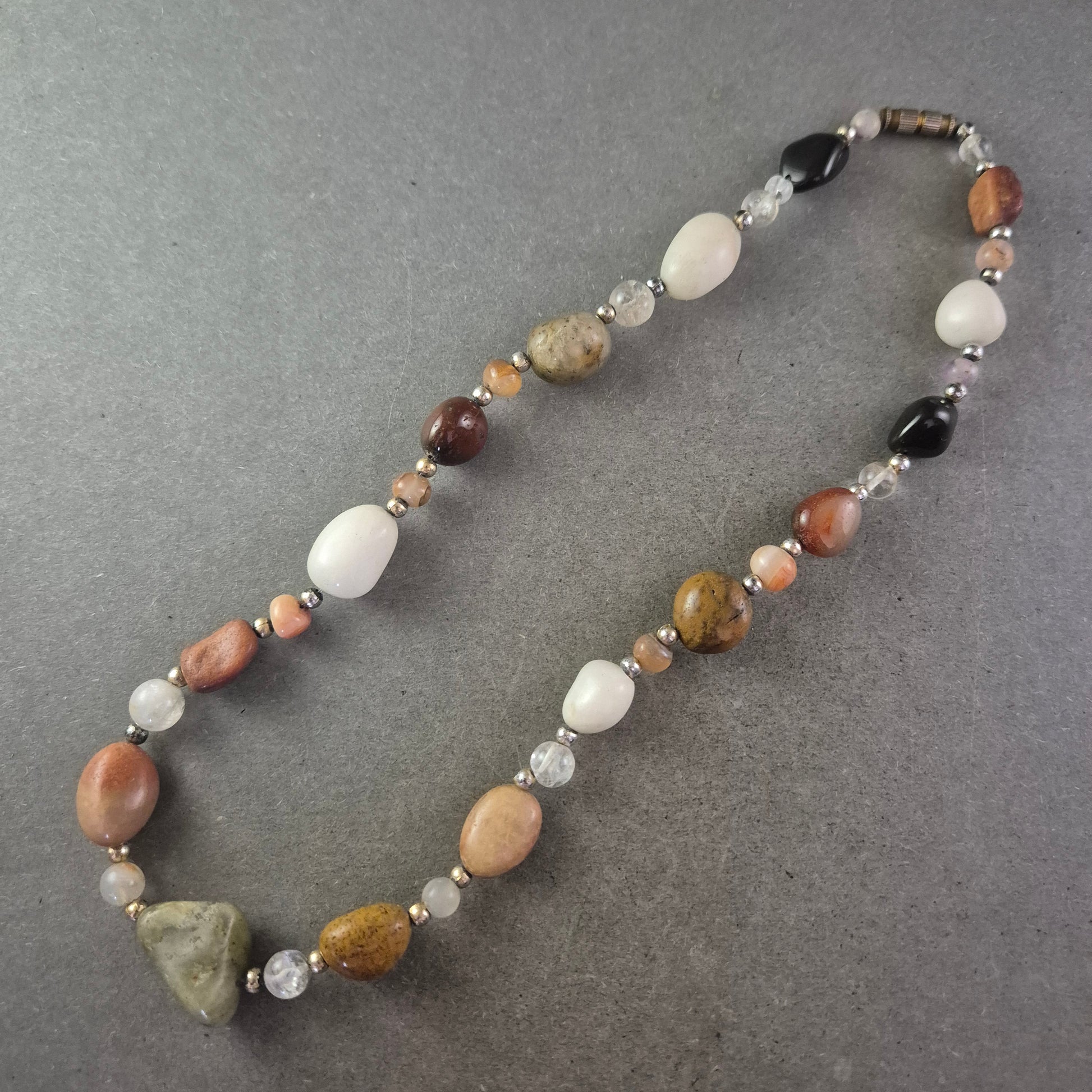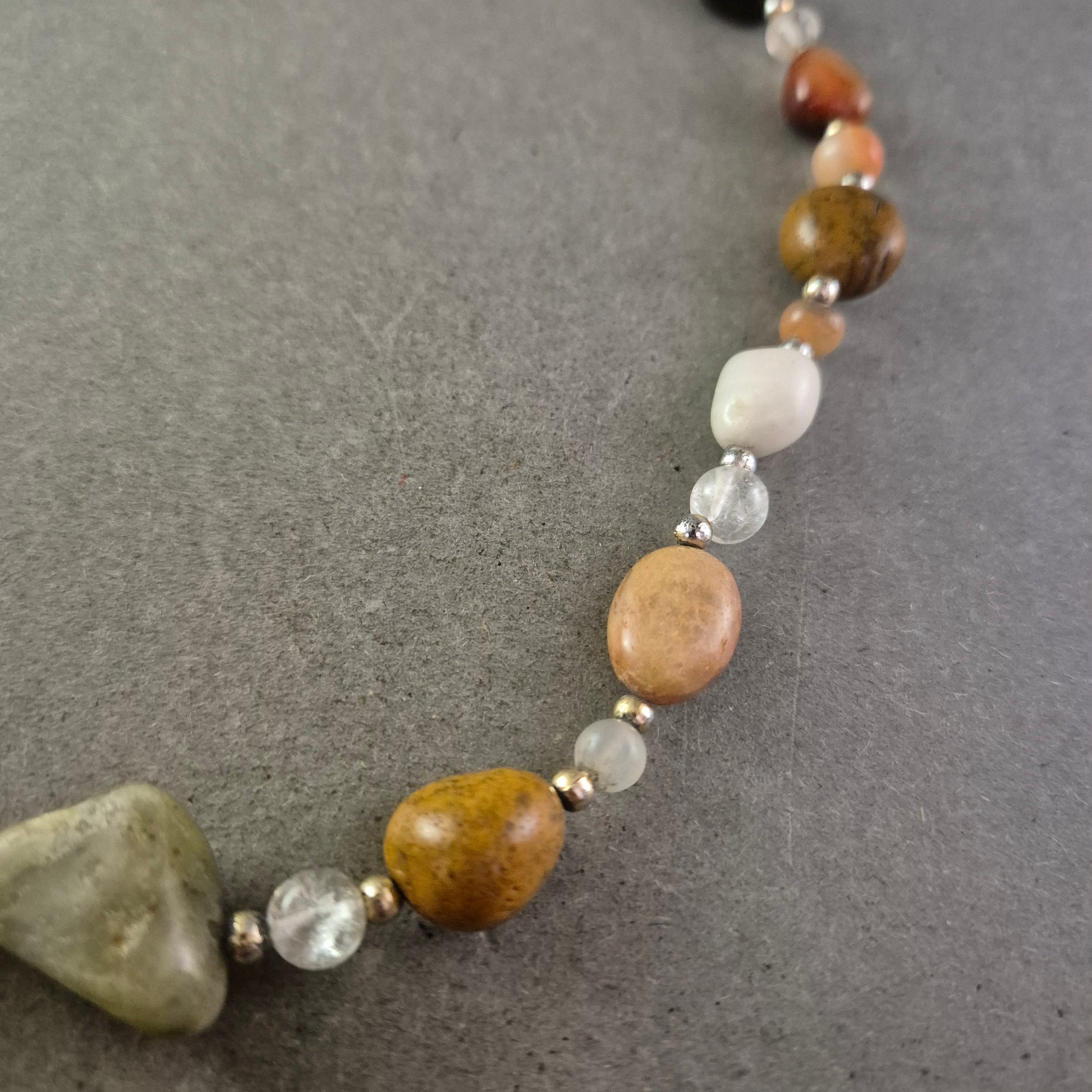 Diese kunstvolle Edelstein Halskette vereint Natur und Eleganz in einem harmonischen Schmuckstück. Unterschiedlich geformte und farbige Steine – von sanften Creme- und Brauntönen bis hin zu kräftigem Schwarz und Grün – sind in unregelmäßiger Folge aufgereiht und durch kleine silberfarbene Kugeln voneinander getrennt. Die Kette eignet sich ideal für naturverbundene Trägerinnen, die ein einzigartiges Accessoire suchen.