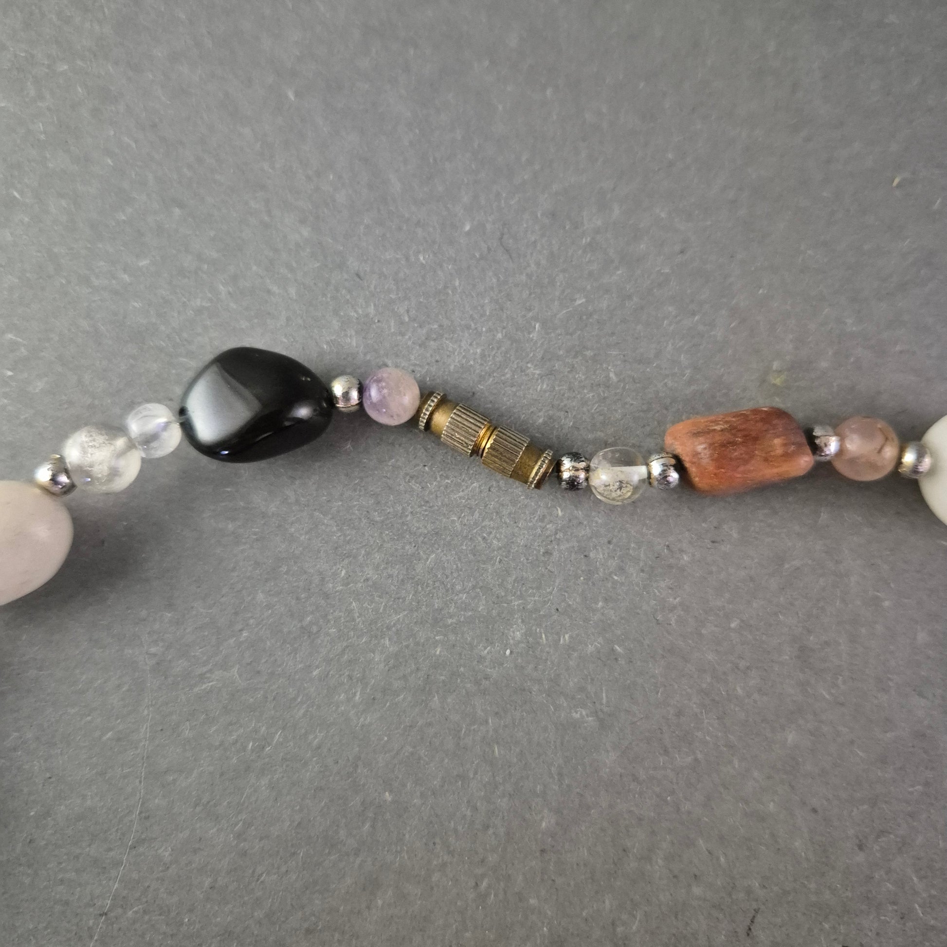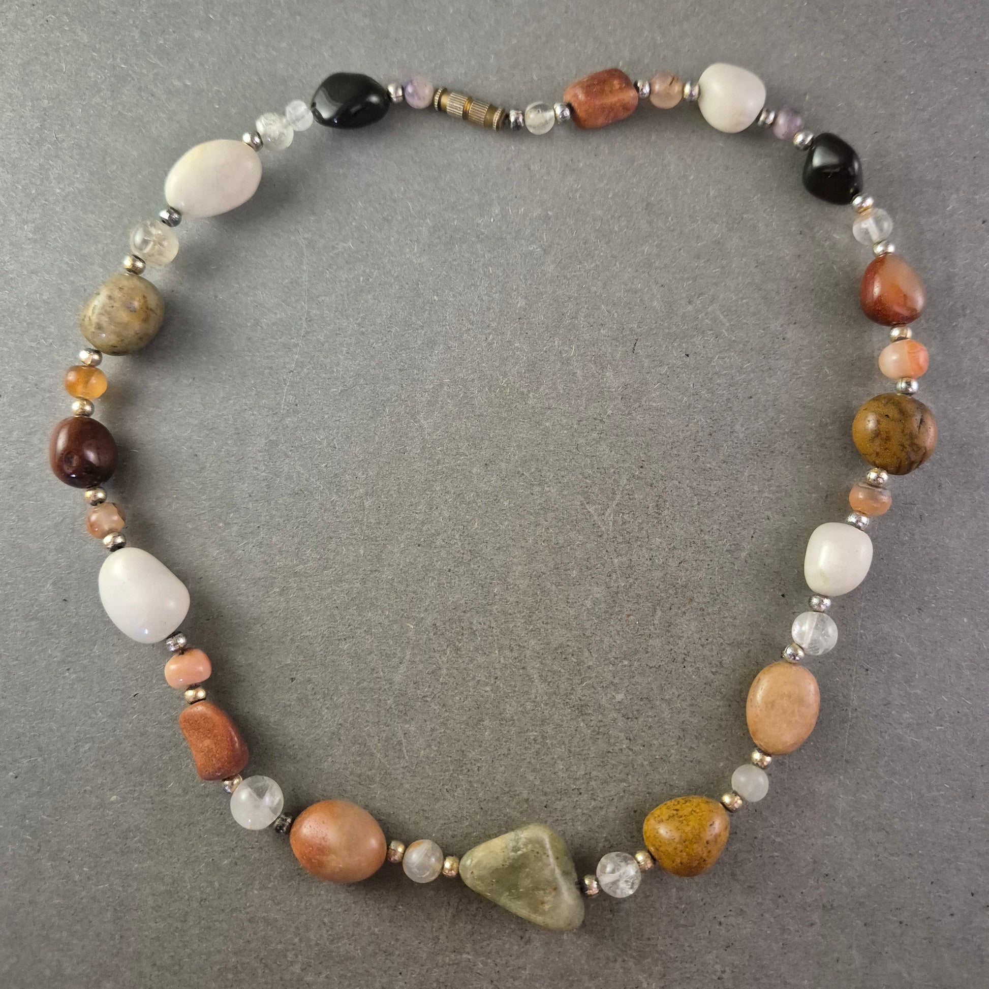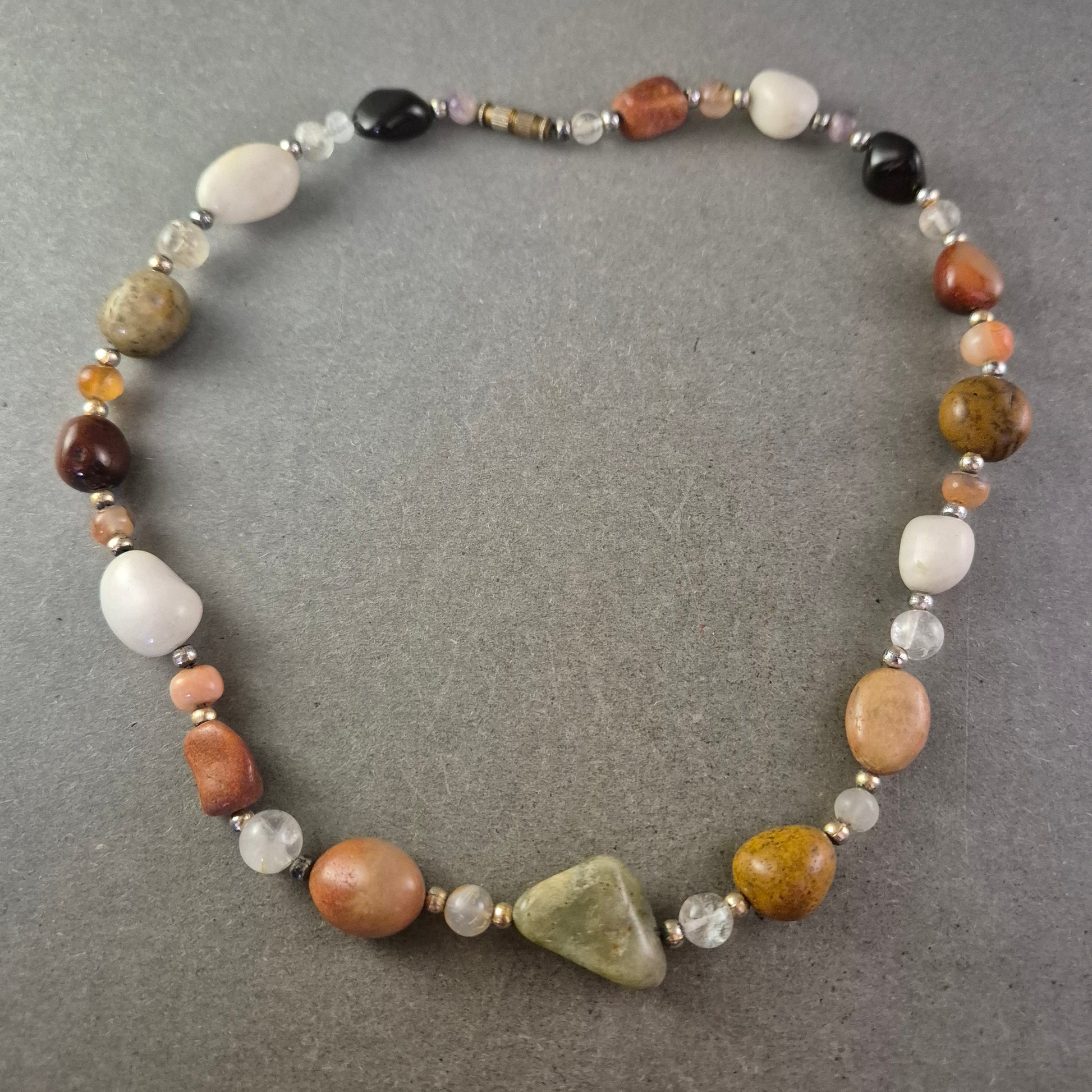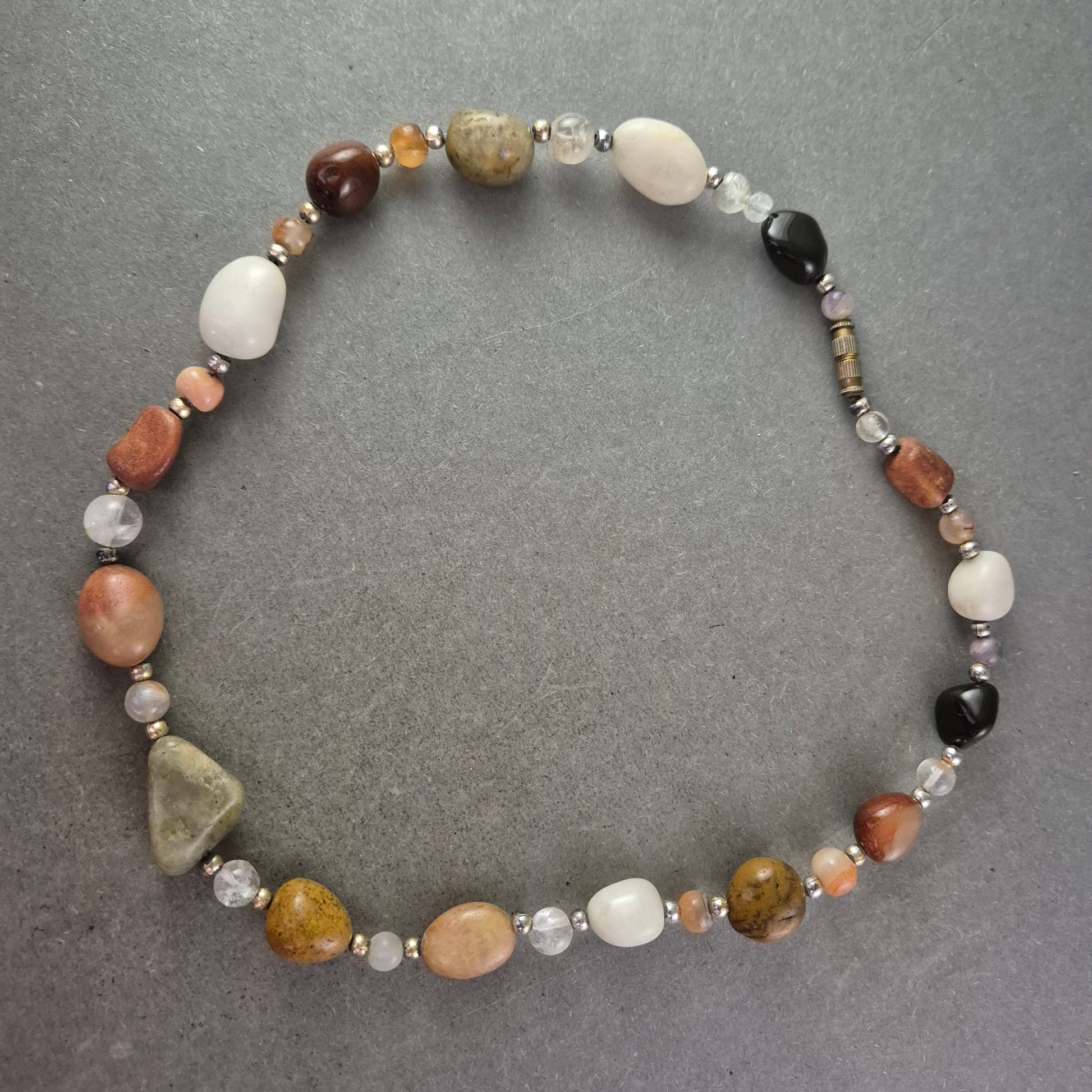 Diese kunstvolle Edelstein Halskette vereint Natur und Eleganz in einem harmonischen Schmuckstück. Unterschiedlich geformte und farbige Steine – von sanften Creme- und Brauntönen bis hin zu kräftigem Schwarz und Grün – sind in unregelmäßiger Folge aufgereiht und durch kleine silberfarbene Kugeln voneinander getrennt. Die Kette eignet sich ideal für naturverbundene Trägerinnen, die ein einzigartiges Accessoire suchen.