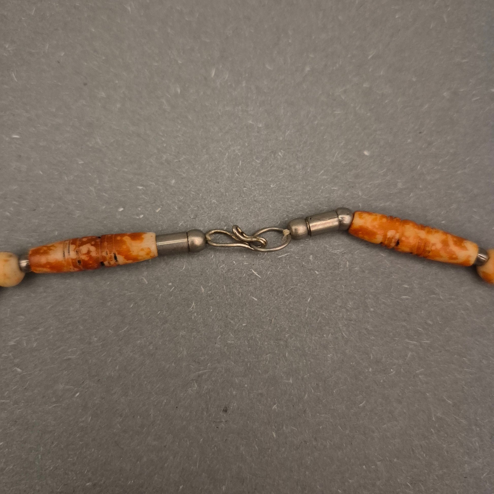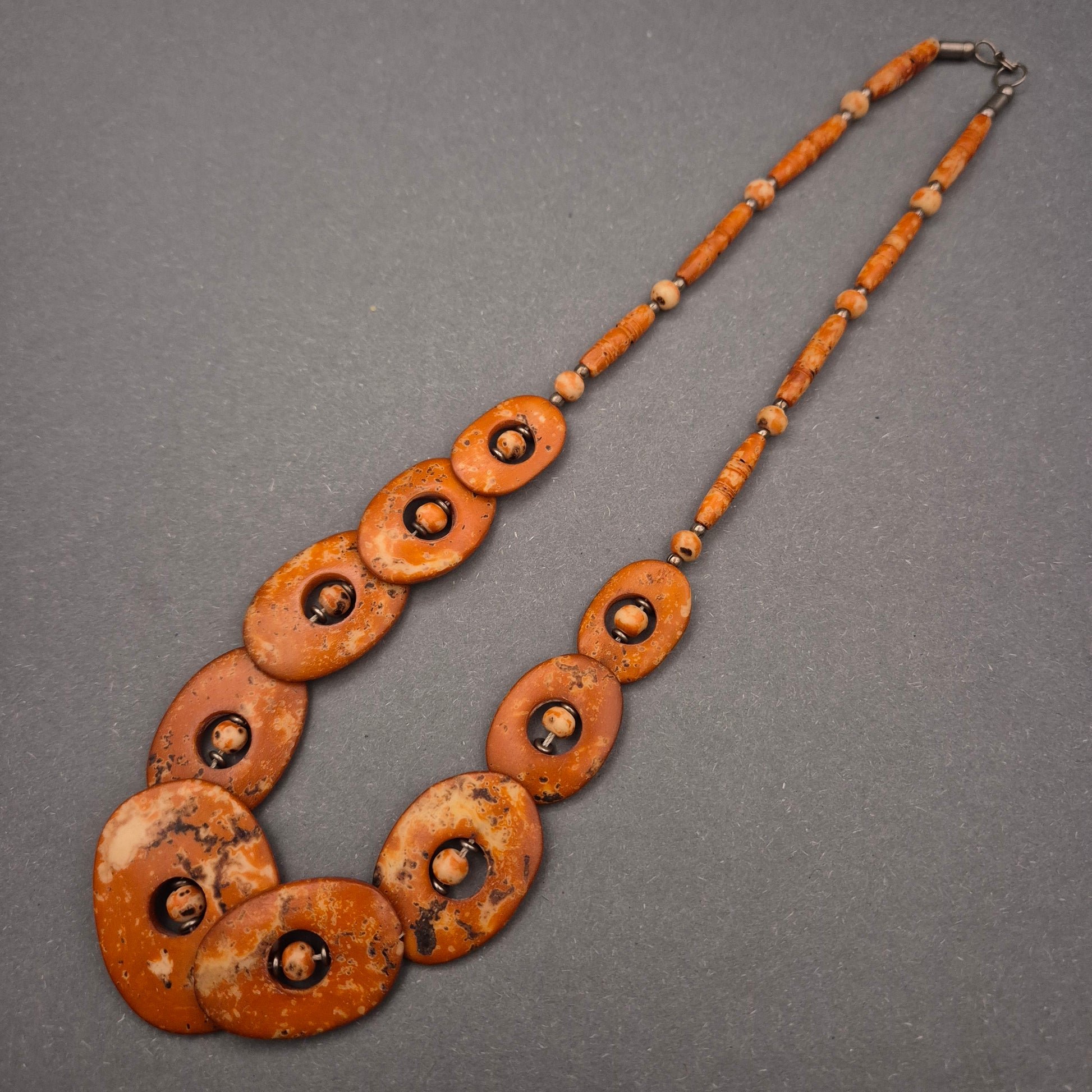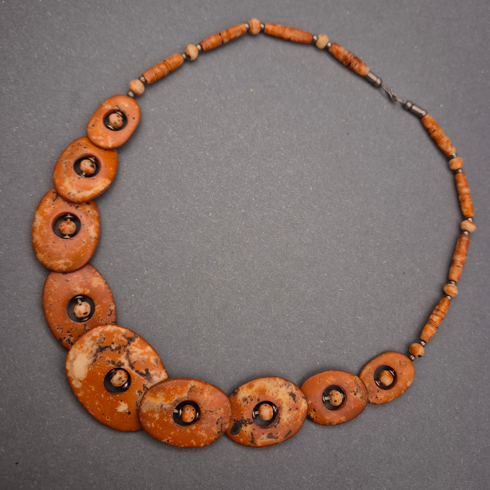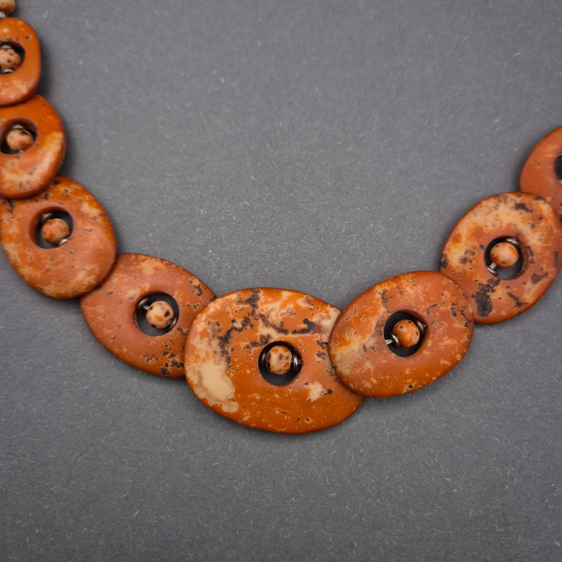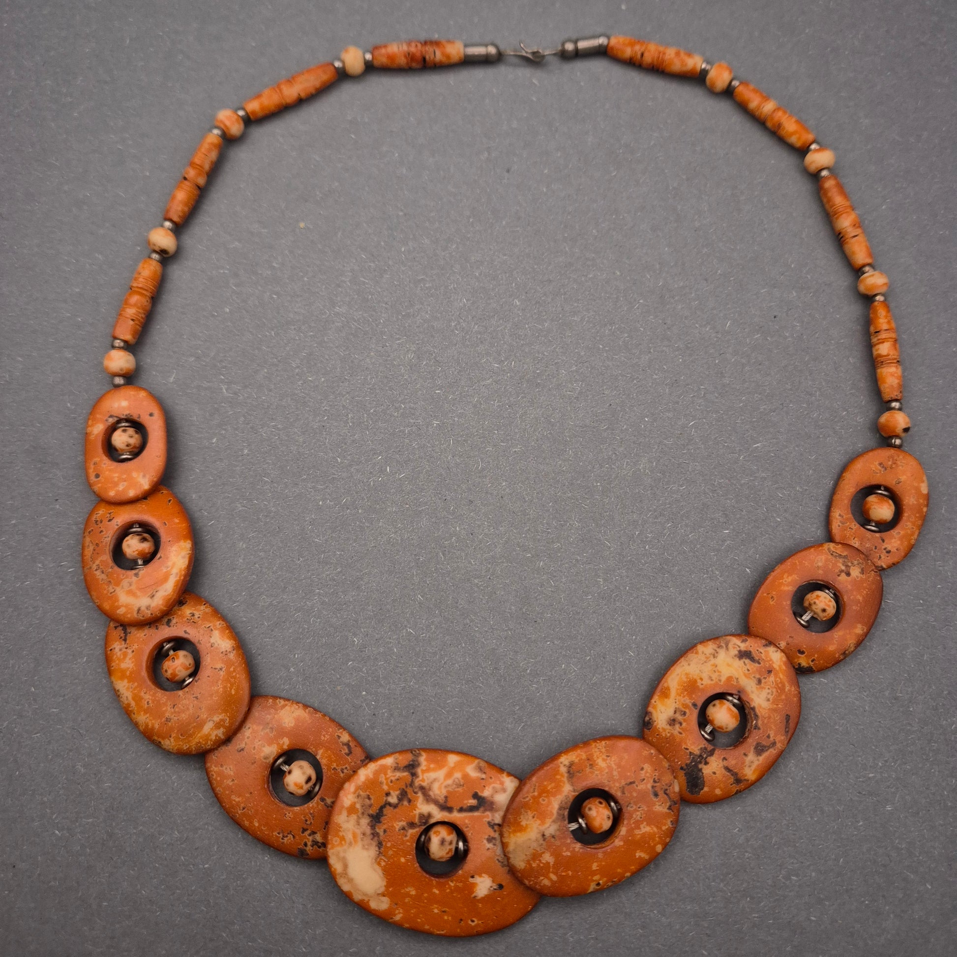 Diese kunstvoll gearbeitete Halskette aus natürlichen Steinelementen überzeugt durch ihre warmen Erdtöne und das auffällige, organische Design. Die flachen, runden Natursteinplatten mit zentral eingesetzten Kugeln verleihen der Kette einen einzigartigen Charakter. Ideal für Liebhaberinnen von Boho-, Ethno- oder Vintage-Stil.