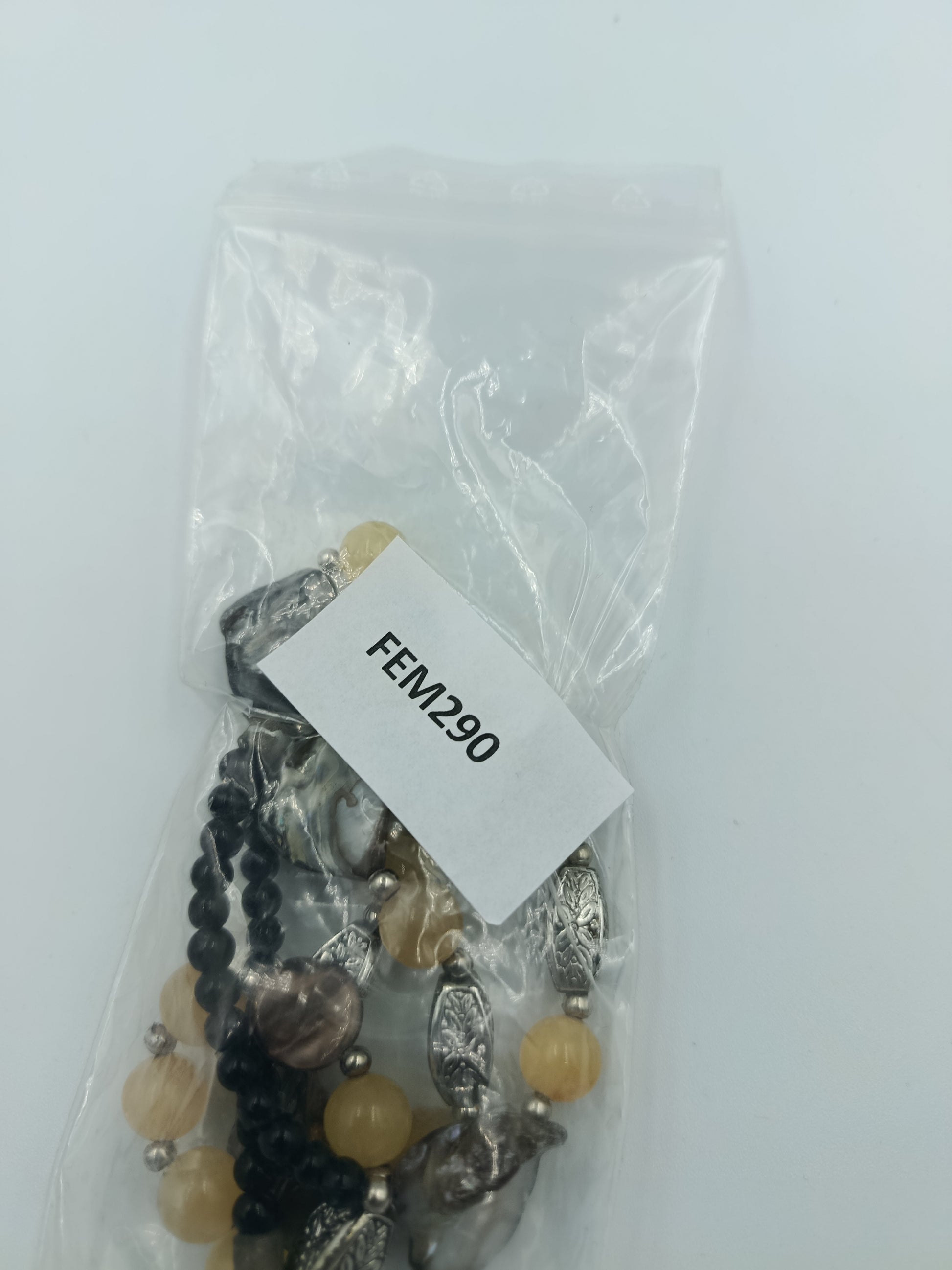 Ausgefallene Halskette mit einem harmonischen Mix aus warmen gelben Natursteinen, schimmernden Muschelelementen und filigran verzierten Metallperlen in Silberoptik. Die Kombination der unterschiedlichen Formen und Texturen verleiht der Kette einen modernen, natürlichen Boho-Charakter.