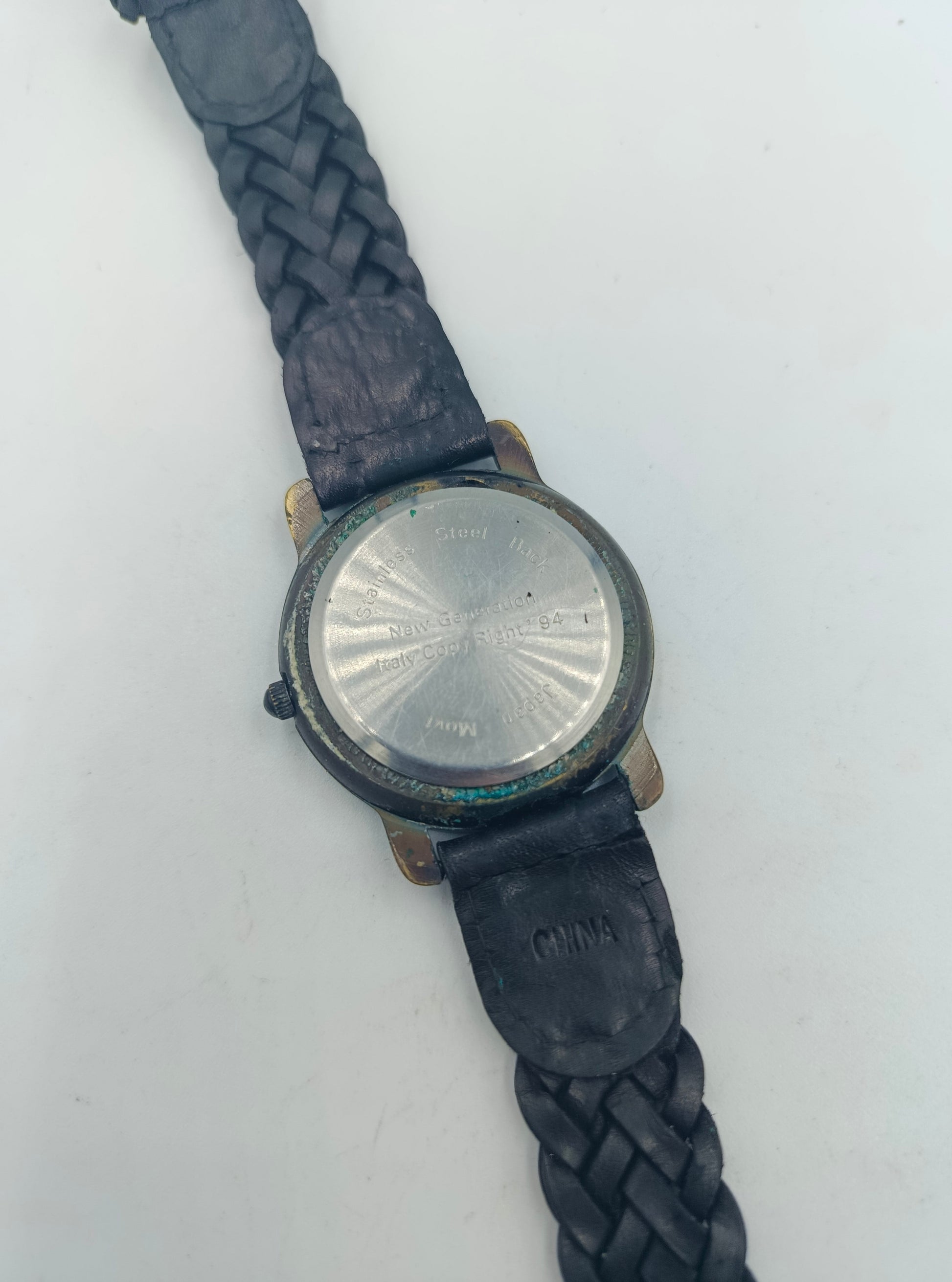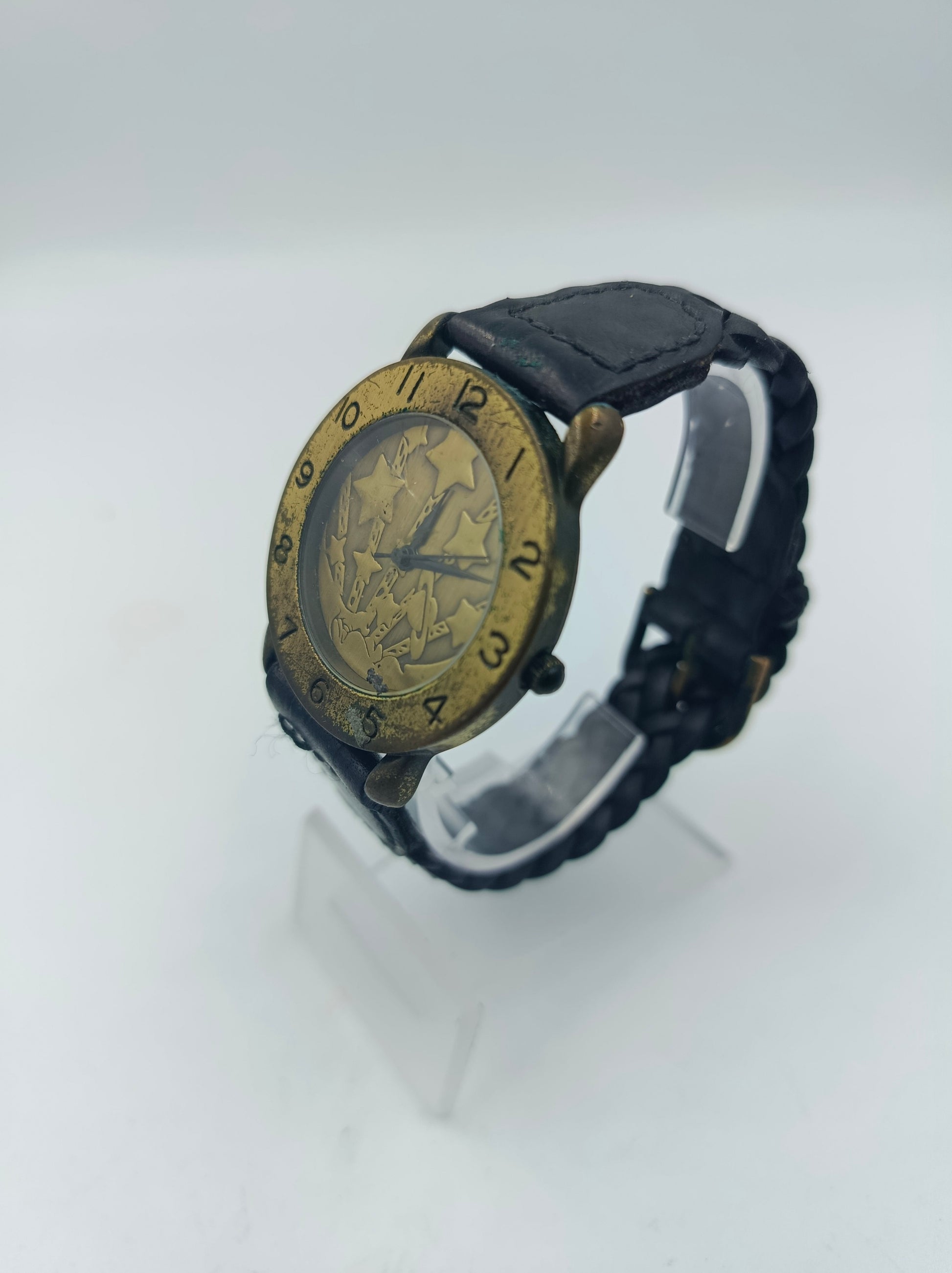 Ausdrucksstarke New Generation Armbanduhr mit einzigartigem Ziffernblatt im Sternenmuster. Das bronzefarbene Gehäuse verleiht der Uhr einen antiken Look, während das geflochtene schwarze Lederarmband für einen markanten, lässigen Stil sorgt. Ideal für Sammler oder Vintage-Liebhaber.