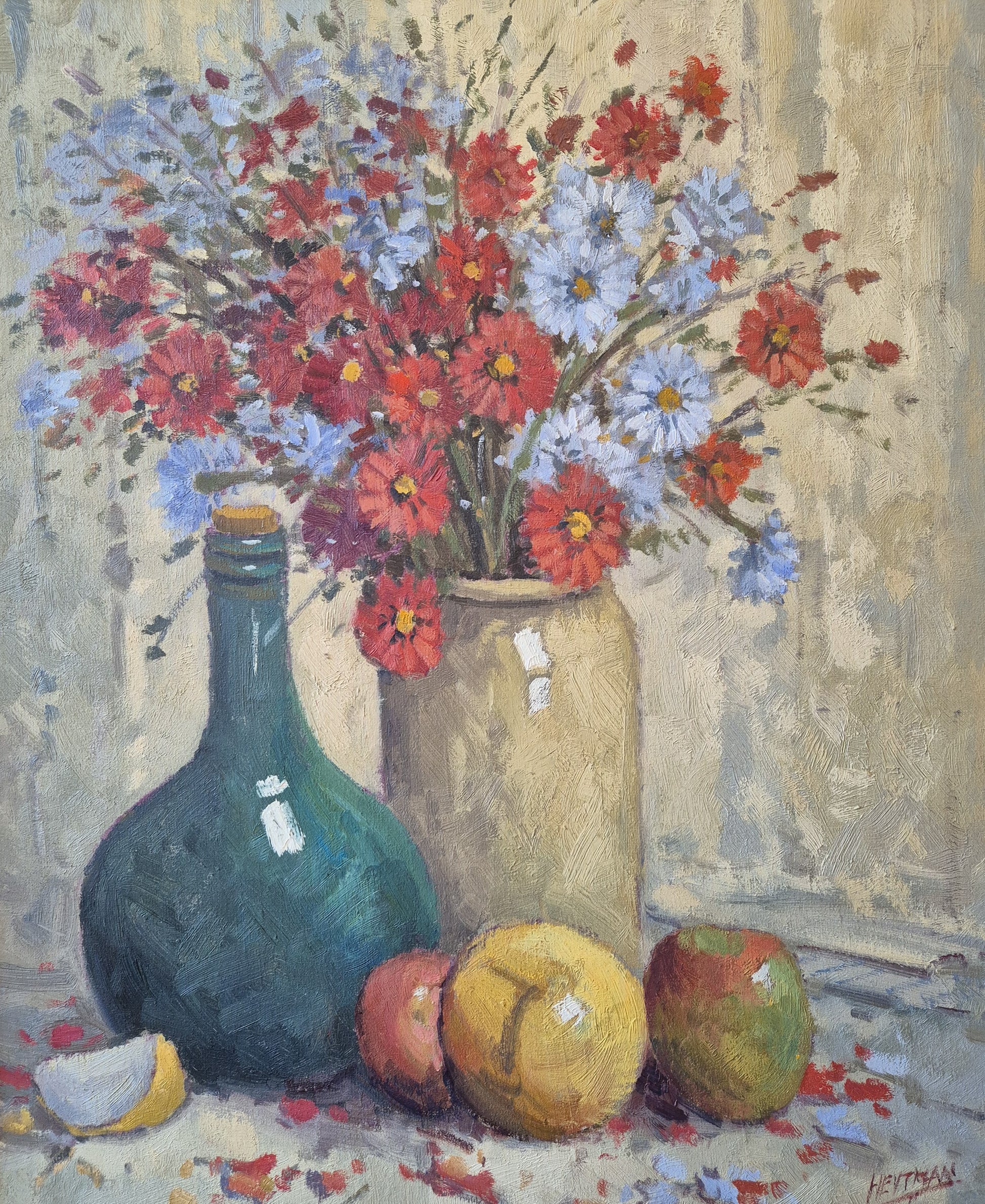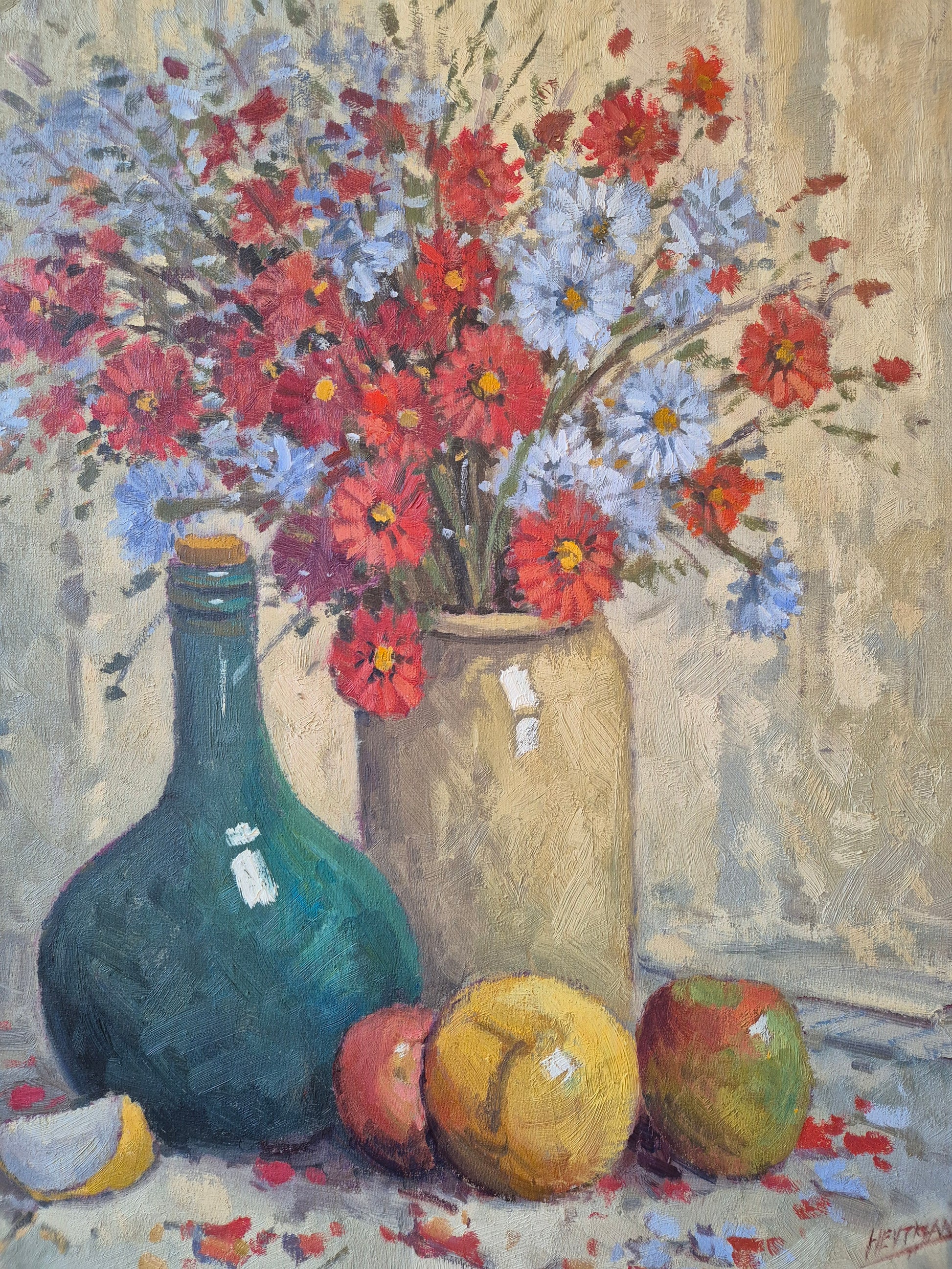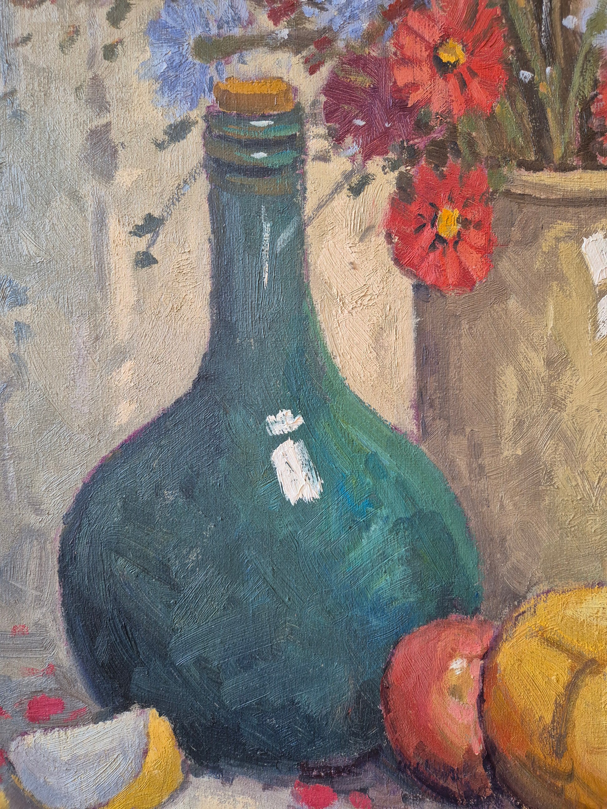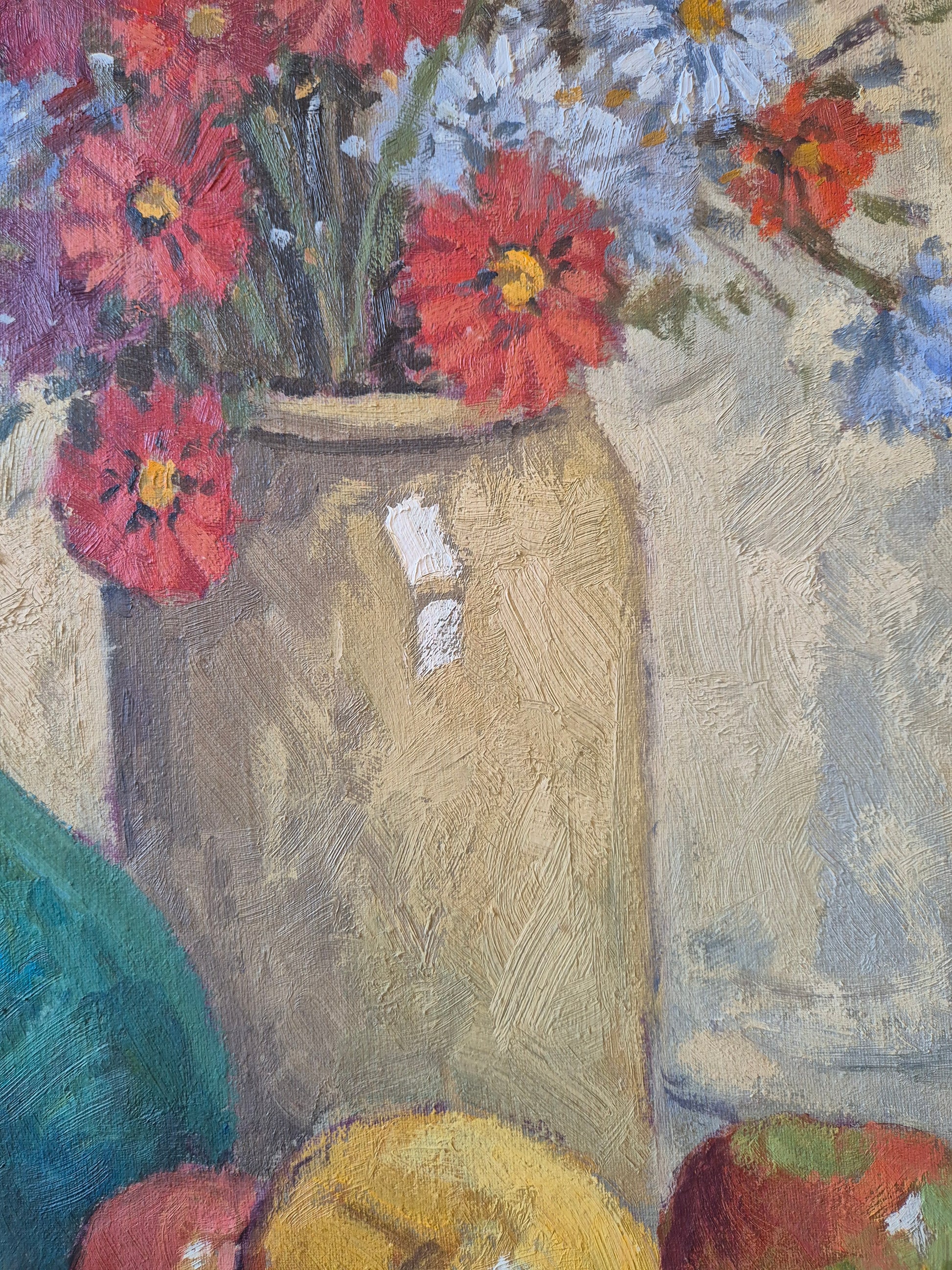 Wunderschönes impressionistisches Stillleben mit Blumen, Früchten und Krug, ausgeführt in Öl auf Leinwand. Das Werk überzeugt durch eine lebendige, pastose Malweise und eine harmonische Farbstimmung, die typisch für den Impressionismus und Post-Impressionismus ist.