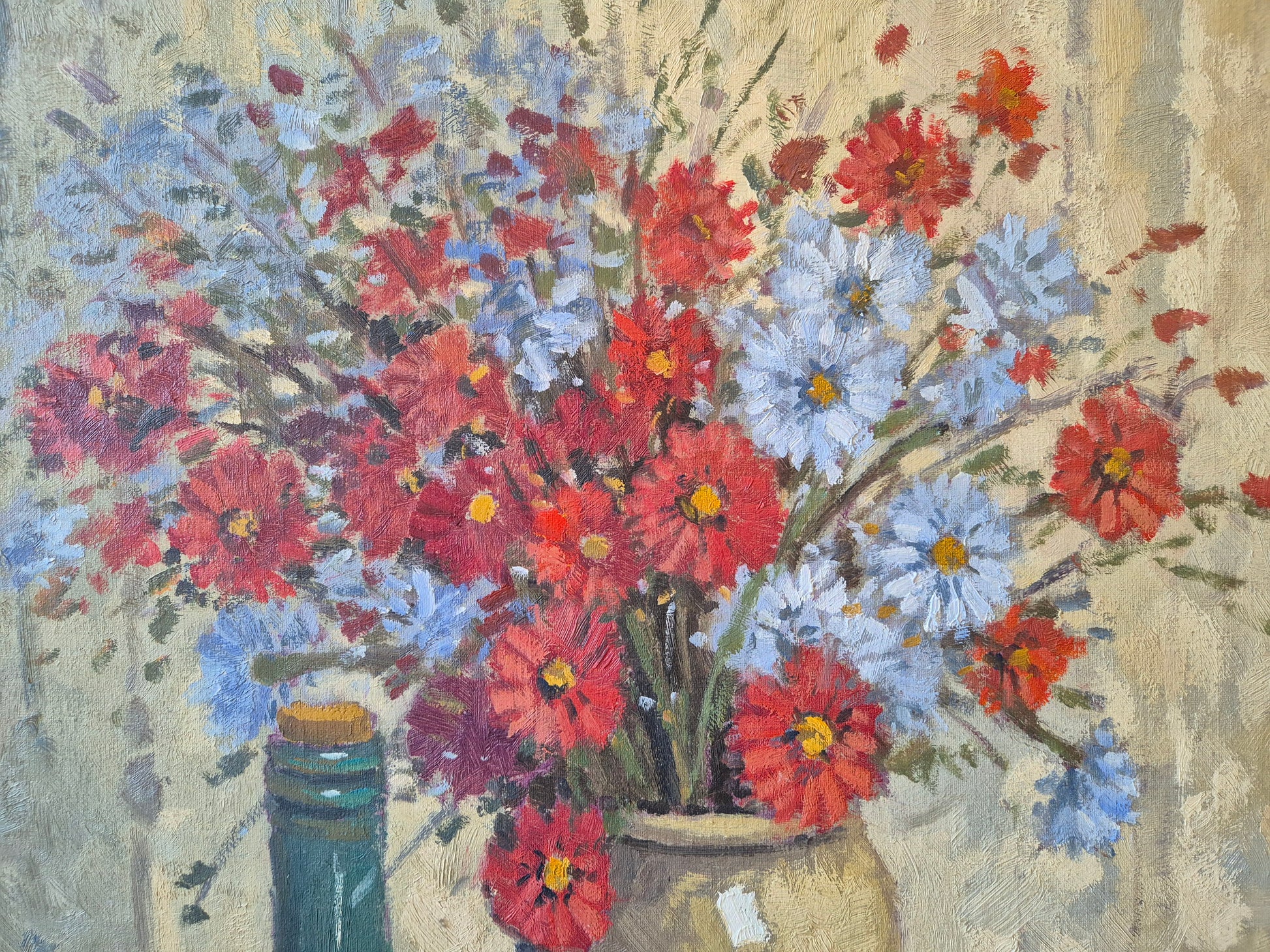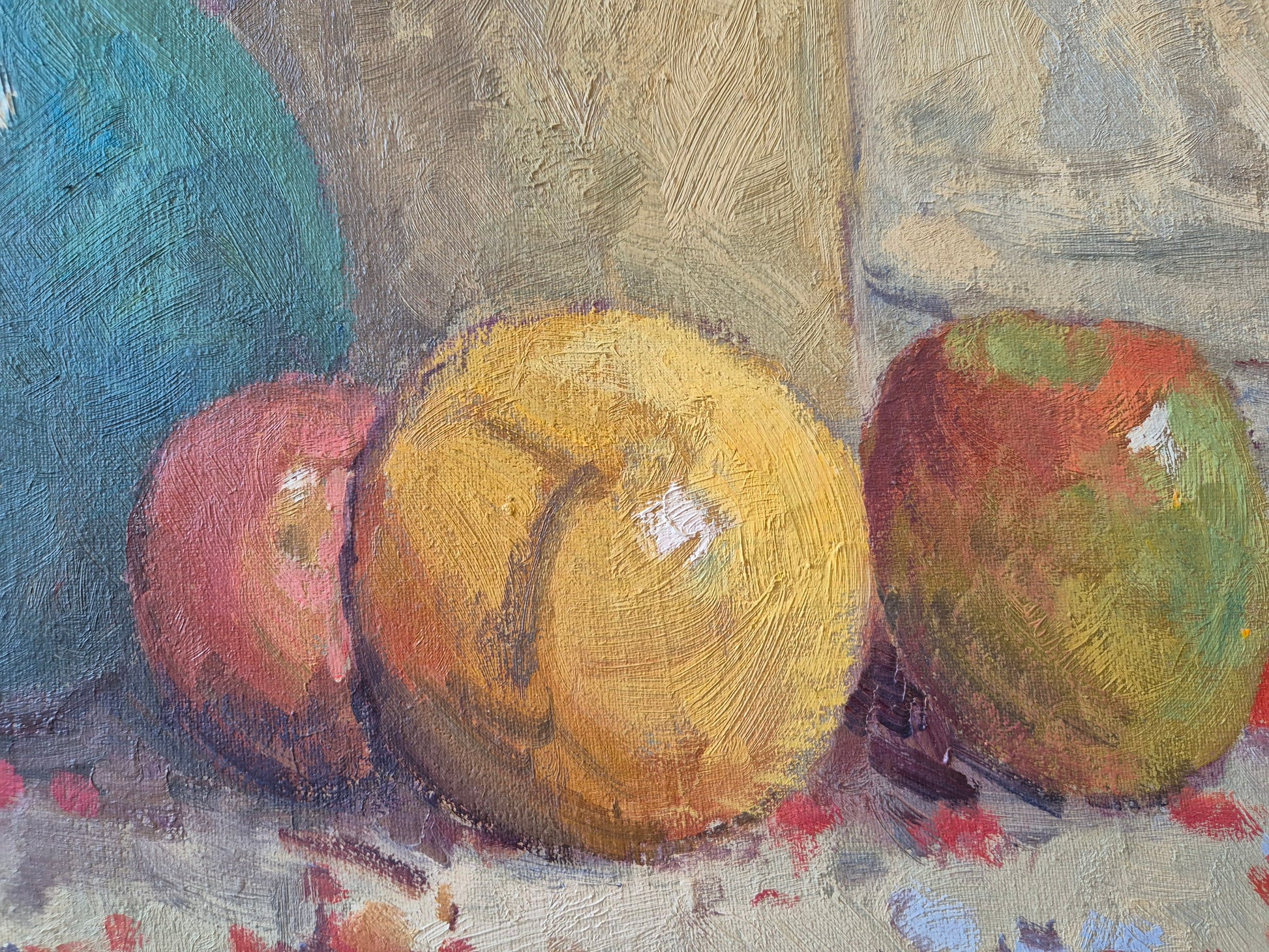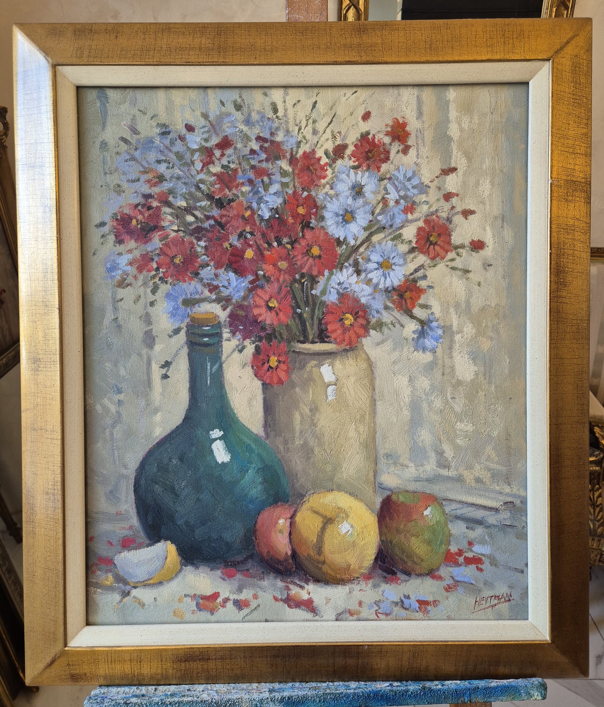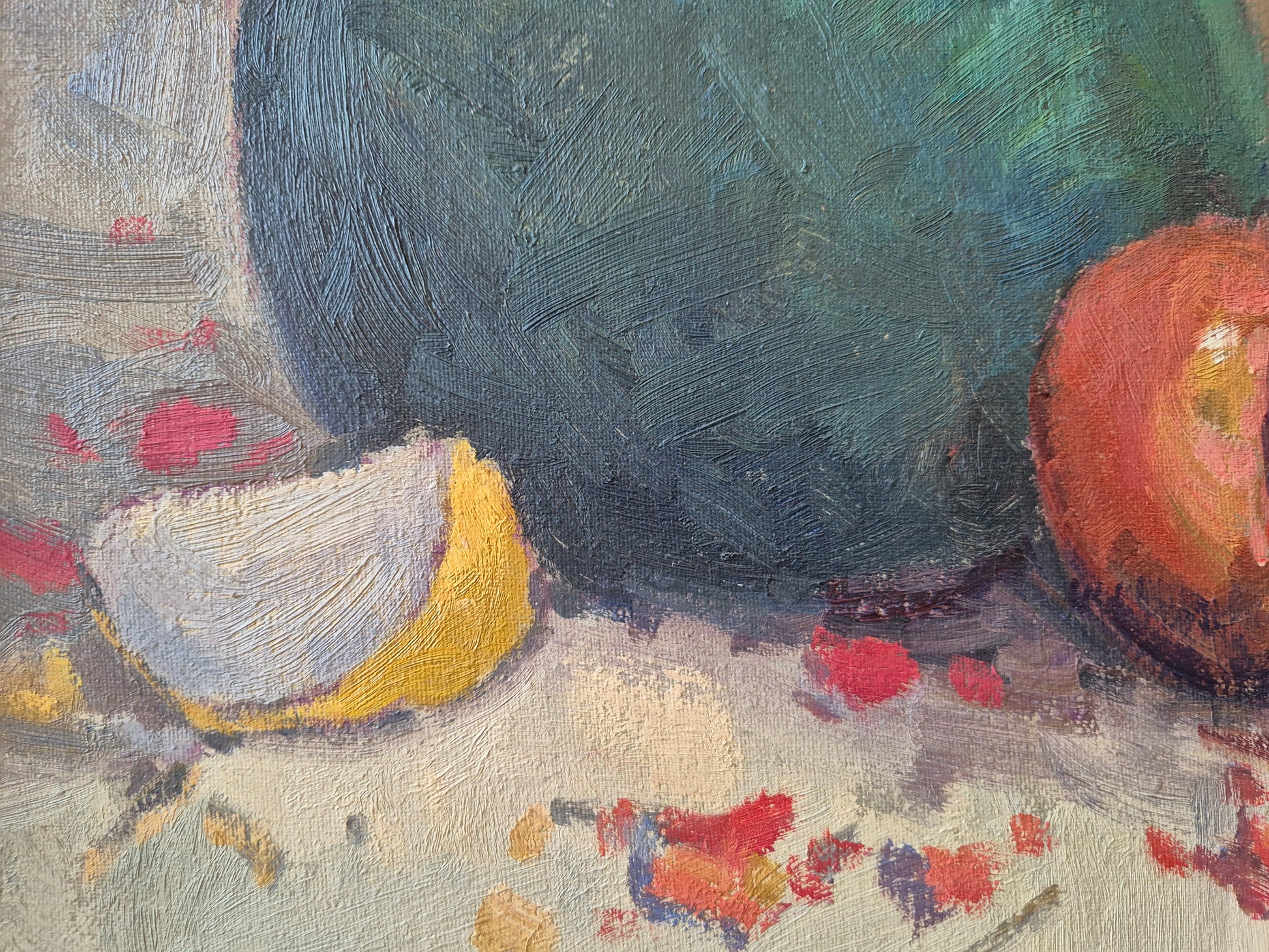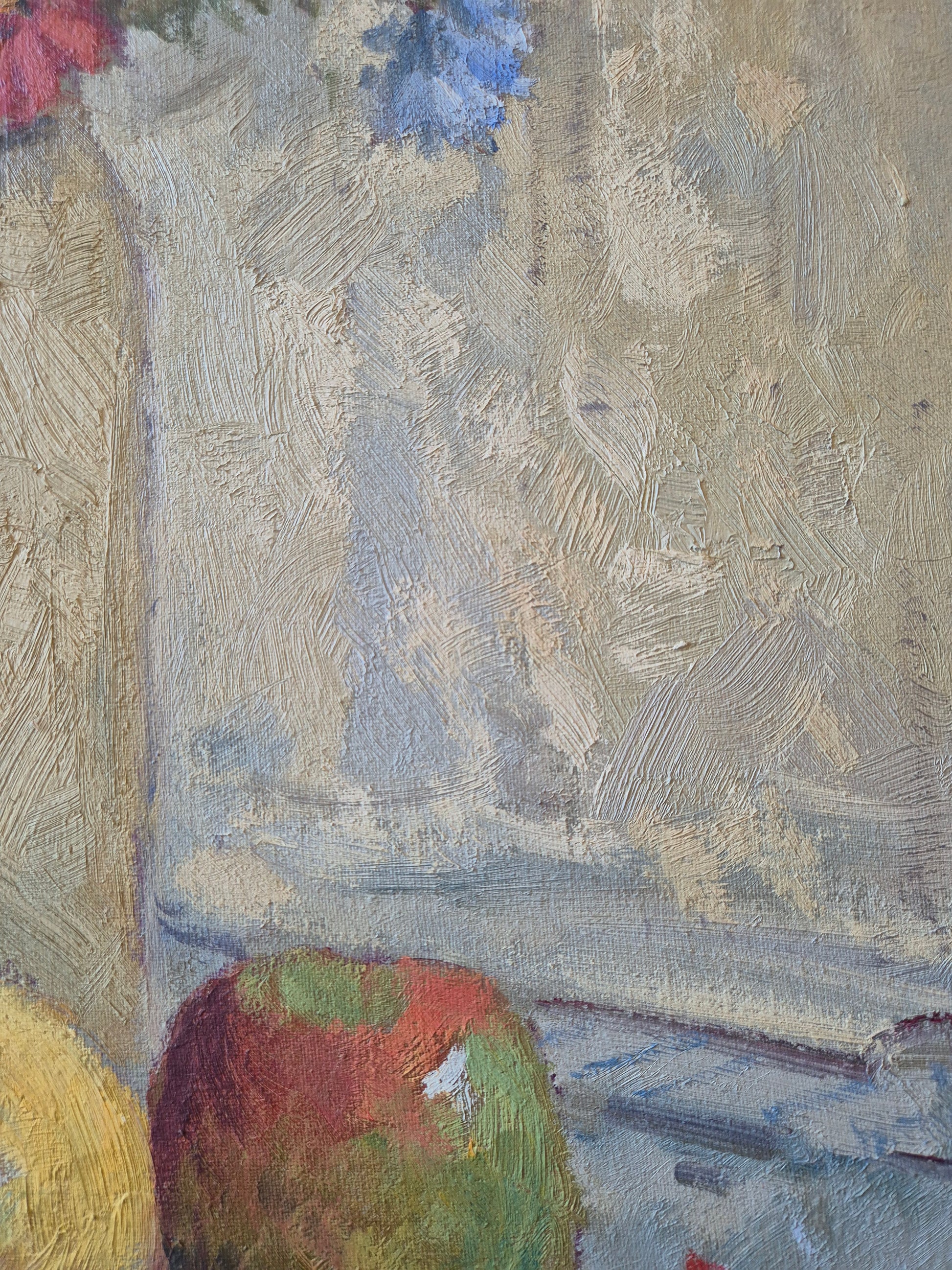 Wunderschönes impressionistisches Stillleben mit Blumen, Früchten und Krug, ausgeführt in Öl auf Leinwand. Das Werk überzeugt durch eine lebendige, pastose Malweise und eine harmonische Farbstimmung, die typisch für den Impressionismus und Post-Impressionismus ist.