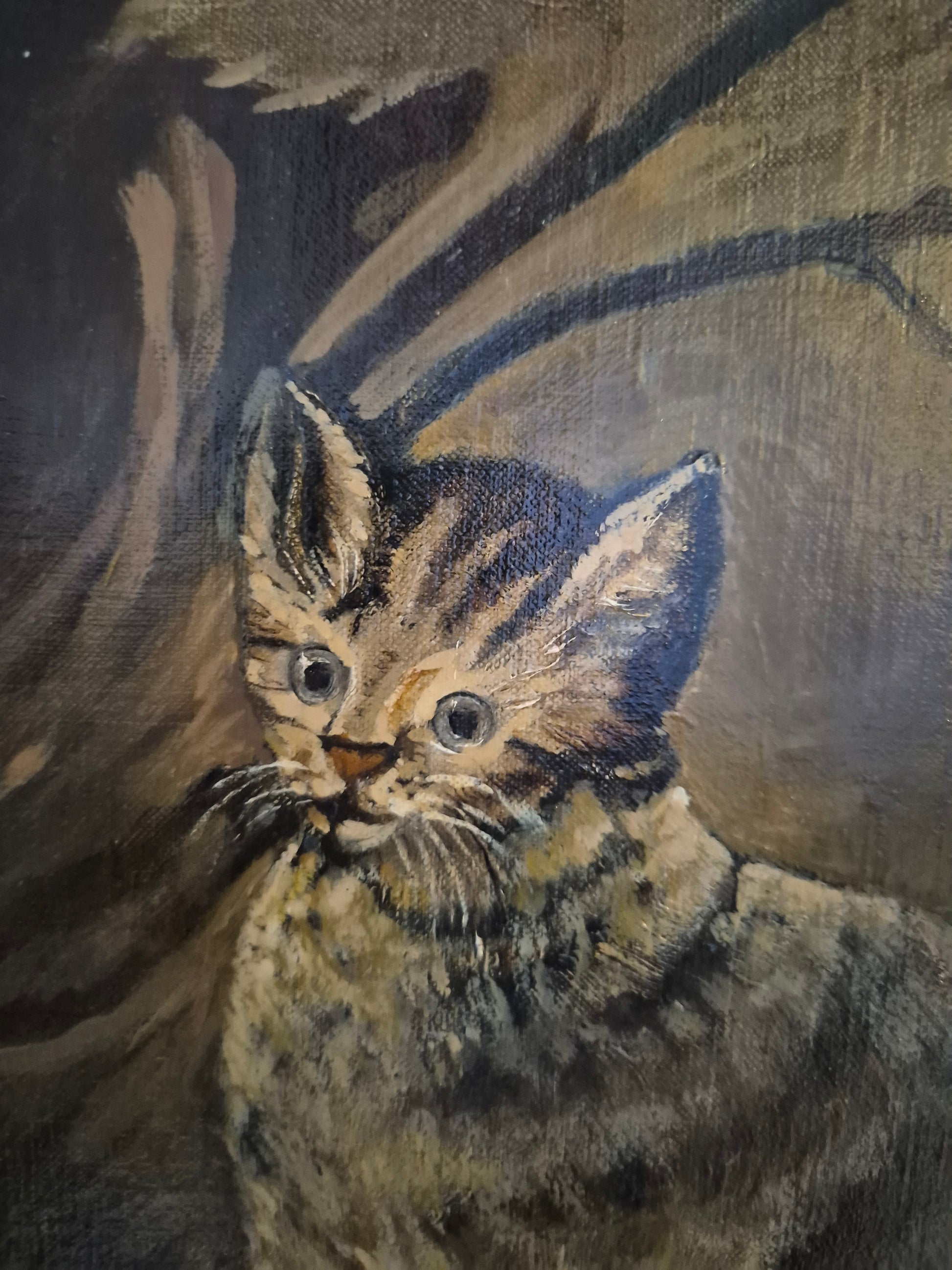 Herzlich willkommen, angeboten wird ein außergewöhnliches Ölgemälde von K. Hoppmann (XIX–XX). Das humorvolle Werk zeigt zwei schrill guckende Katzen, deren lebhafte Mimik sofort ins Auge fällt. Die expressive Malweise und die kräftige Farbgebung verleihen dem Bild eine besondere Dynamik und machen es zu einem Blickfang in jeder Sammlung.