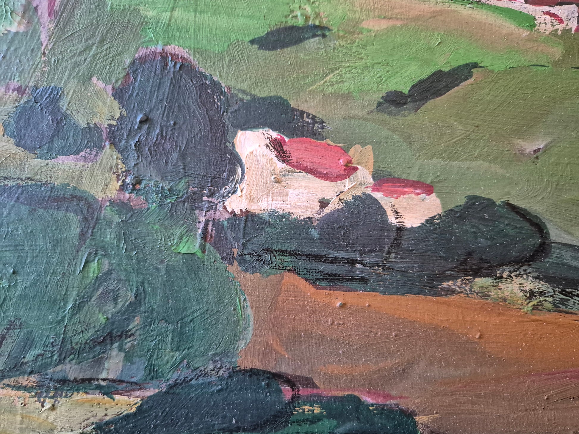 Wunderschönes und farbintensives Ölgemälde von Rolf-Dietrich Ratzmann, einem bekannten deutschen Künstler des 20. Jahrhunderts. Das Werk zeigt eine expressionistische Landschaft, die durch ihre lebendige Farbgebung und dynamische Malweise besticht.