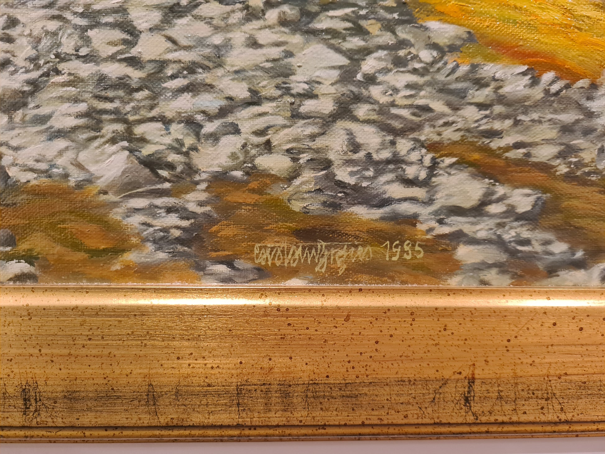 angeboten wird ein signiertes und datiertes Ölgemälde (1985) mit Landschaftsmotiv, ausgeführt in Öl auf Leinwand, gerahmt in einem goldenen Holzrahmen.