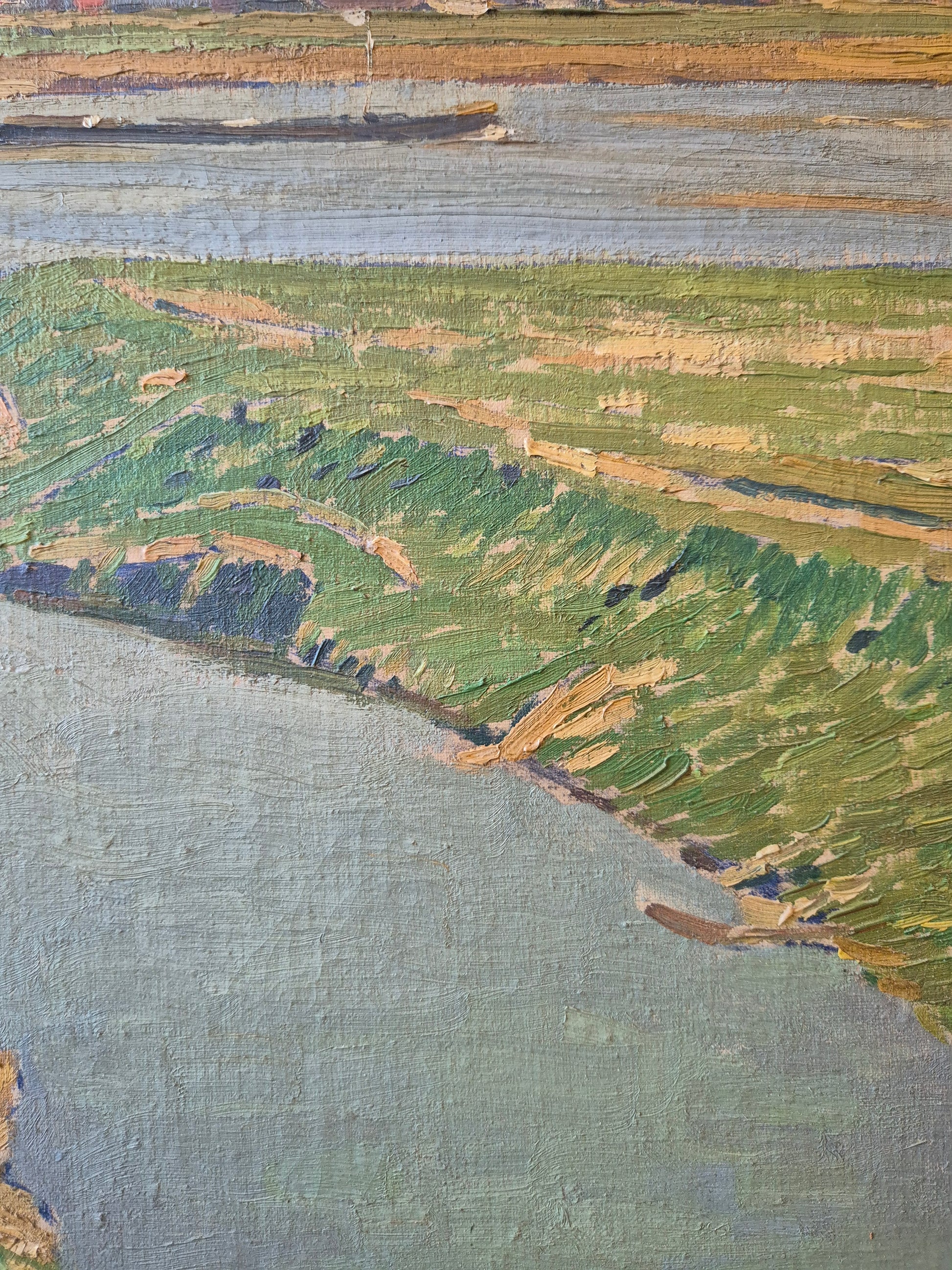 Stimmungsvolles Ölgemälde des deutschen Künstlers Fritz Köhler (1887–1972), das das Rheinufer in Düsseldorf in einer atmosphärischen Landschaftsdarstellung zeigt. Die fein abgestimmte Farbgebung und die ruhige Komposition verleihen dem Werk eine harmonische Wirkung.