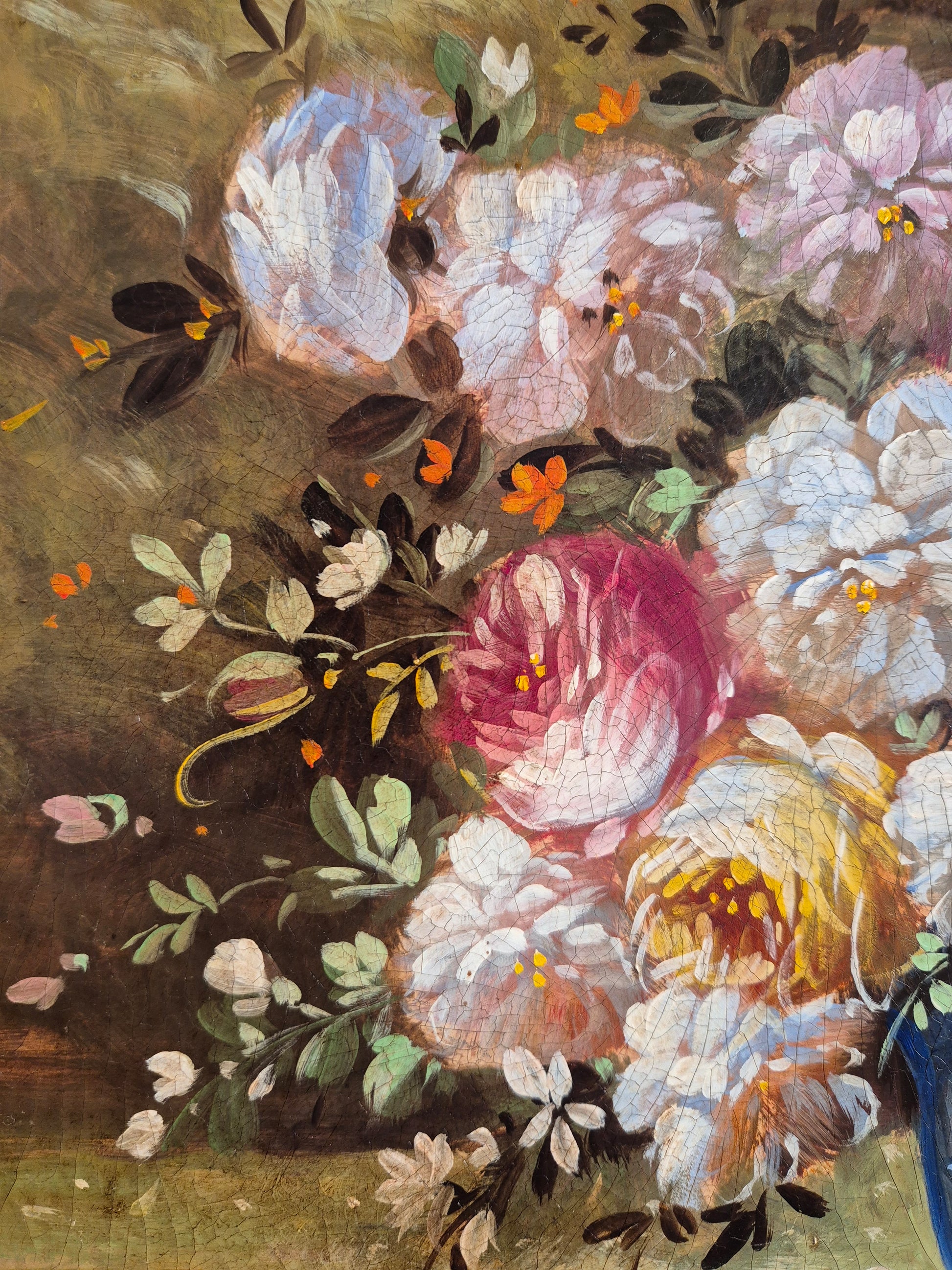Die leuchtenden Farben und die fein ausgearbeitete Blütenvielfalt verleihen dem Werk eine elegante, mediterrane Ausstrahlung. Die Komposition verbindet traditionelle Stilllebenkunst mit einer lebendigen, naturnahen Hintergrundgestaltung und macht das Bild zu einem dekorativen Blickfang in jedem Raum.