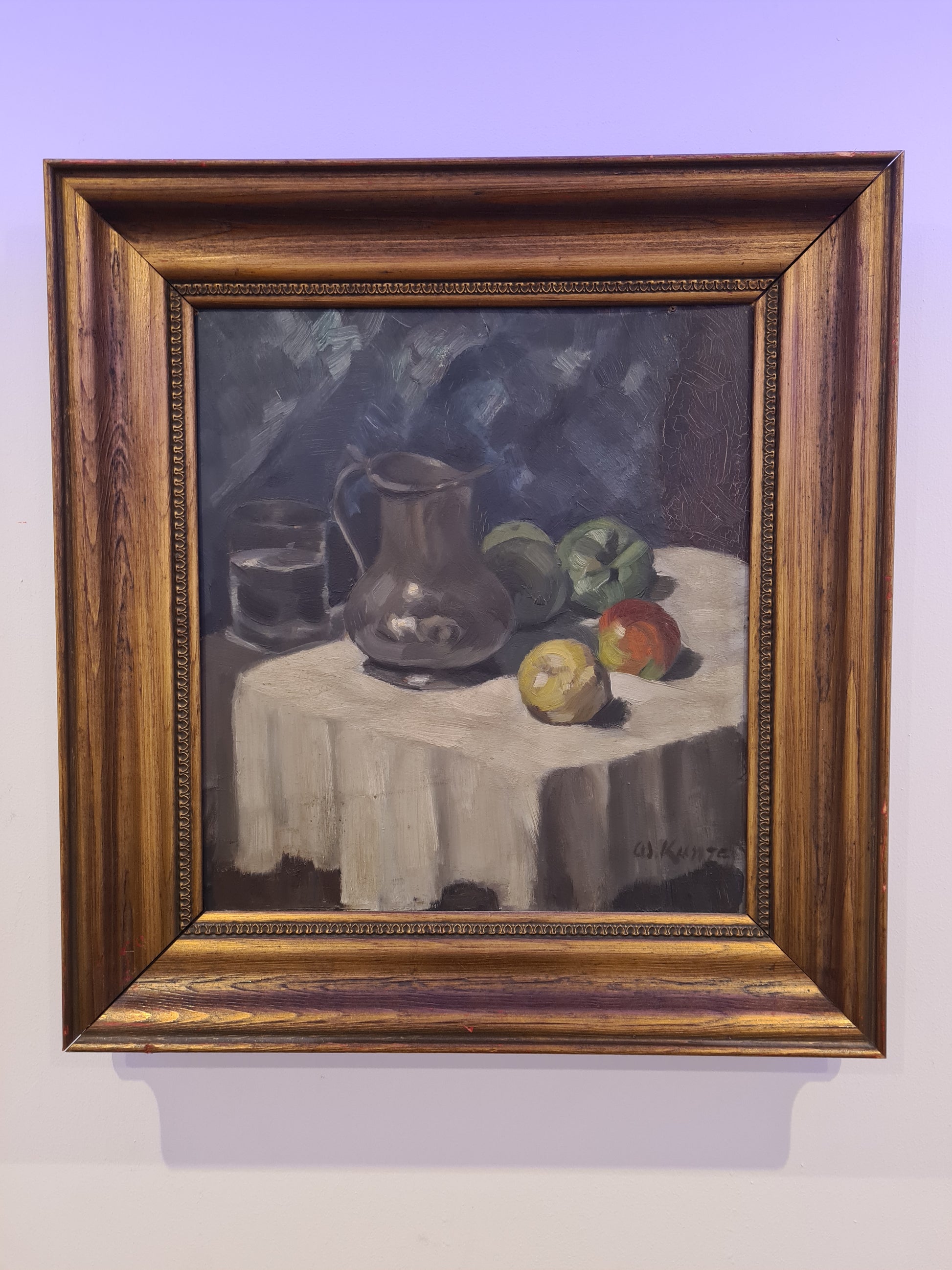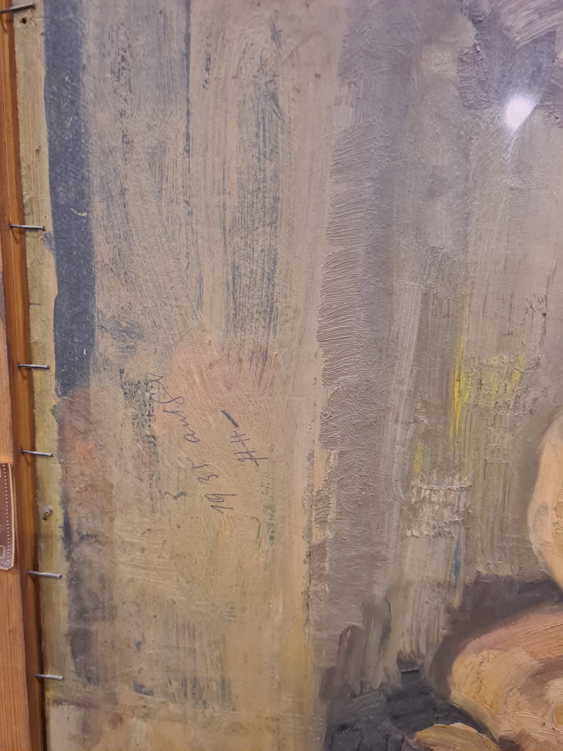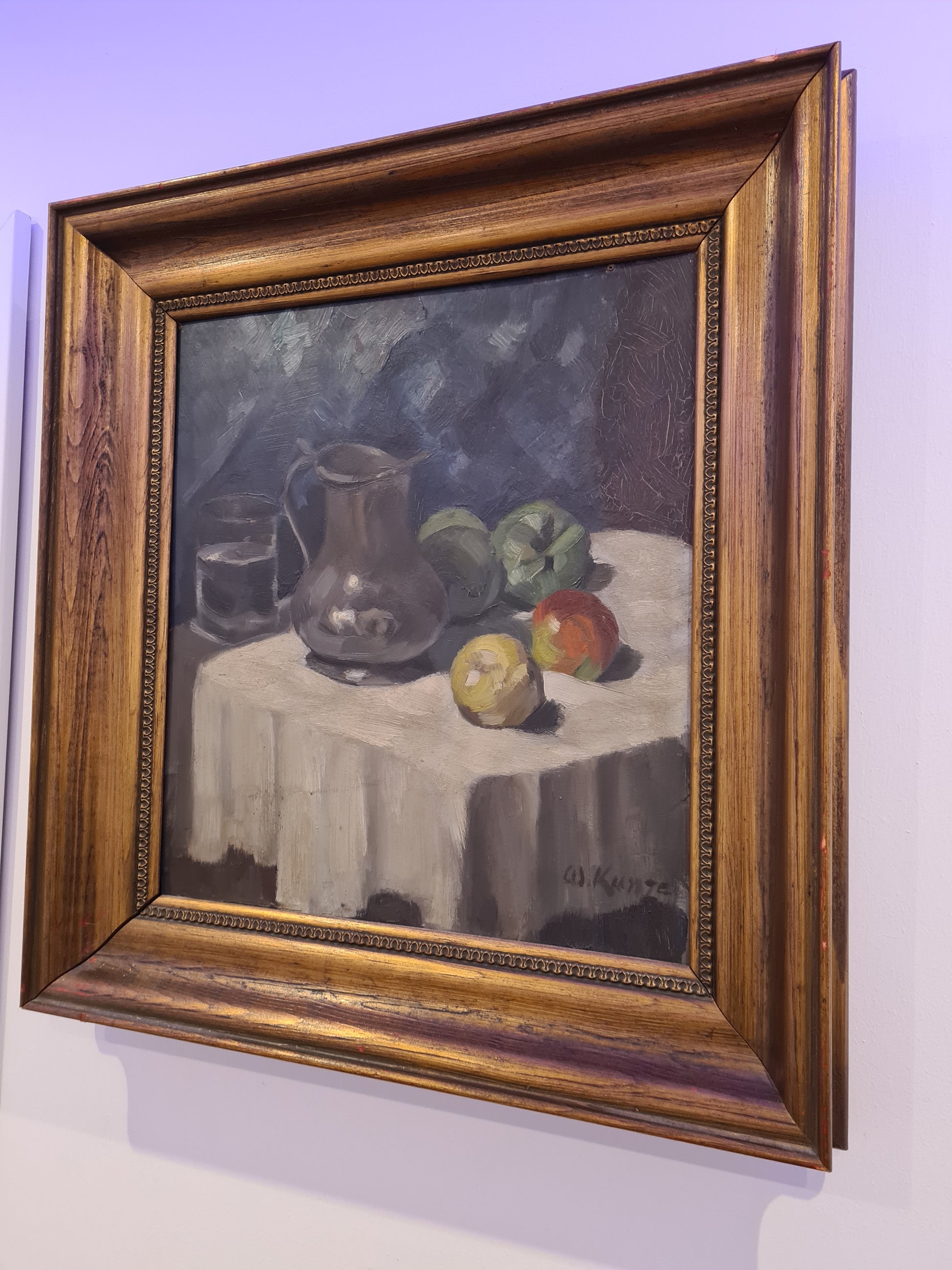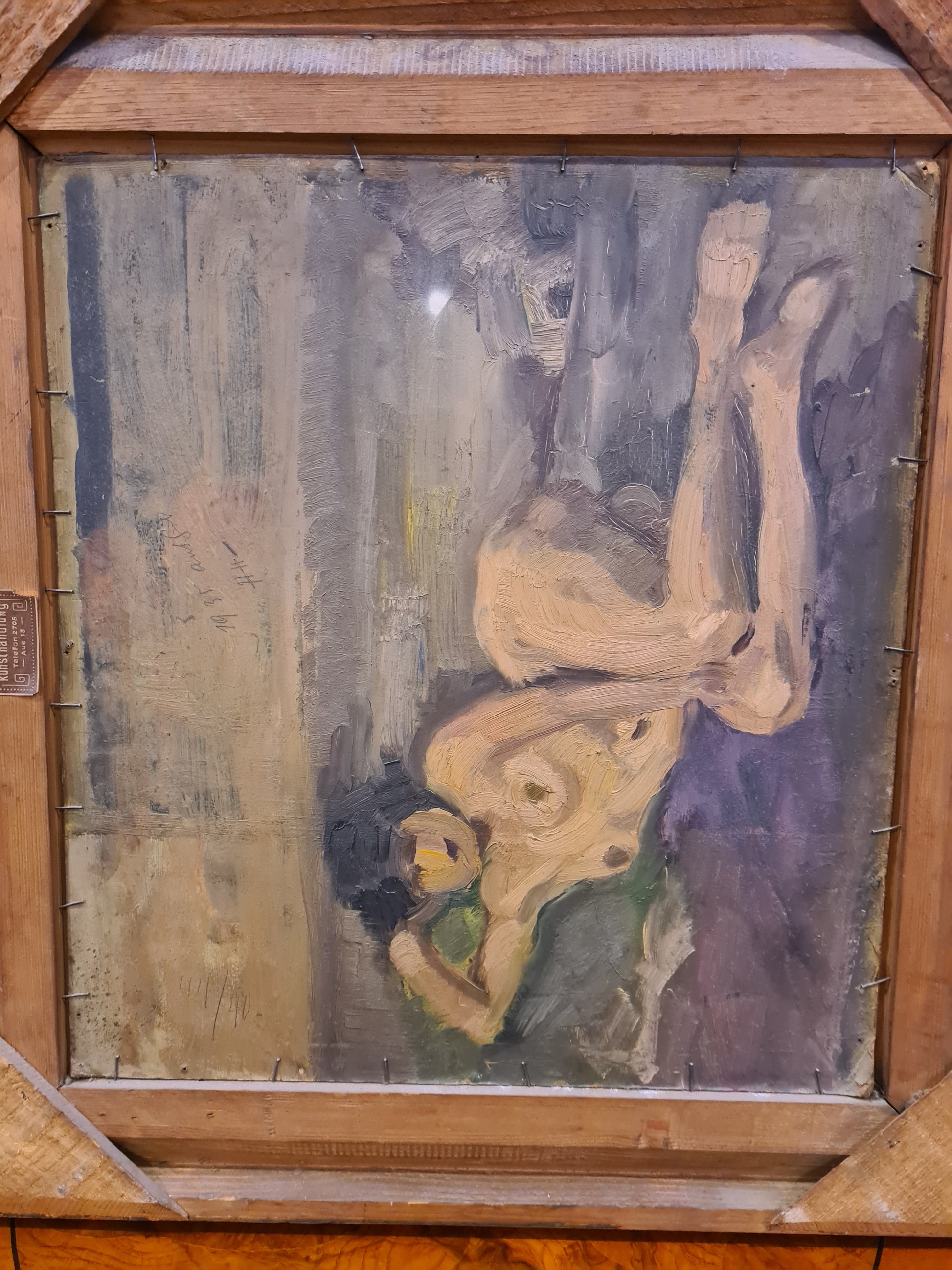 angeboten wird ein signiertes Ölgemälde auf Holz mit Stillleben und Akt, beidseitig bemalt und gerahmt – ein einzigartiges Kunstwerk.